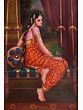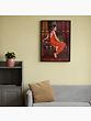 This luxuriant oil from the Exotic India collection is layered with visual tonalities that are bound to engage all who gaze upon it. A pensive, almost sombre lady rests on the palace swing, her troubled gaze directed ahead of her but at nothing in particular. Her attire betrays both her wealth and her youth - warm orange saree teamed with a delicate pink blouse, brocaded and woven with studded gold booties. The swing in her chamber is just spacious enough to accommodate her petite frame. It is cushioned with luxurious green velvet and brocade, the bolster she rests her arm on in a matching dusky blue and gold. Thick brass chains, punctuated by ornate motifs, hold the swing in place.