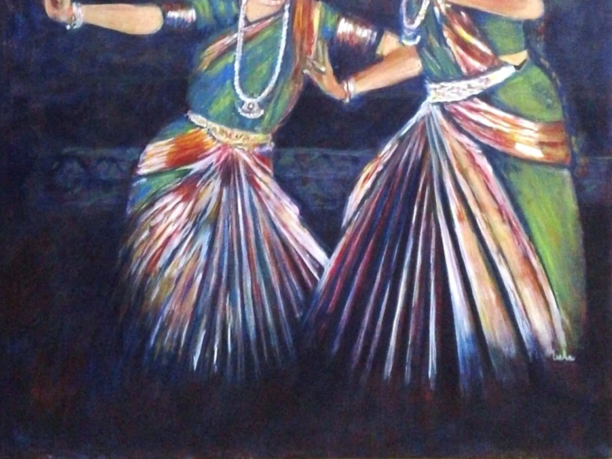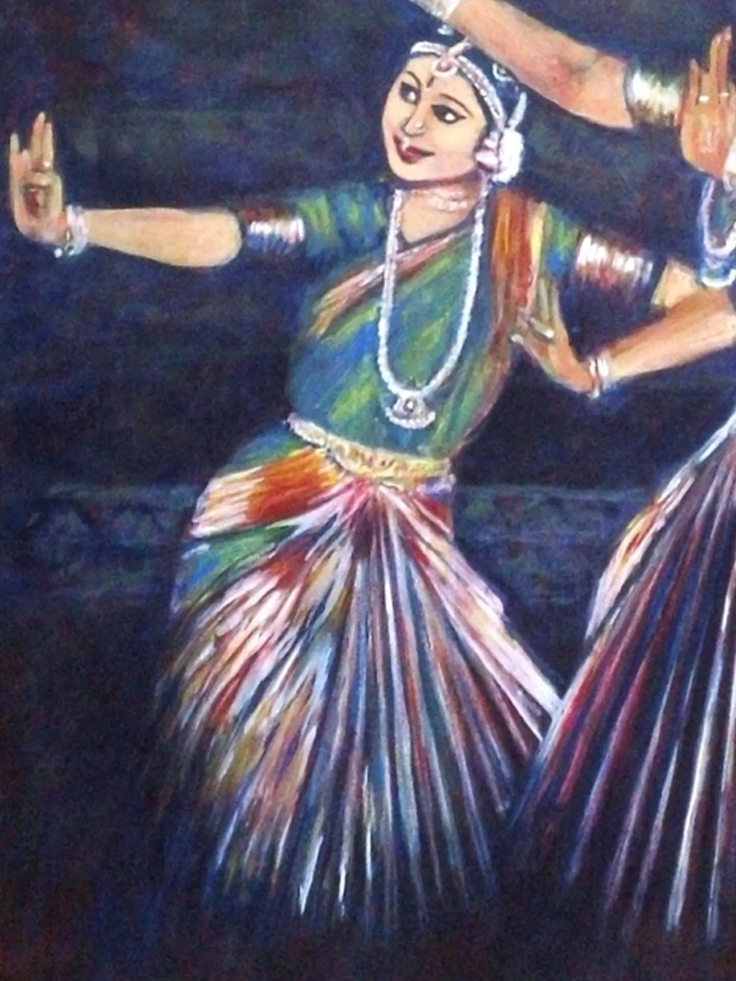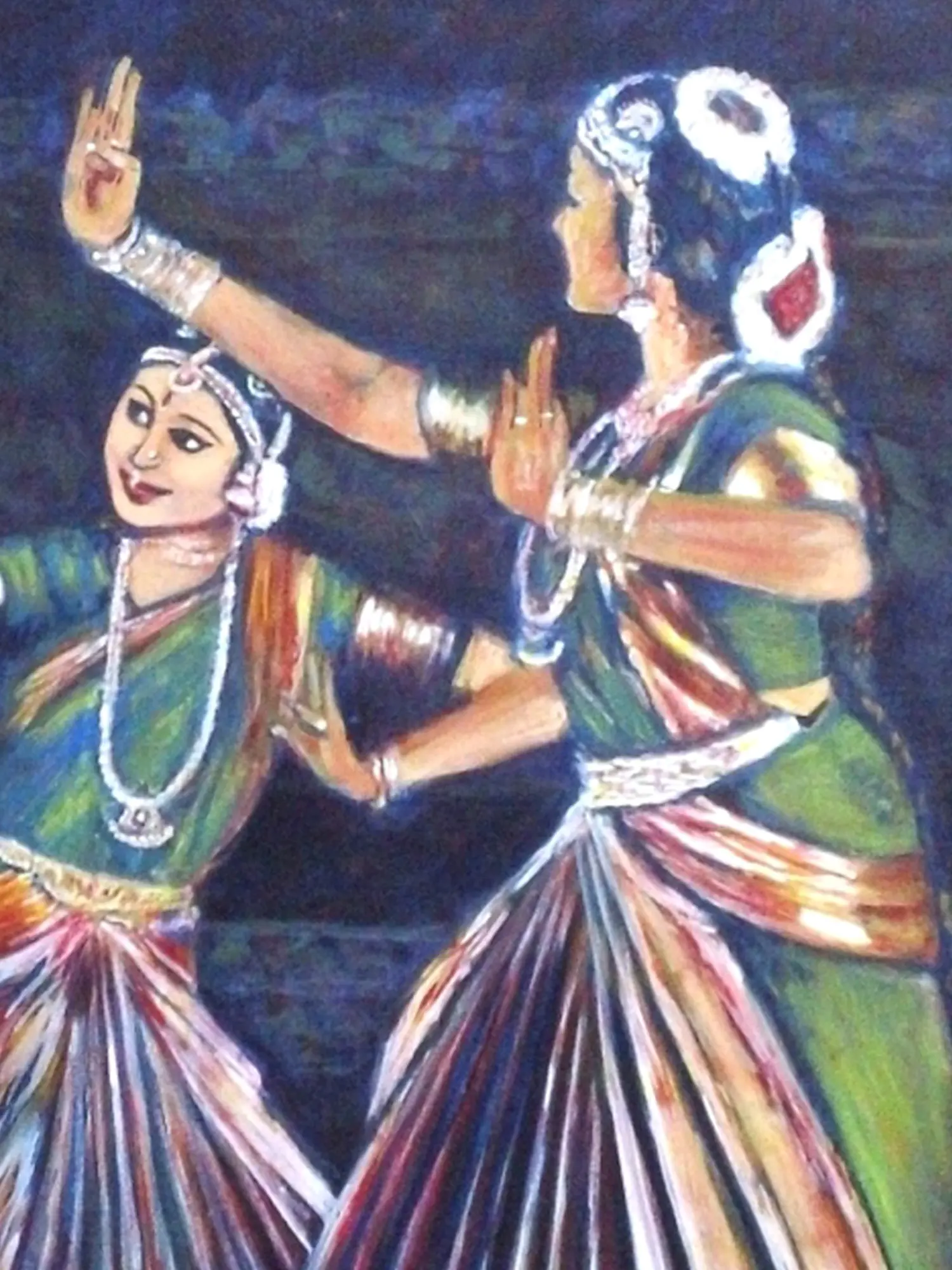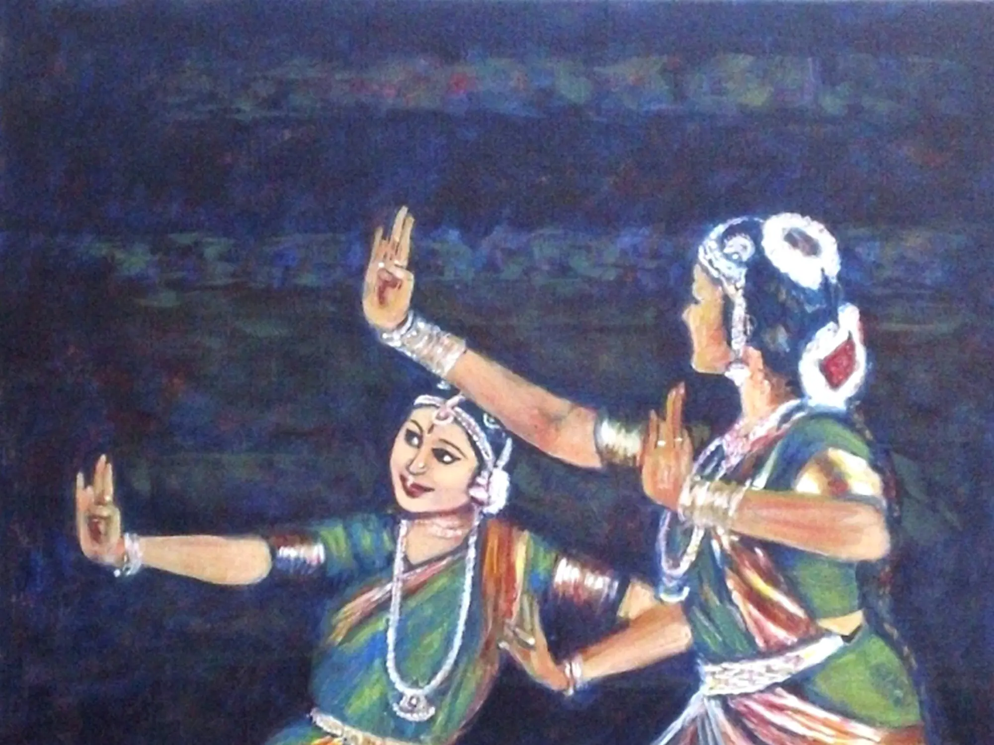 Immerse yourself in the vibrant narrative of classical Indian dance, beautifully rendered in a captivating canvas that tells a story of movement and devotion. You'll feel the rhythm and spirit of a performance come alive, bringing an element of profound cultural expression into your personal space. This artwork invites you to connect with a rich tradition, captured with an artist's keen eye and sensitive touch.