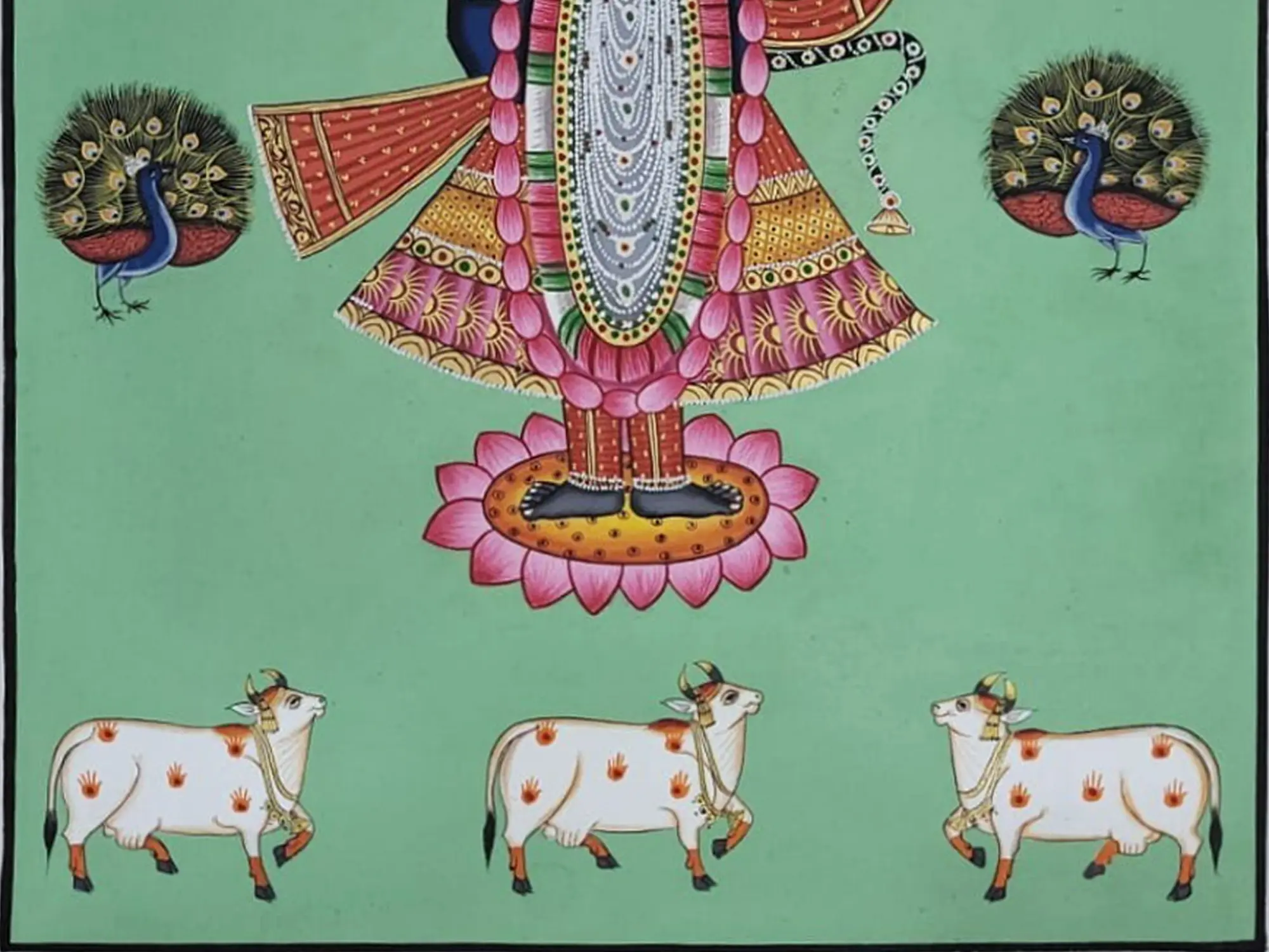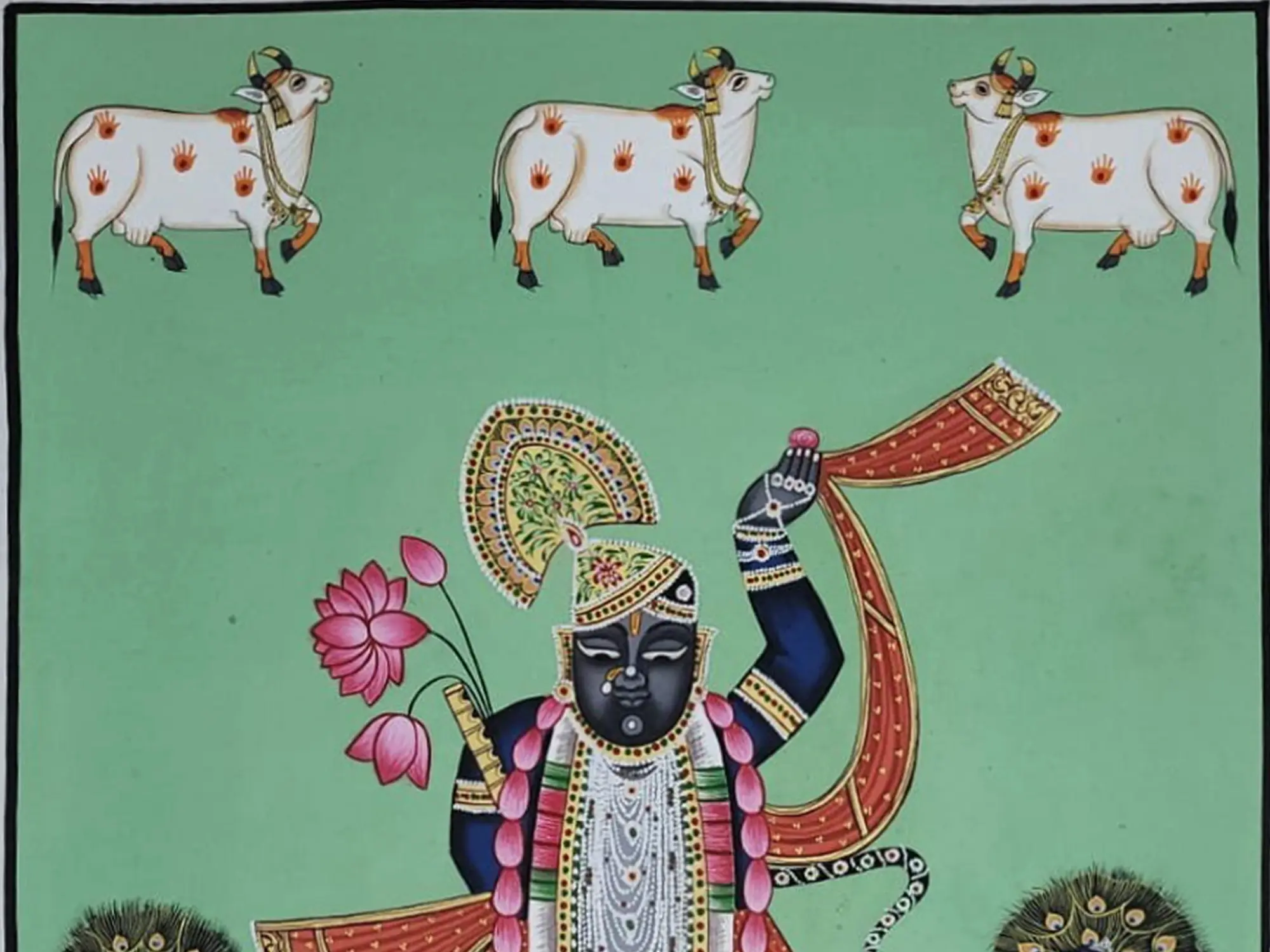 In this captivating Pichhwai Art, Swami Vitthala stands as the embodiment of divine love and compassion, his presence suffused with the radiant light of devotion and faith. Adorned with traditional attire and sacred symbols, Swami Vitthala's divine form resonates with timeless grace and eternal wisdom. The artwork captures the essence of Bhakti tradition, inviting viewers to embark on a spiritual journey of self-discovery and devotion. This Pichwai transcends a portal to the realm of the divine, where seekers can find solace and inspiration.