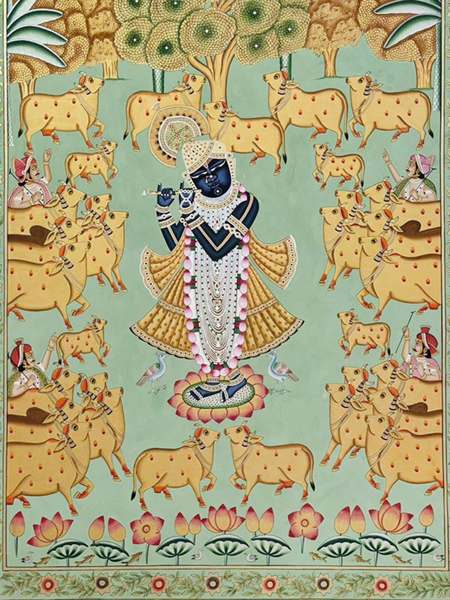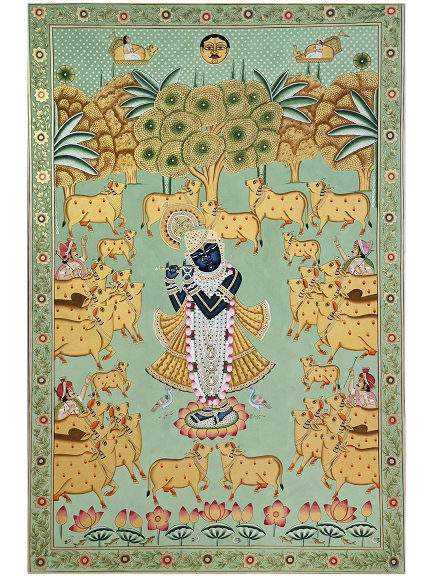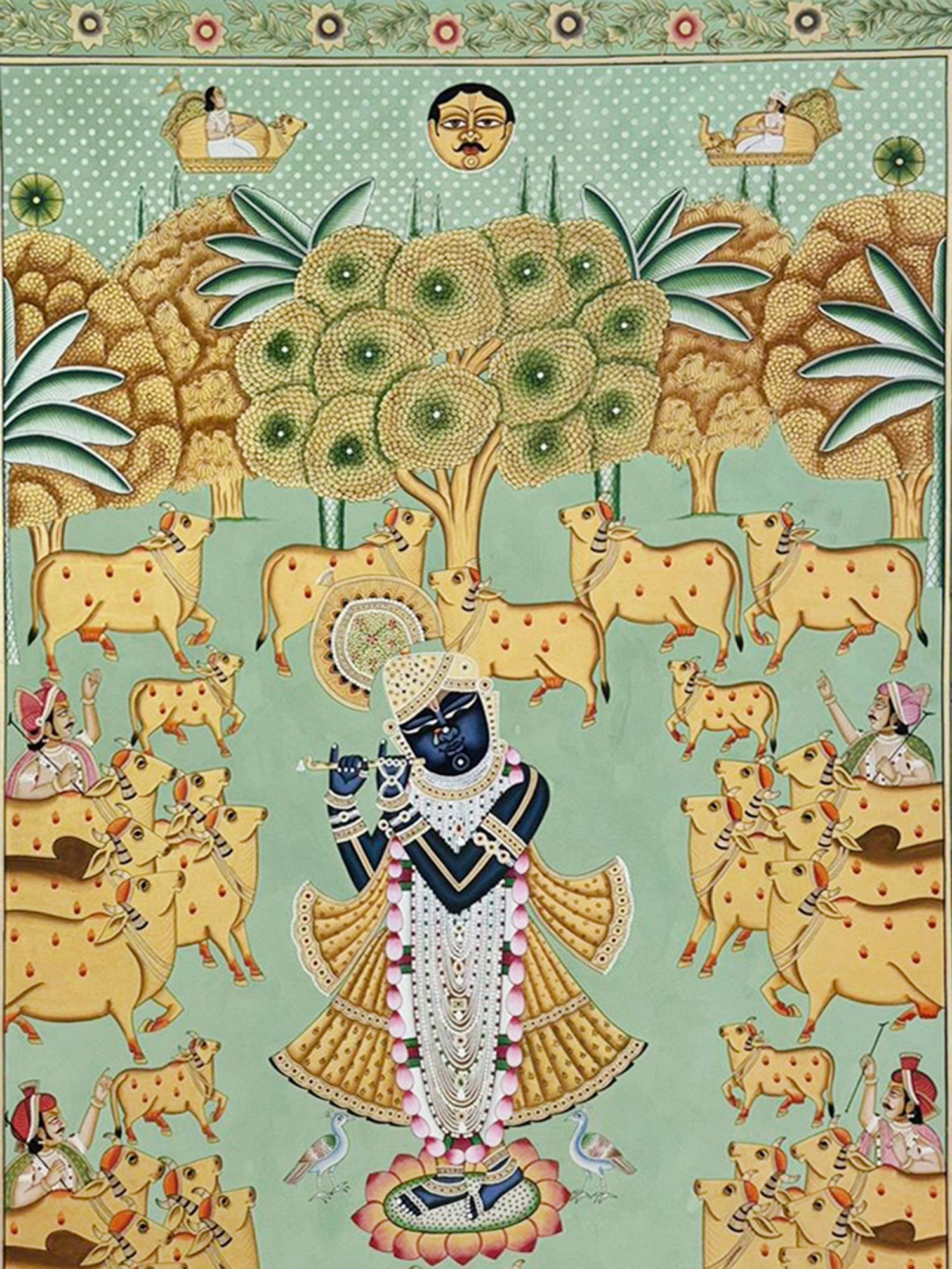 Depicts Shrinathji surrounded by cows and musicians, evoking a pastoral and divine scene.