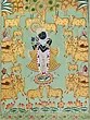 Showcases the traditional Pichwai style of painting, known for its intricate details and vibrant colors.