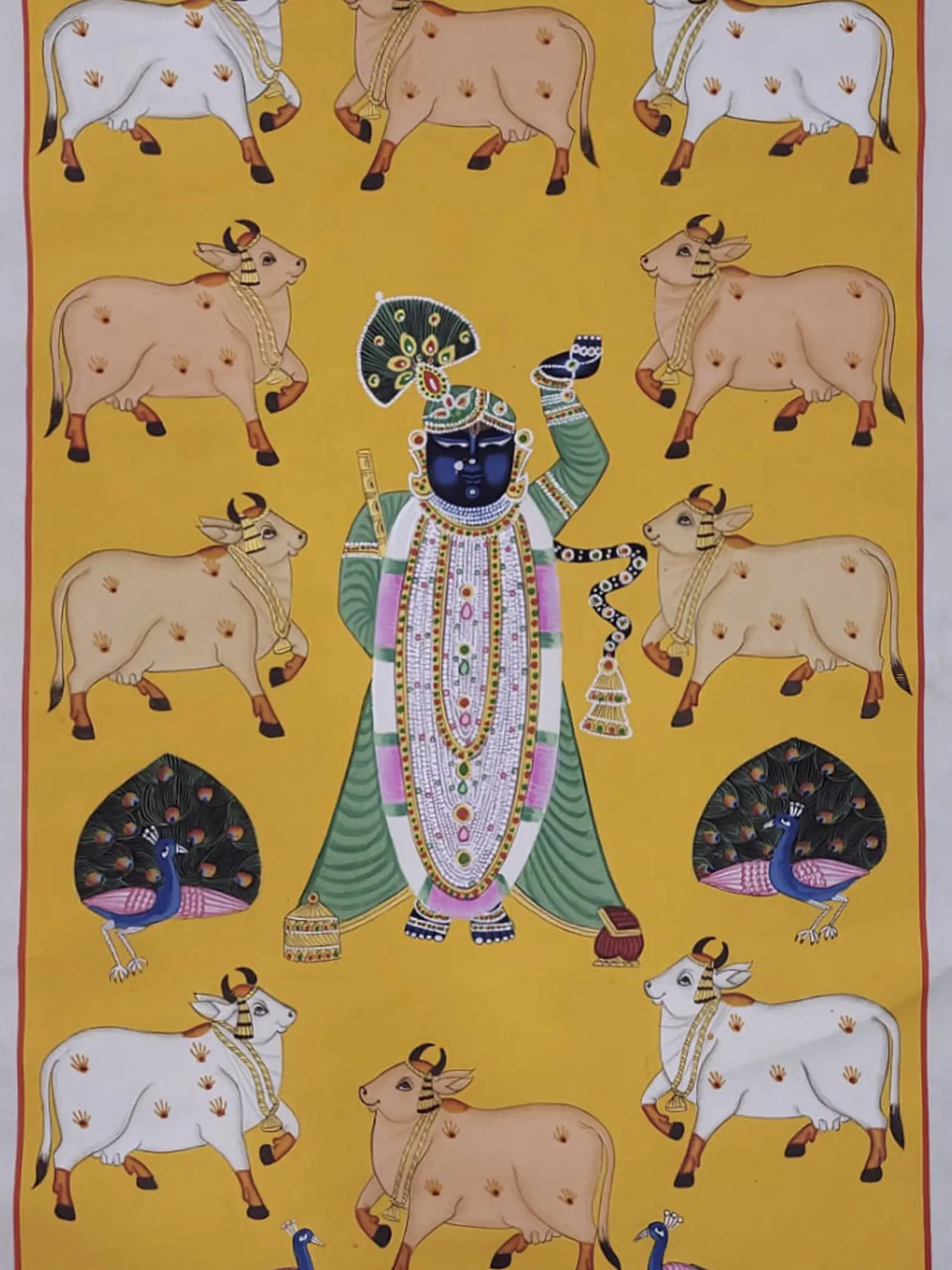 In this exquisite Pichwai painting, Shrinathji emerges as the revered state deity, enveloped in celestial grace. Crafted with natural colours on cloth, the artwork emanates a palpable sense of sacredness and reverence. Every detail, from Shrinathji's resplendent attire to the intricate motifs adorning the background, speaks of devotion. The painting transports viewers to the sacred precincts of the temple, where the divine presence of Shrinathji illuminates the hearts of devotees.