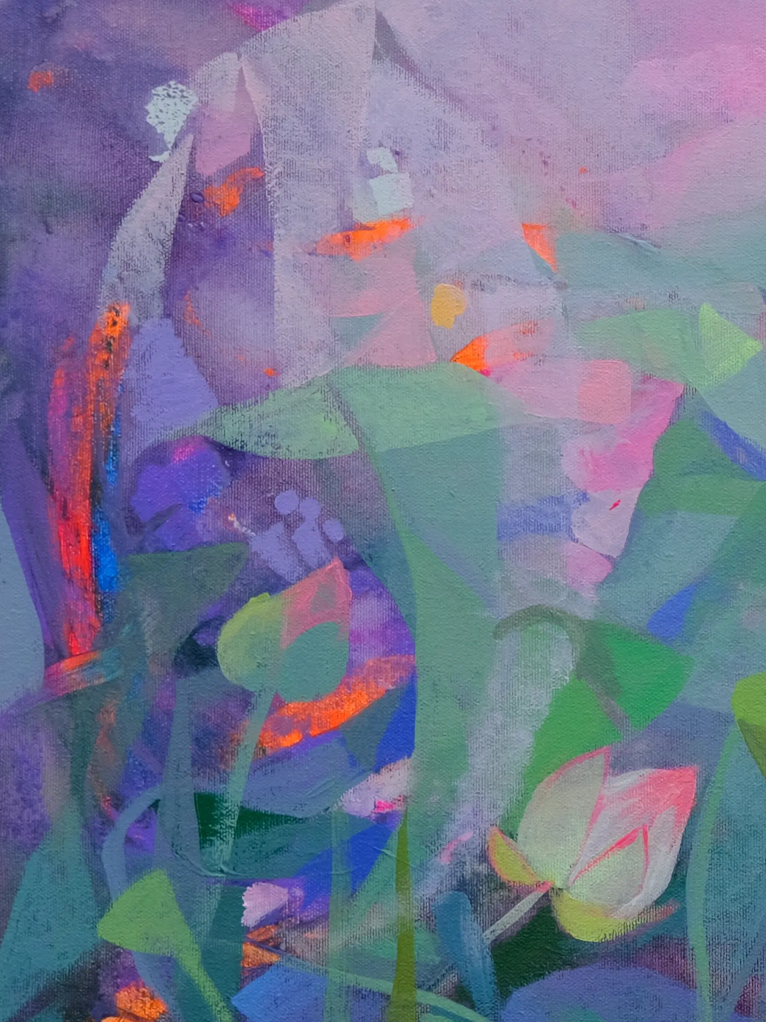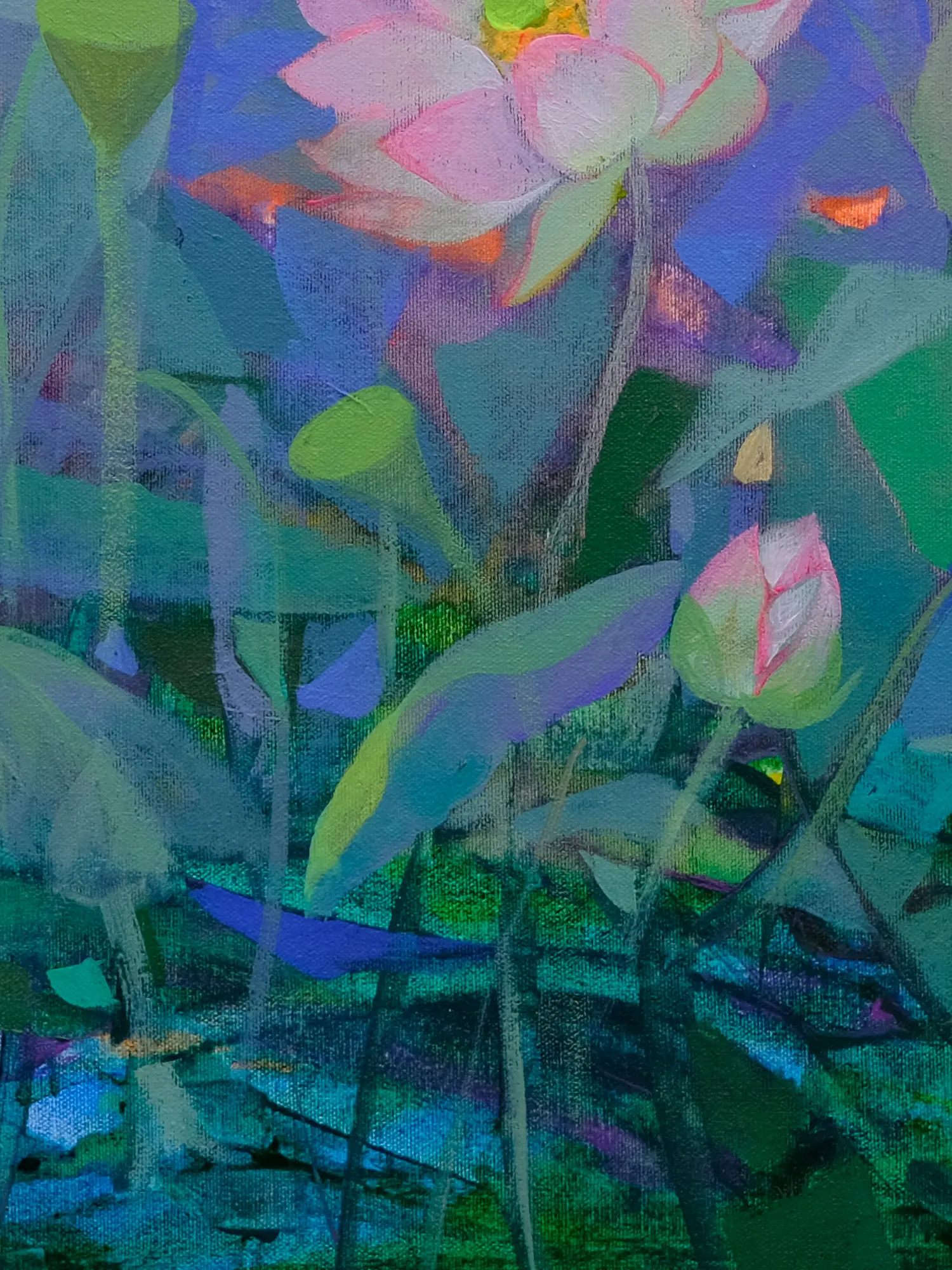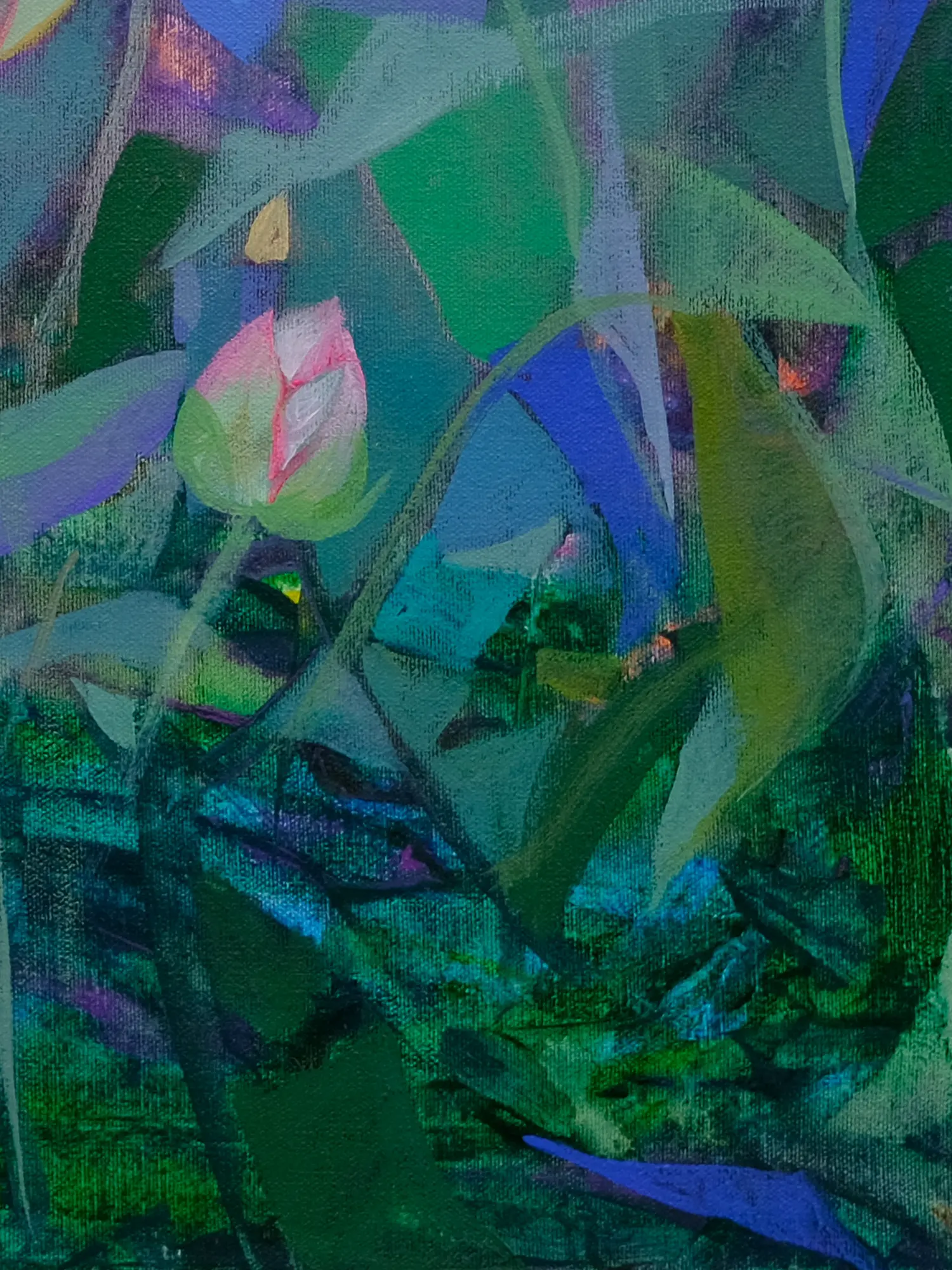 Sumita Maity's artistic style is characterized by its expressive use of color and texture. The artist expertly blends shades of pink, green, and purple to create a sense of depth and movement, mirroring the natural flow of the water and the gentle sway of the lotus stems. The leaves are not rendered in meticulous detail, but rather with expressive brushstrokes which imbue the work with a distinct sense of energy. This dynamic approach avoids rigid realism, opting instead to capture the essence and feeling of the scene, creating a vibrant and emotive piece of art. The interplay of light and shadow further enhances the painting's three-dimensionality and adds another layer to the overall impact of the piece. Acrylic paint is used on canvas, a resilient and vibrant medium which ensures the painting's colors will maintain their luminosity and depth for many years to come.