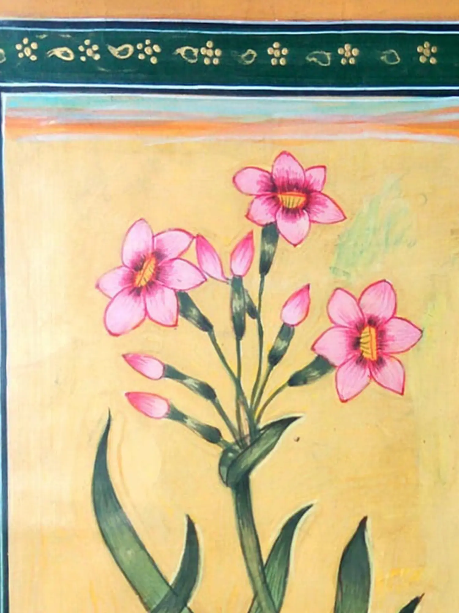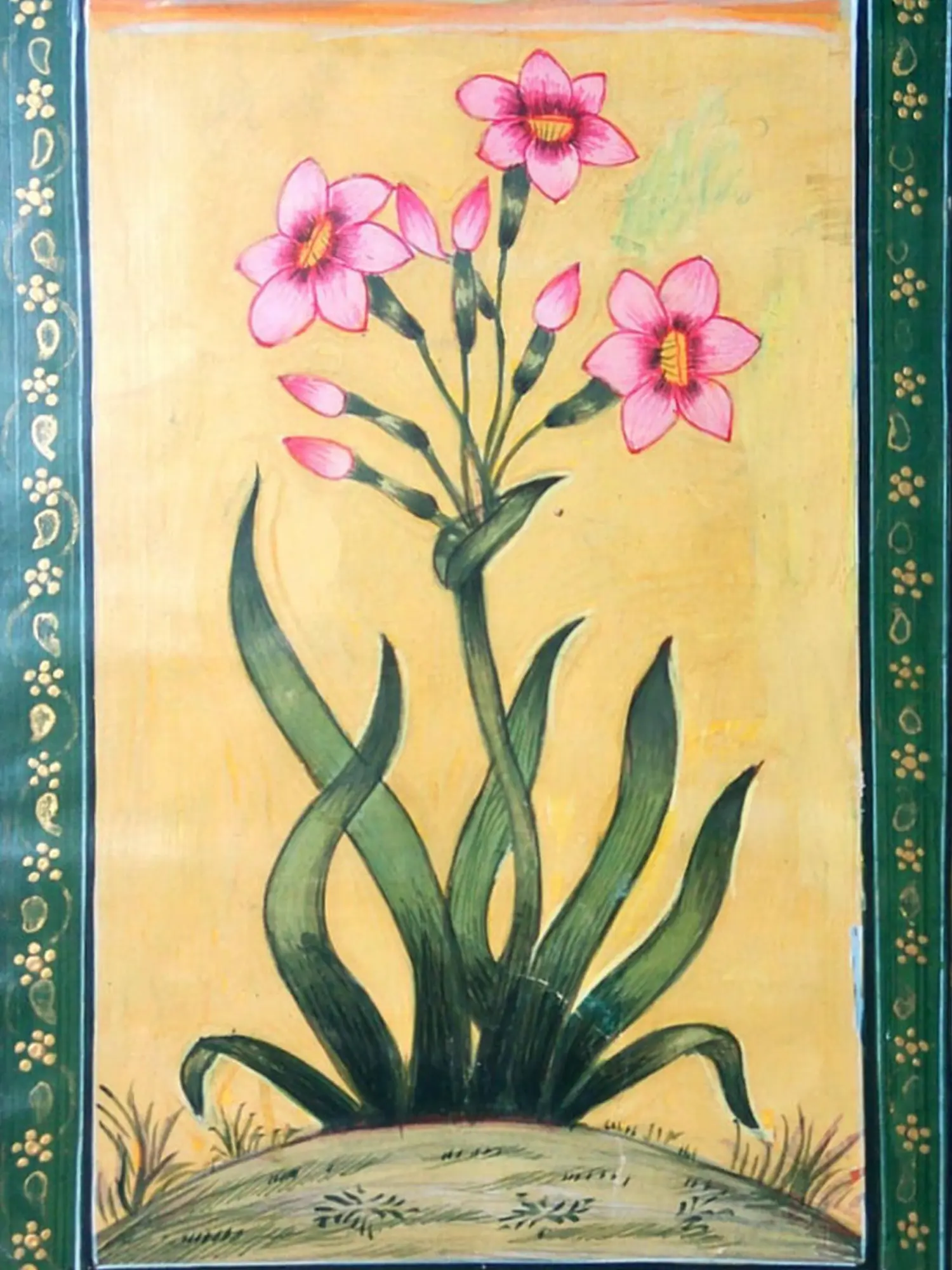 The subject matter bursts forth from the page, with vibrant pink tulips unfurling their petals against a soft, golden background. Observe the elegant curves of the green stems and leaves, rendered with a naturalistic yet stylized flourish. The carefully detailed border frames the central composition, adding a refined touch that enhances its overall appeal. The 8.00-inch height and 5.60-inch width create a balanced and inviting visual presence.