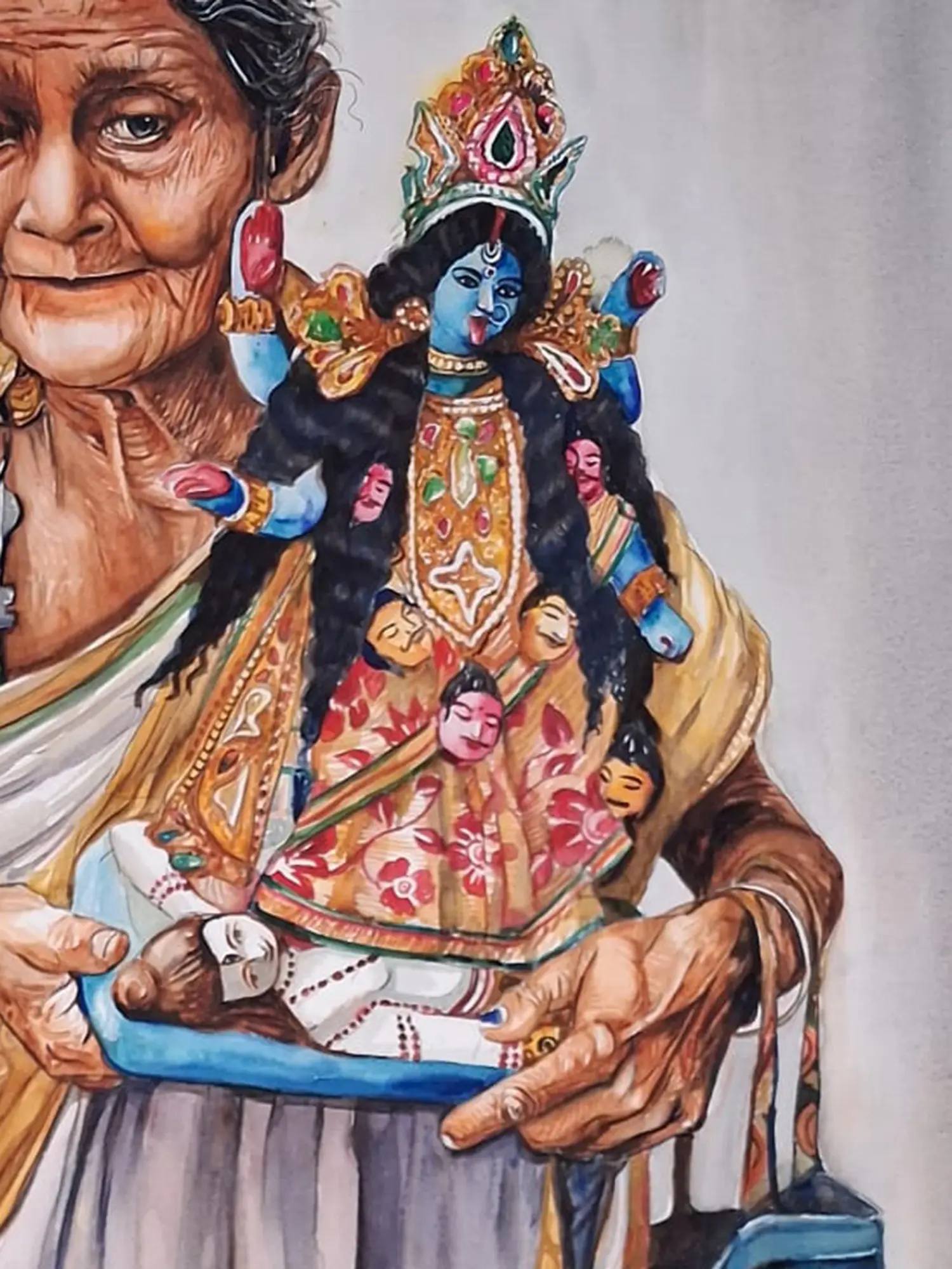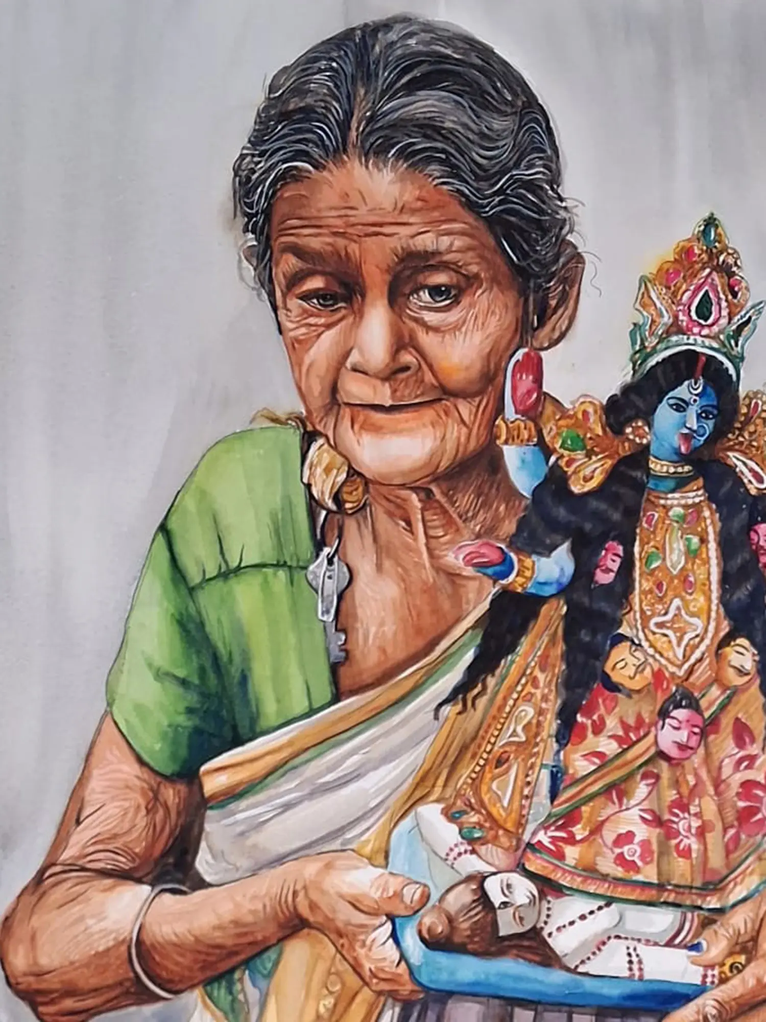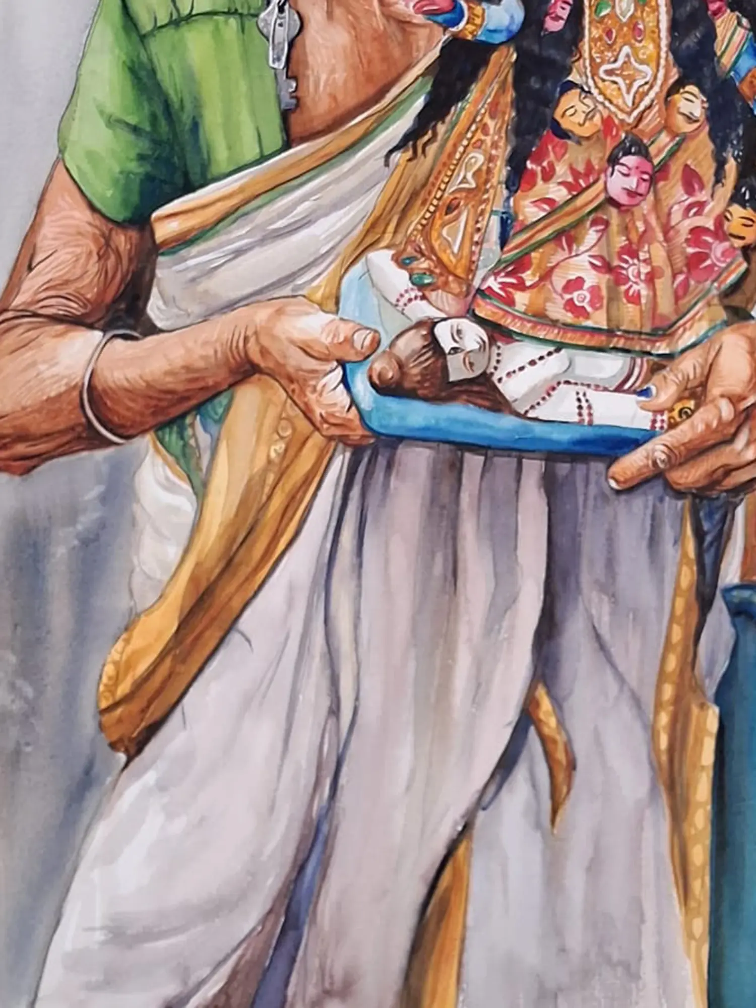 Priya Ghosh’s meticulous artistry shines through every stroke, transforming simple watercolour on paper into a narrative of deep reverence. Each crease on the devotee’s face, each fold of her garments, and the intricate details of the deity are rendered with extraordinary sensitivity and skill. The artist’s ability to infuse such palpable emotion and texture into this medium speaks volumes of her profound talent.
