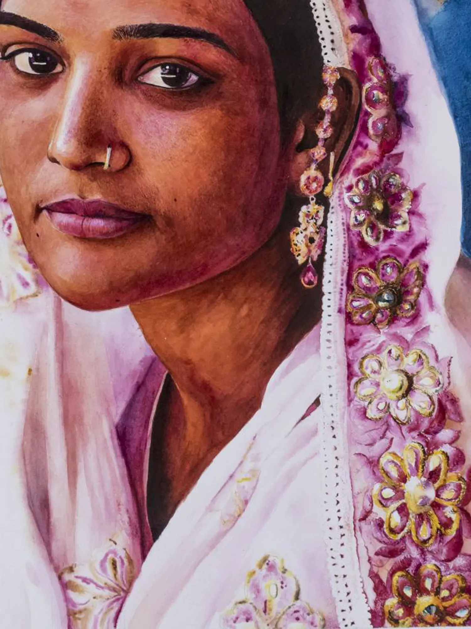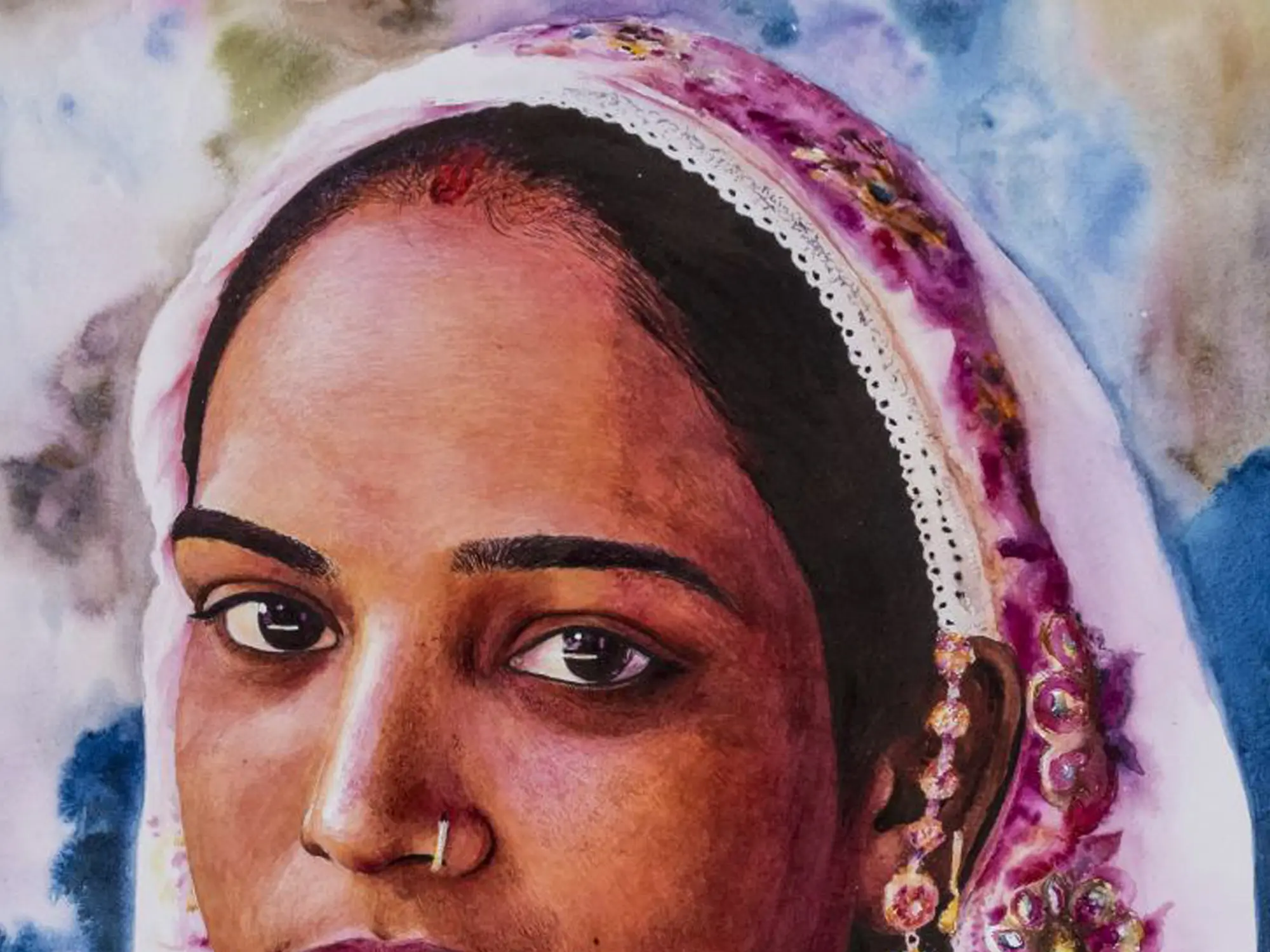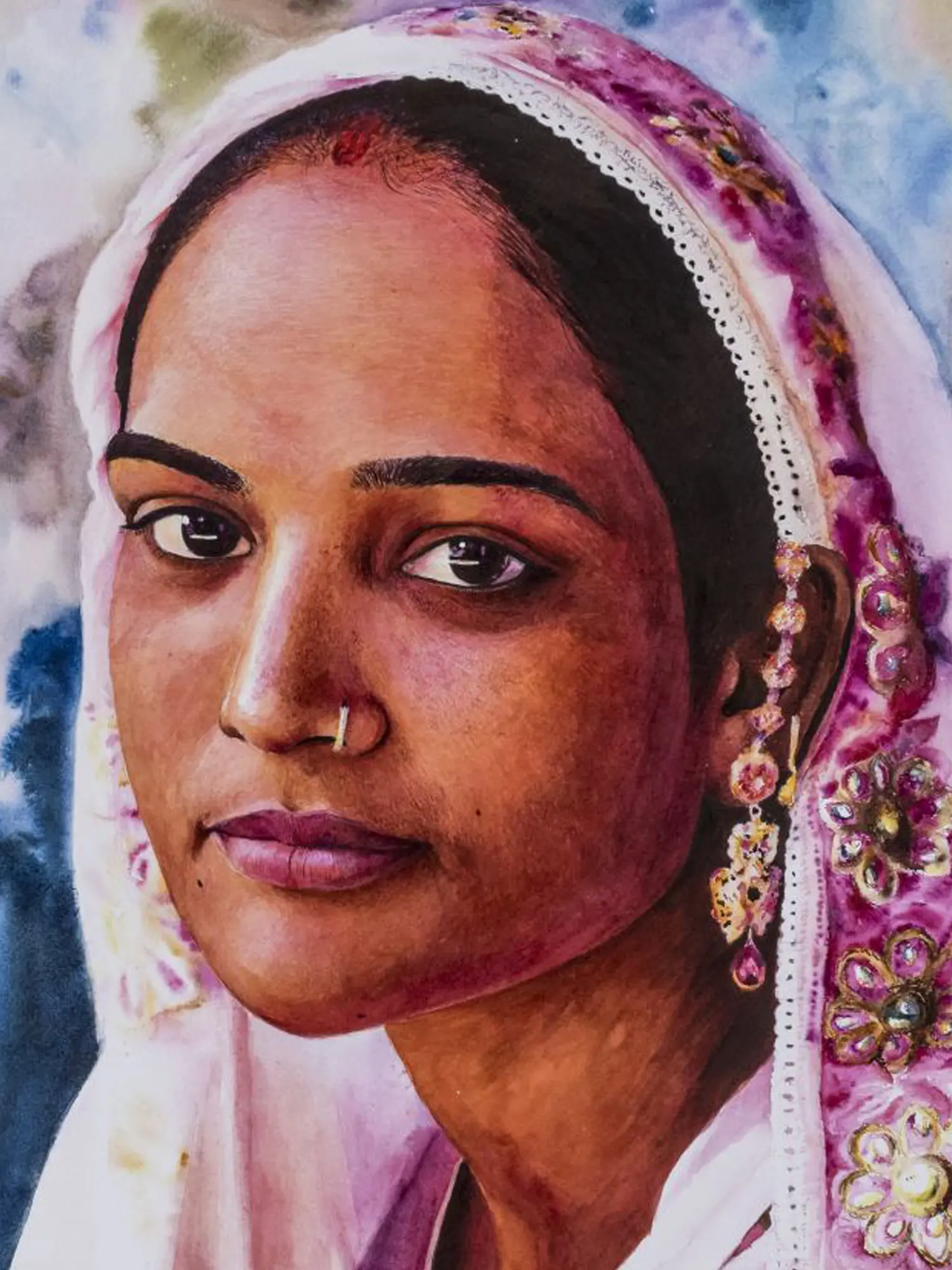 In the Portrait of this Lohar woman from Haryana, the artist masterfully captures the essence of Haryana's rich cultural heritage and the strength inherent in its women. Adorned in tradition - she is reflecting the Lohar community's customs, the woman emanates a quiet dignity and resilience, from the vibrant colours of her clothing to the ornate jewellery adorning her persona; her expression reflects a depth of character and experience, embodying the spirit of perseverance that defines the Lohar community.