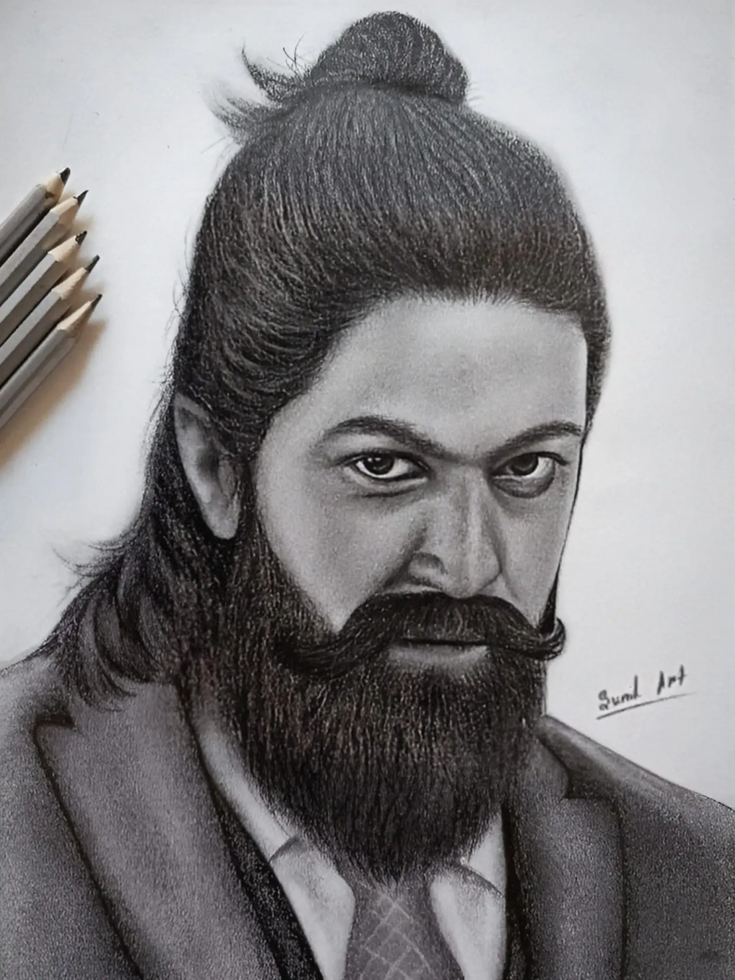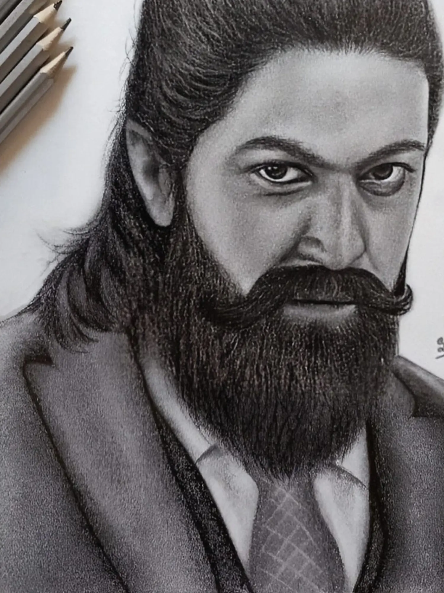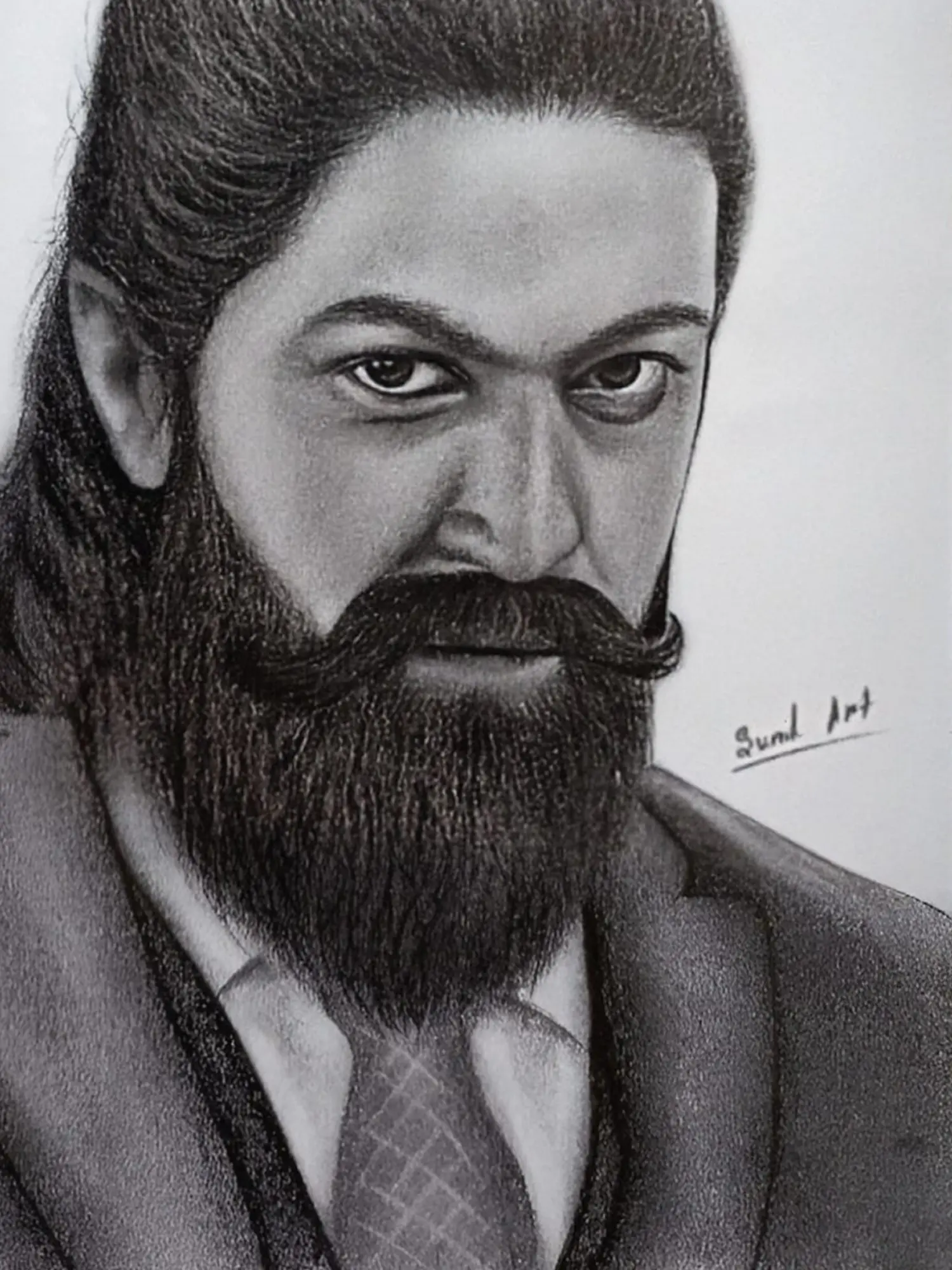 With striking detail, the graphite portrait of Yash's character from KGF captures the rugged intensity and charisma of the iconic protagonist. Each stroke reflects the enigmatic allure - inviting them to explore the depths of heroism and redemption. Through Yash's steely gaze, observers glimpse the indomitable spirit of the underdog, forging his destiny amidst the chaos of adversity.
