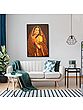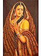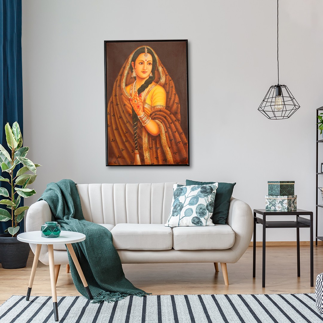 She has the afterglow of wedding haldi (turmeric applied to Indian brides) and tints of henna on her hand to tell the onlooker of the marital bliss that has recently entered her life. A dark chunri (scarf) with leaves (symbols of auspiciousness and fertility) and rich brocade wrap most of her visible body luxuriously. A Mangtika (head ornament), earrings, necklaces, and bangles adorn her youthful form. As if gazing at herself in the mirror to appreciate her womanliness, the lady stands in a stunningly graceful posture.