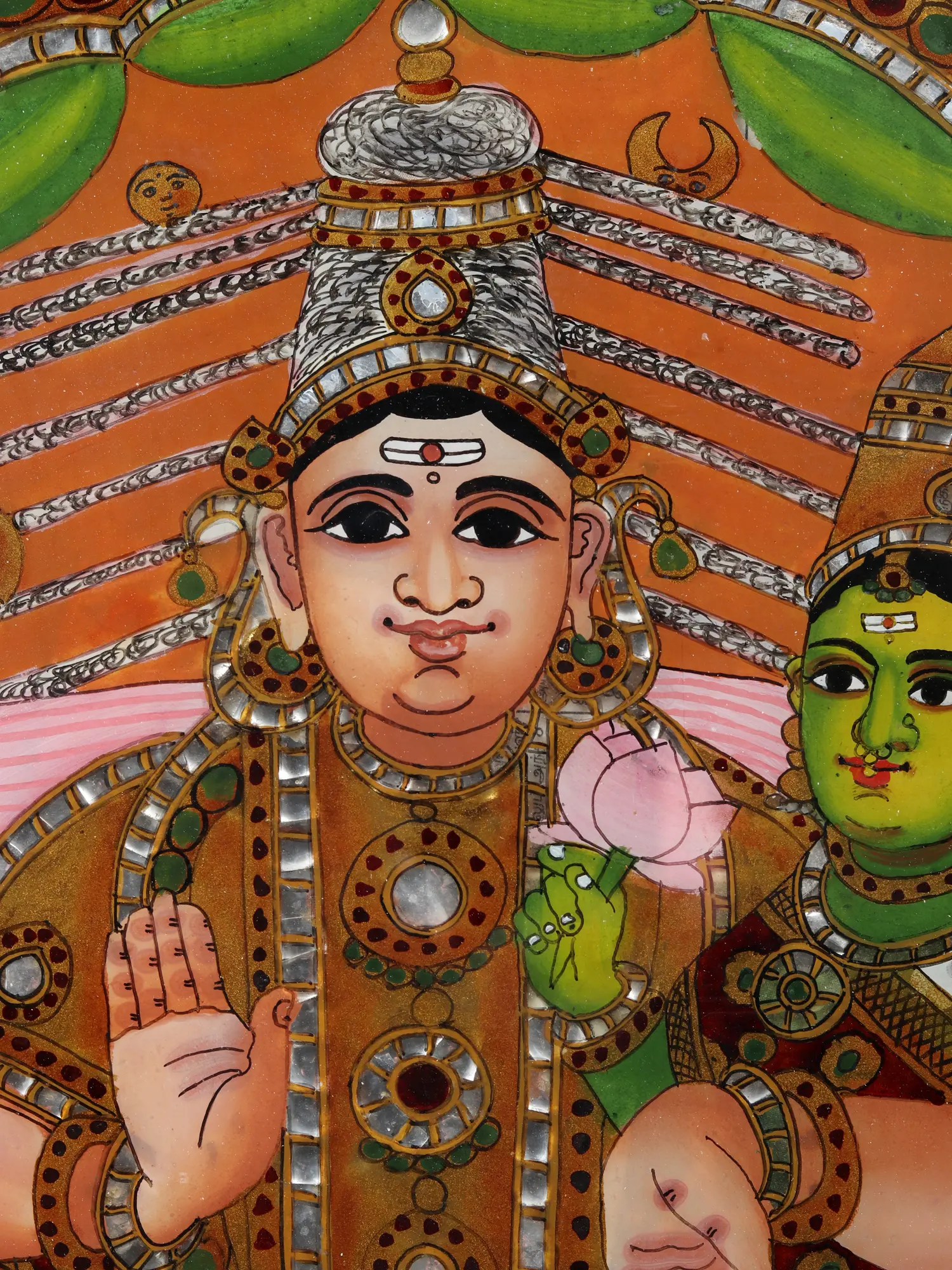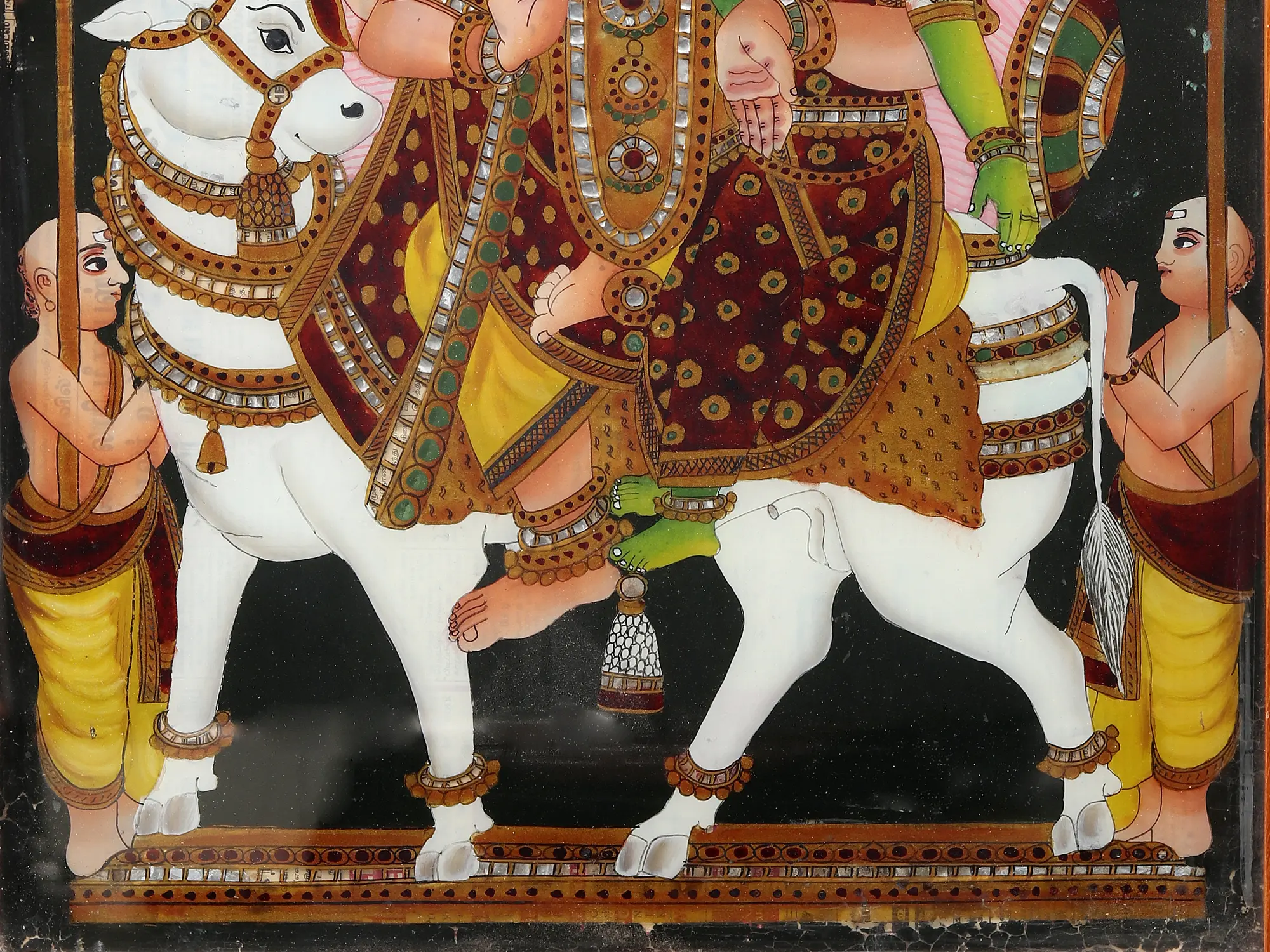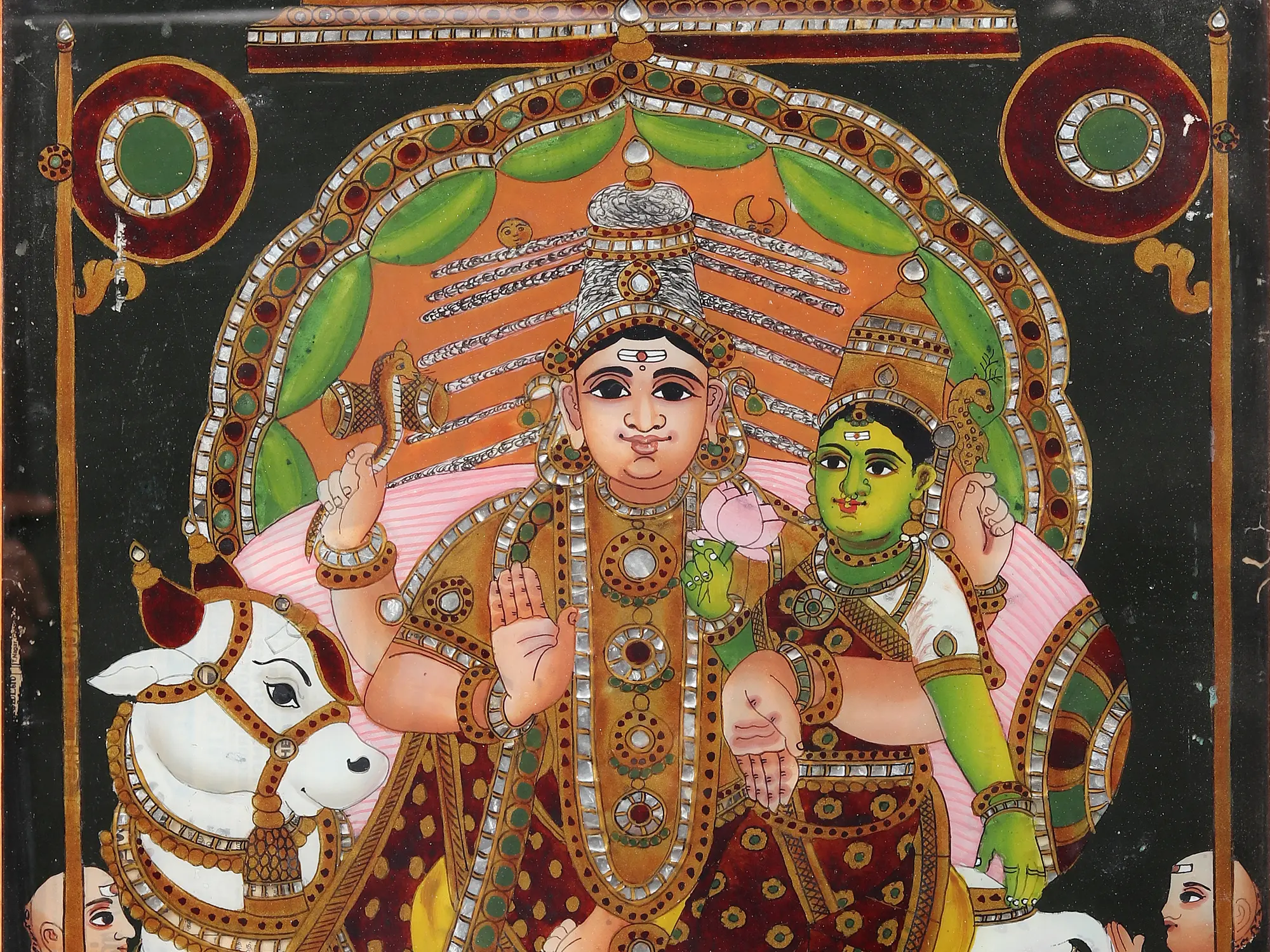 A glimpse into the Kailasha - at the focus of this glass artwork lies the celestial marriage of Lord Shiva and Goddess Parvati—Pradosha Moorthy. Their divine love, portrayed with intricate detailing, epitomises the sacred and wholesome bond between the masculine and the feminine of existence. Flanking the divine couple are two devoted priests, each symbolising the earthly conduits of devotion and ritual. Their hands clasped in reverence, they assist in the sacred ceremony that unites Shiva and Parvati, bridging the mortal and immortal realms.