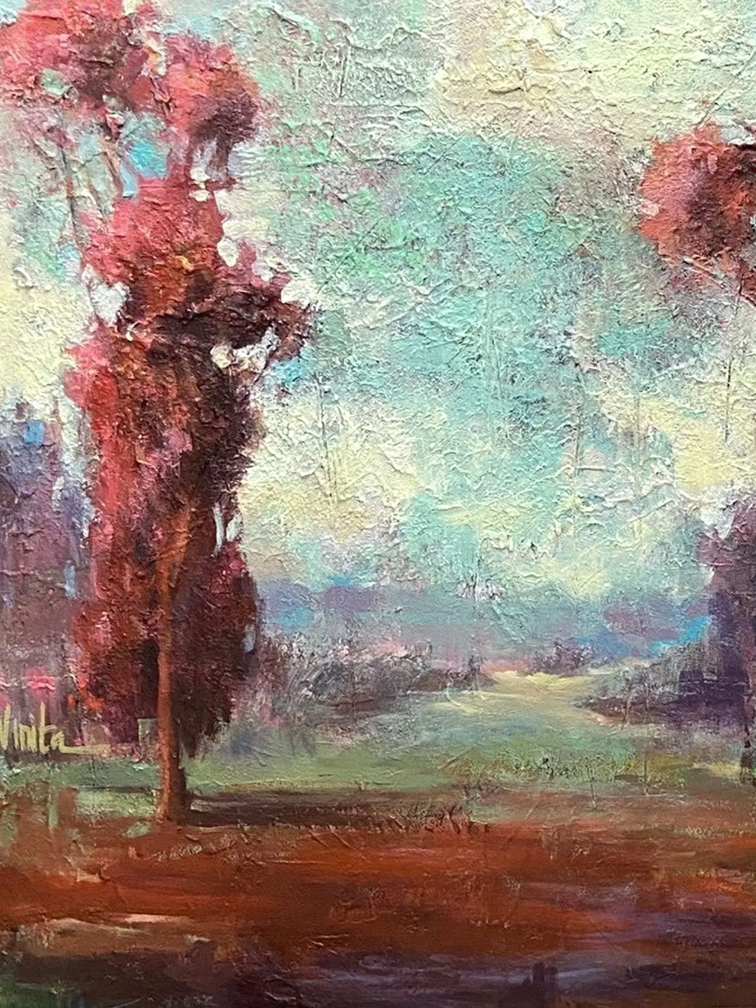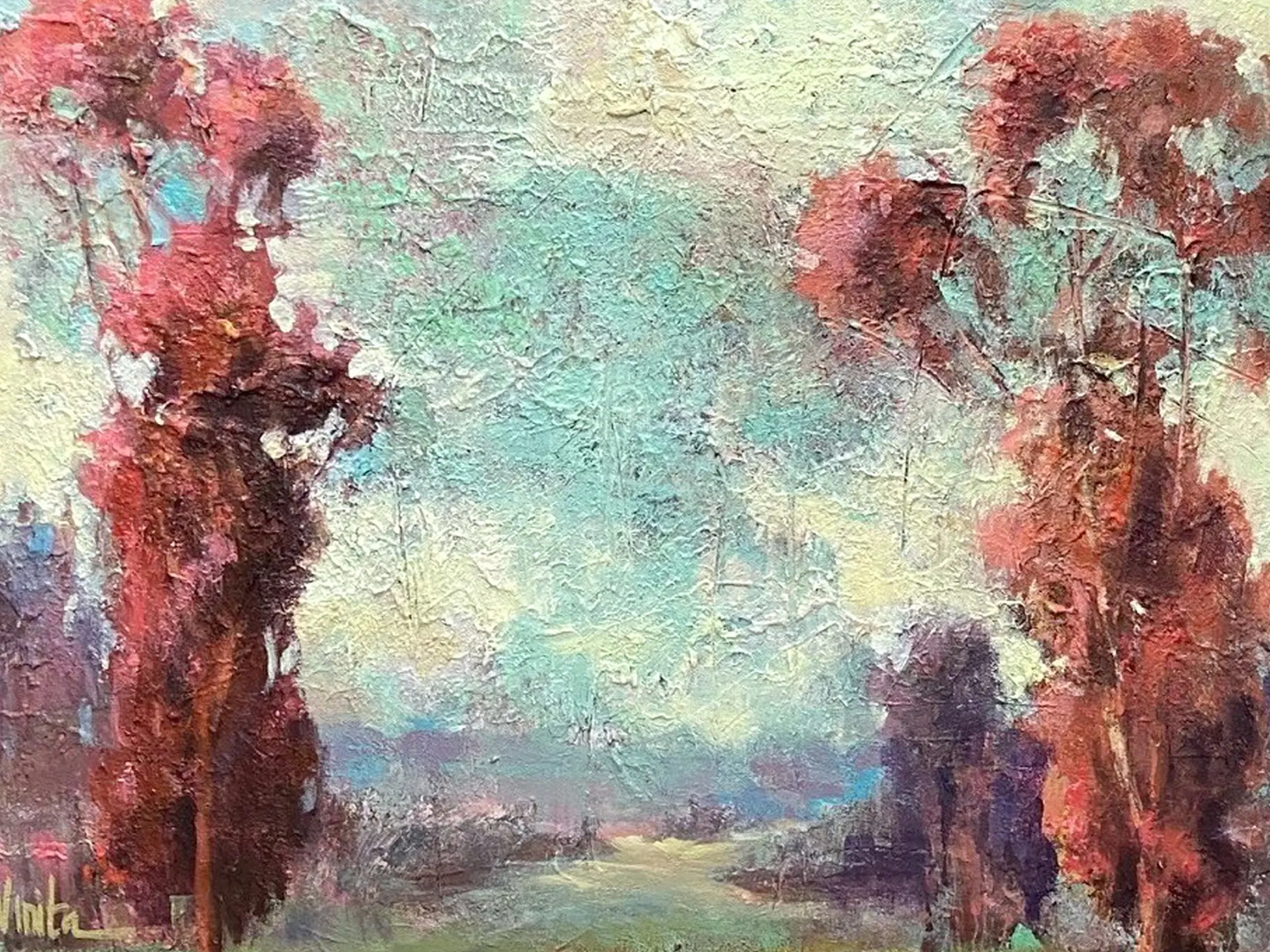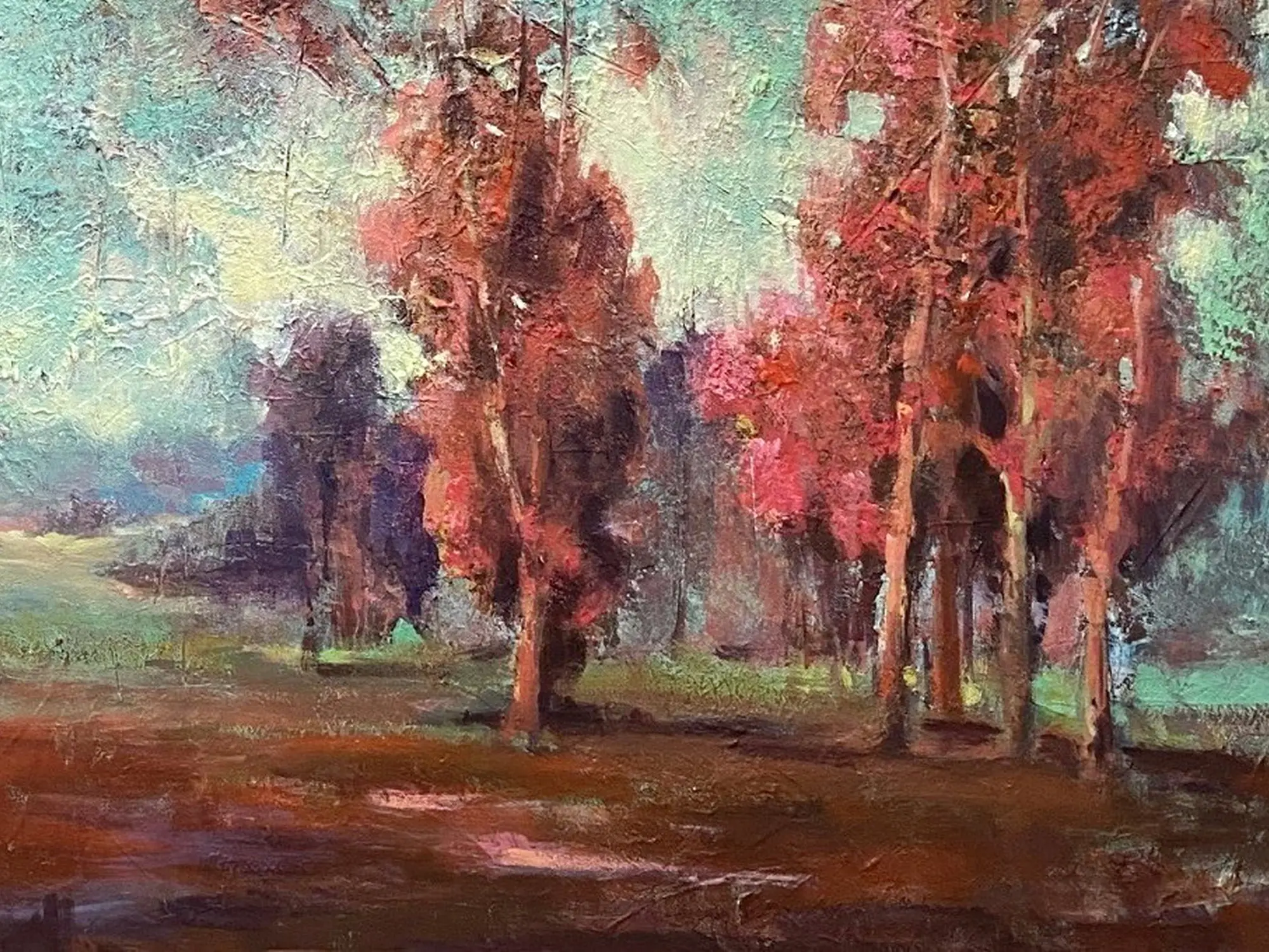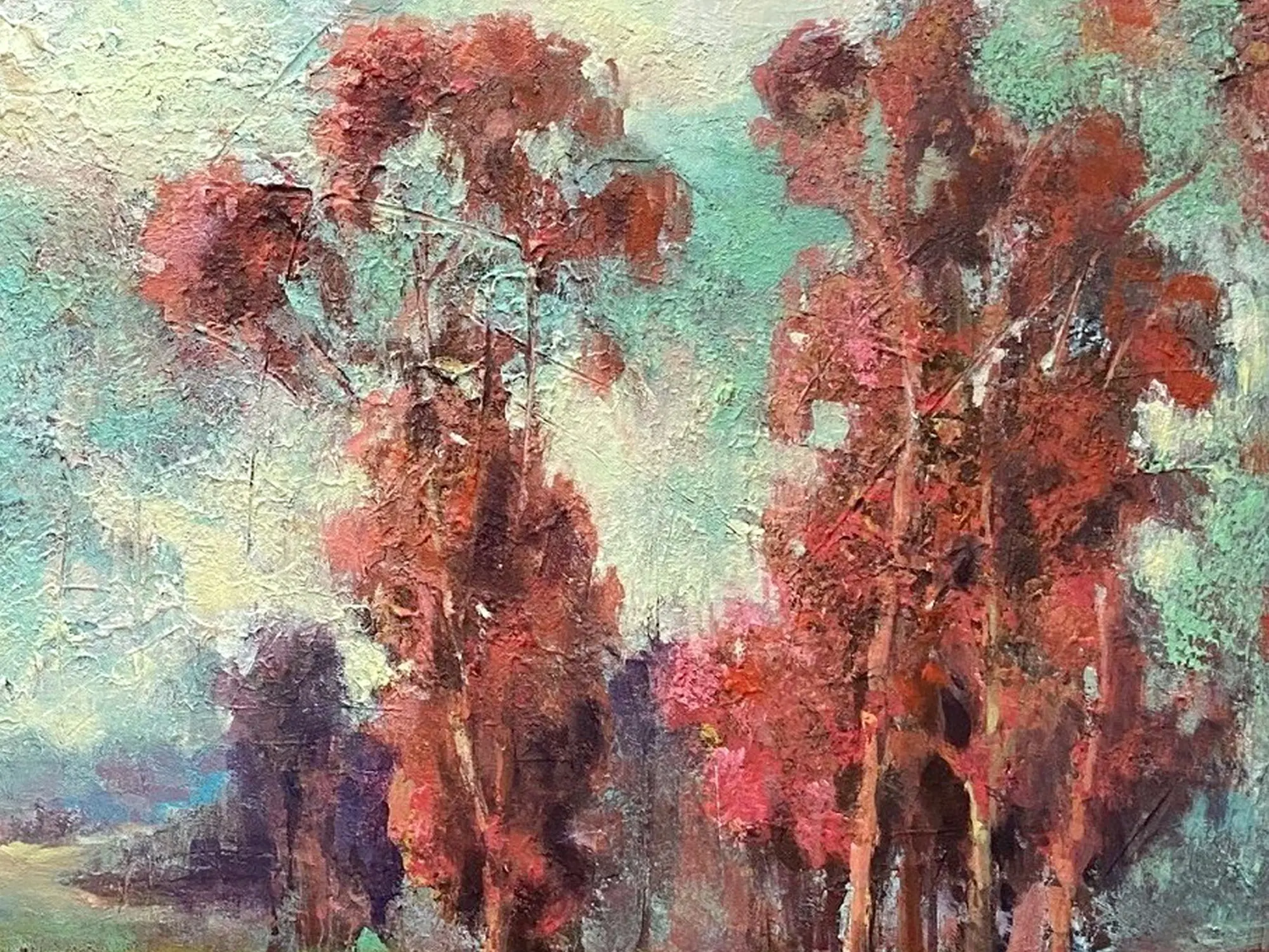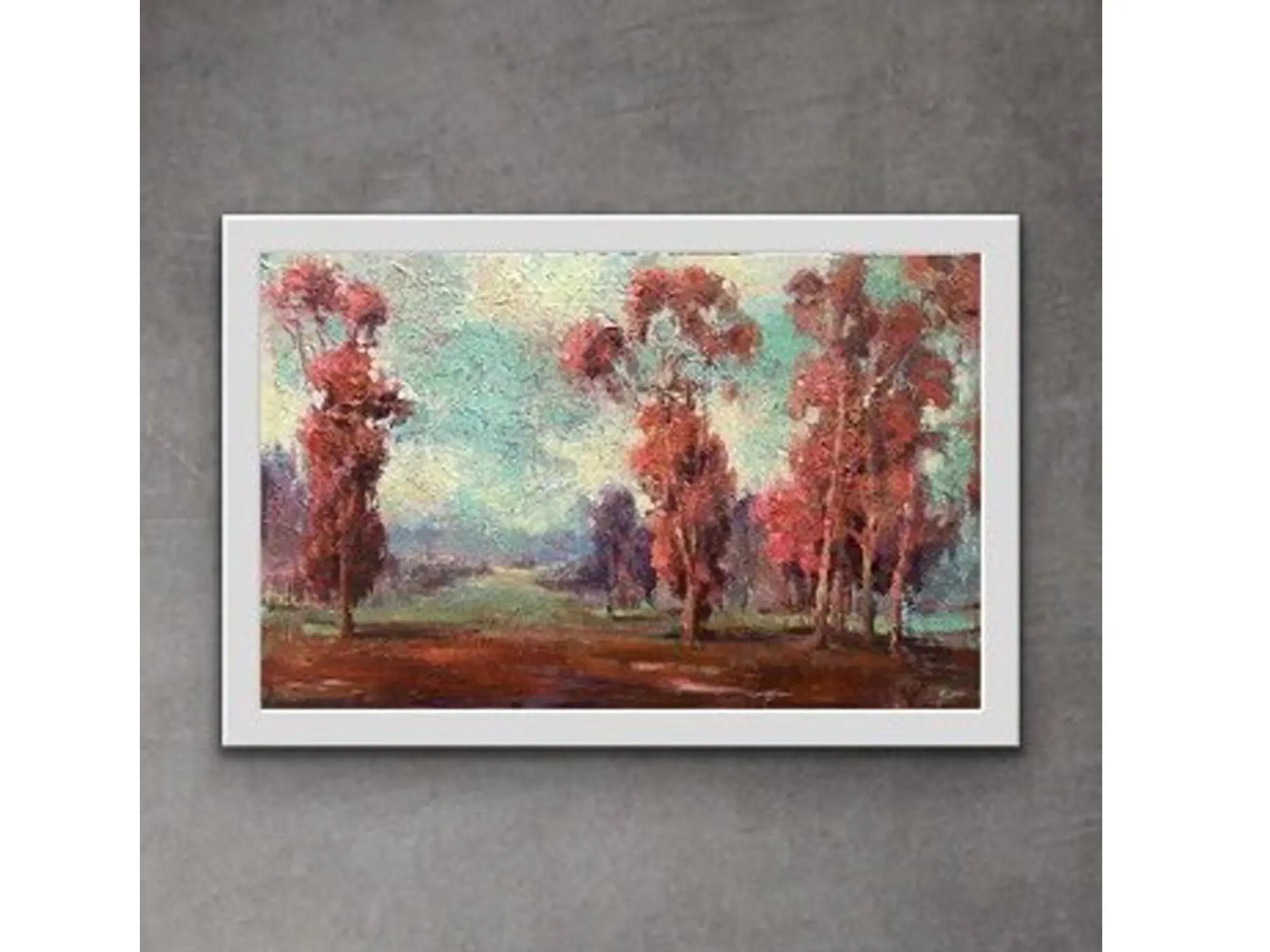 The expansive 36-inch width and 24-inch height provide a generous canvas for this vibrant landscape. You'll appreciate the interplay of earthy ochres and deep reds against a backdrop of ethereal turquoise and subtle lavenders. The textured application of paint, particularly in the sky and foliage, lends a dynamic, almost sculptural quality, ensuring that each viewing reveals new nuances and complexities.