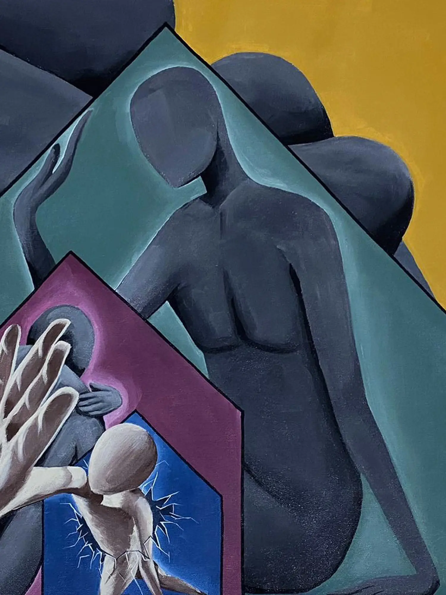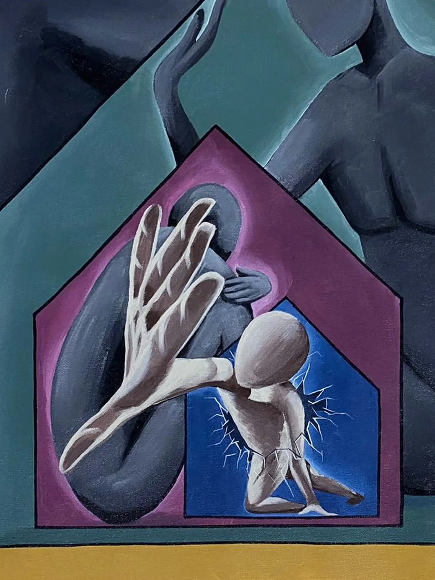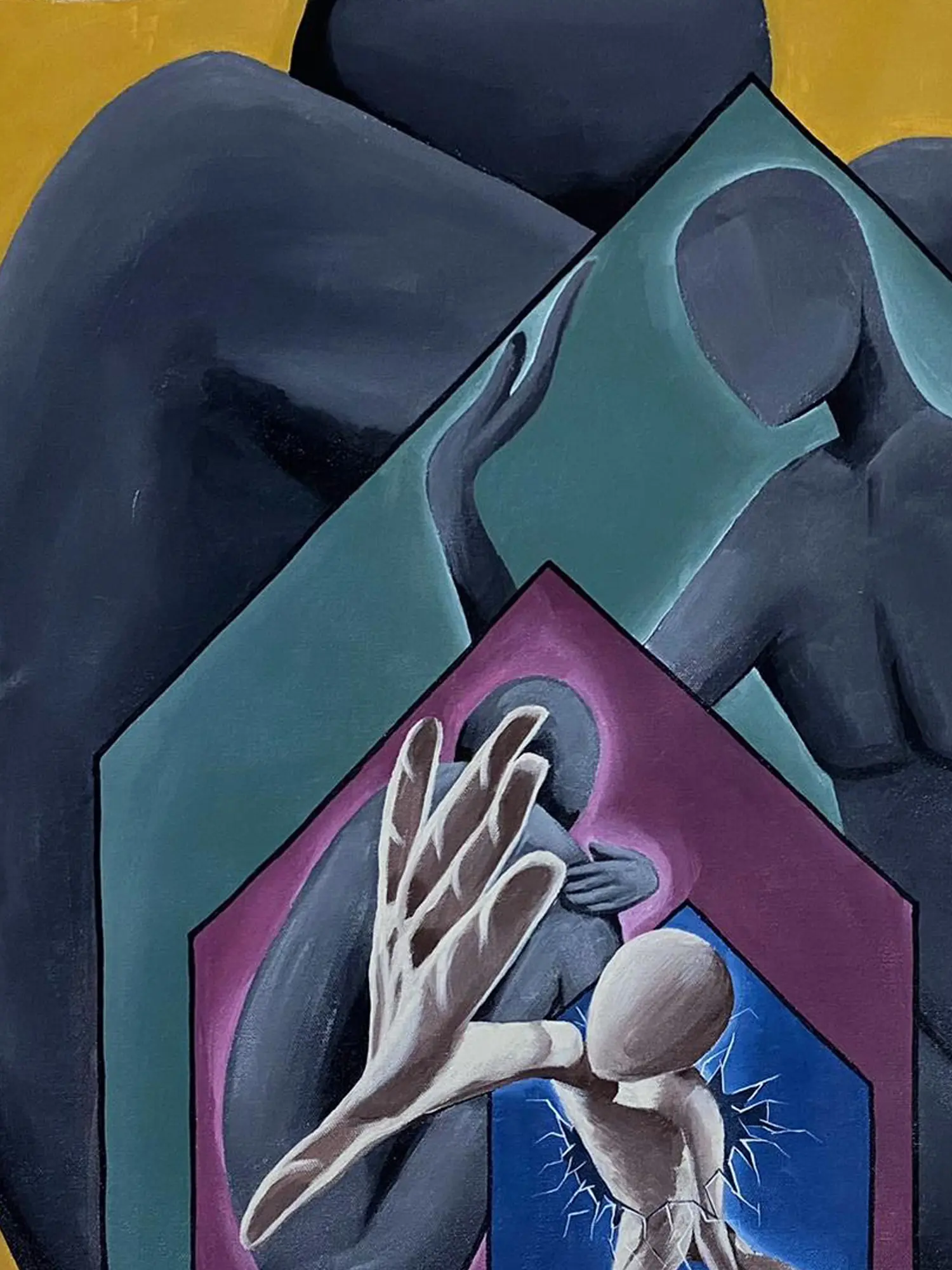 "The Private World" unfolds on acrylic canvas, portraying an intimate sanctuary within the chaos of life. The artist uses vibrant colours to create a visual haven where personal moments and cherished solitude take centre stage. This acrylic piece invites viewers to step into a private world, offering a respite from the external clamour.