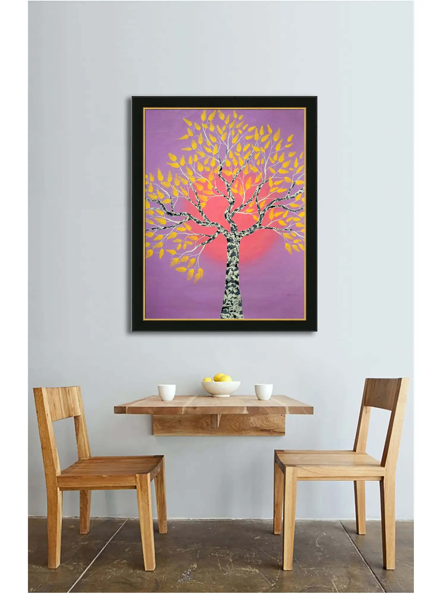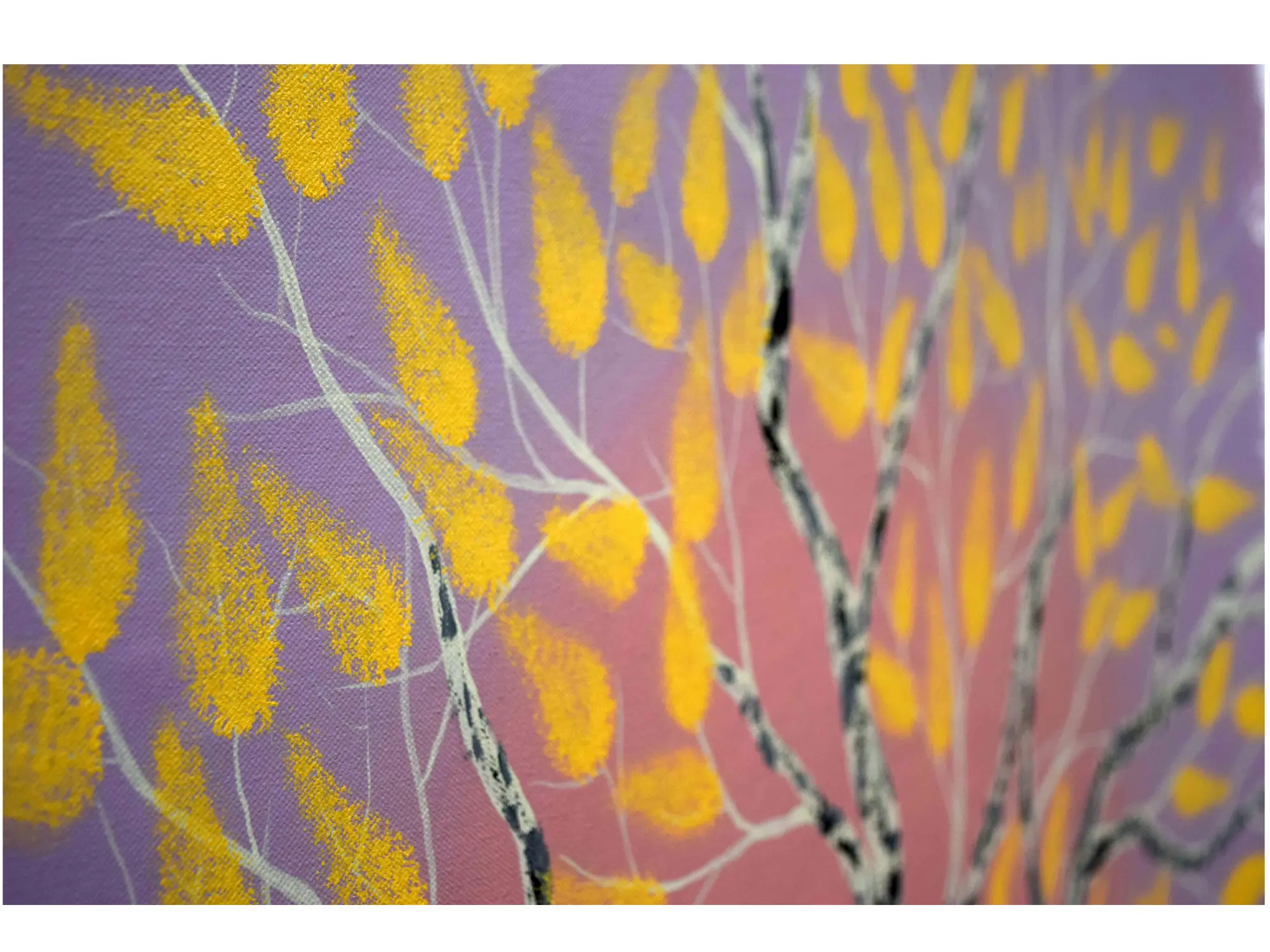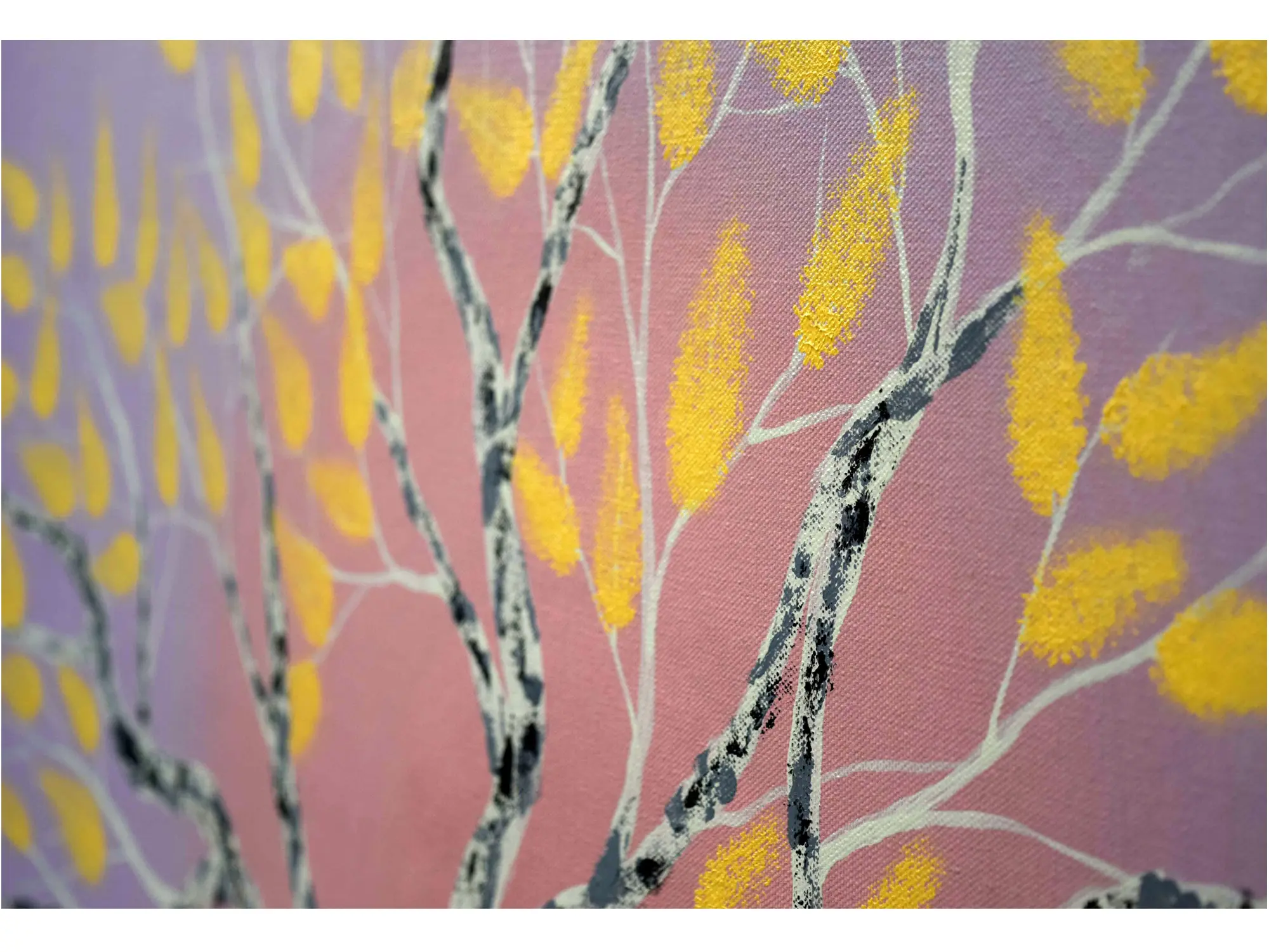 The interplay of soft purples and warm pinks in the background creates a dreamlike atmosphere, perfectly complementing the stark, yet graceful, branches reaching outwards. Vibrant yellow leaves, rendered with expressive brushwork, seem to dance against the sky, imbuing the composition with a lively energy. The textured bark of the central tree adds a captivating tactile quality, inviting closer inspection. The substantial scale, measuring 43 inches in height and 33 inches in width, ensures this artwork makes a significant and impressive statement.
