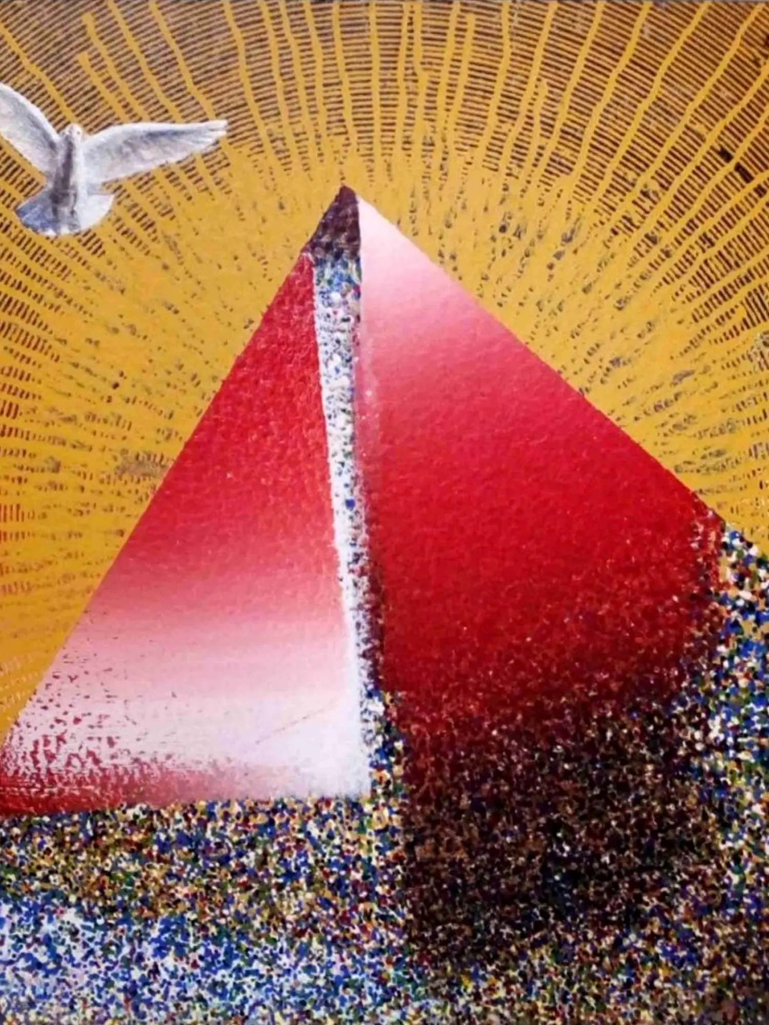 Ghanshyam Gupta’s artistic vision extends beyond the earthly realm, as a graceful bird soars across the upper reaches of the canvas. This avian figure, painted in delicate shades of white and grey, contrasts with the pyramid’s solidity. The bird is a timeless symbol of freedom, transcendence, and the human soul’s longing to break free from earthly constraints. Birds have been revered throughout history as messengers from the divine, embodiments of the air element, and guides to other worlds. In many mythologies, birds are seen as psychopomps, entities that escort souls to the afterlife. The presence of the bird above the pyramid suggests a harmonious balance between the earthly and spiritual, the physical and metaphysical. It encourages viewers to contemplate their own journeys, the peaks they aspire to reach, and the lightness of being they hope to attain. The bird's flight further emphasizes the themes of ascension and spiritual seeking embedded within the painting's core.