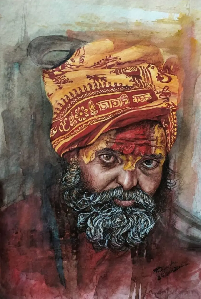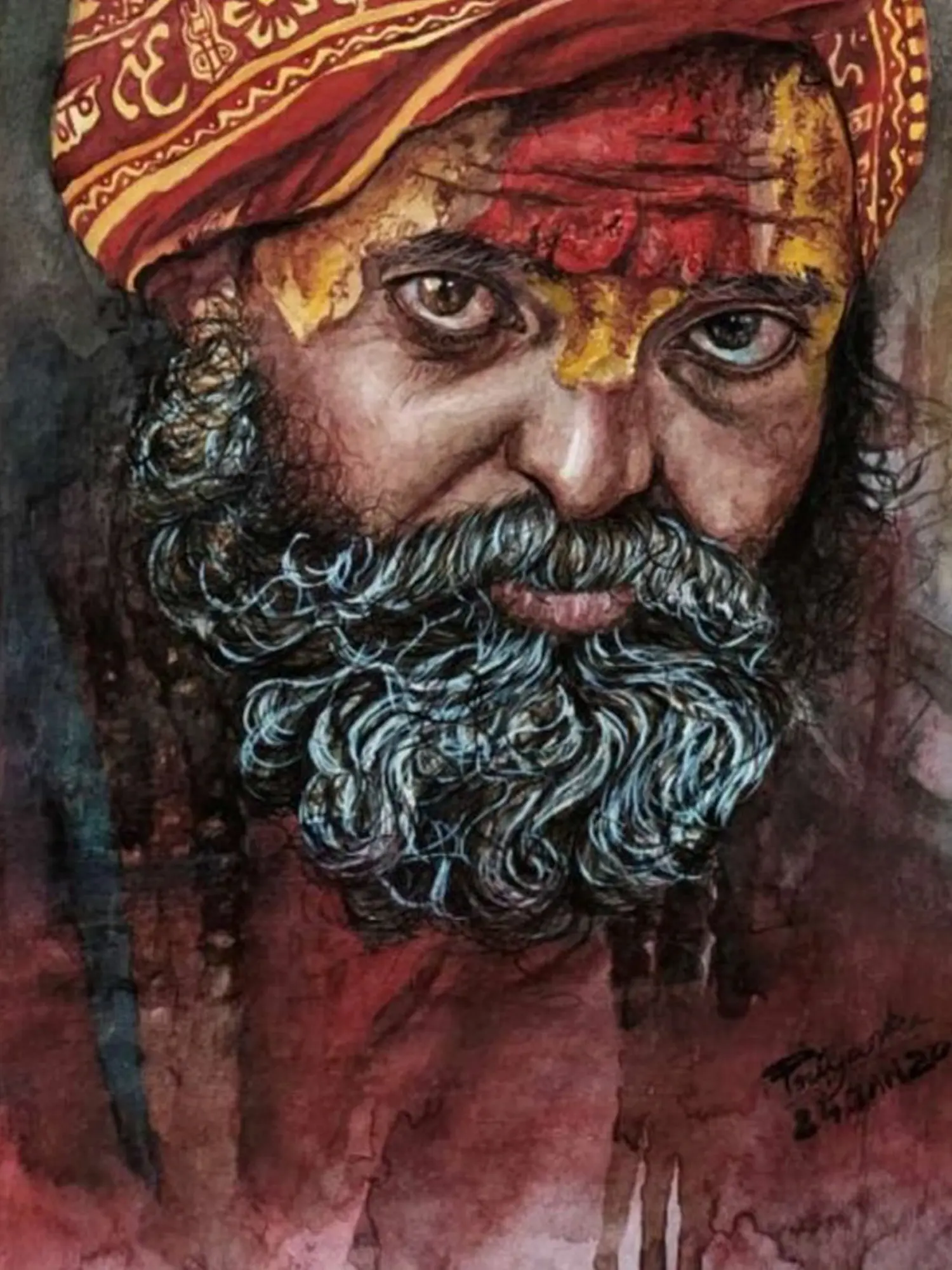 The sadhu's eyes seem to transcend the canvas, inviting viewers to delve into the depths of their own introspection. Every stroke captures the intensity of his questioning spirit, challenging the beholder to ponder life's mysteries. The painting becomes a compelling dialogue between the observer and the sadhu, where unspoken questions echo, creating an evocative and thought-provoking visual narrative.