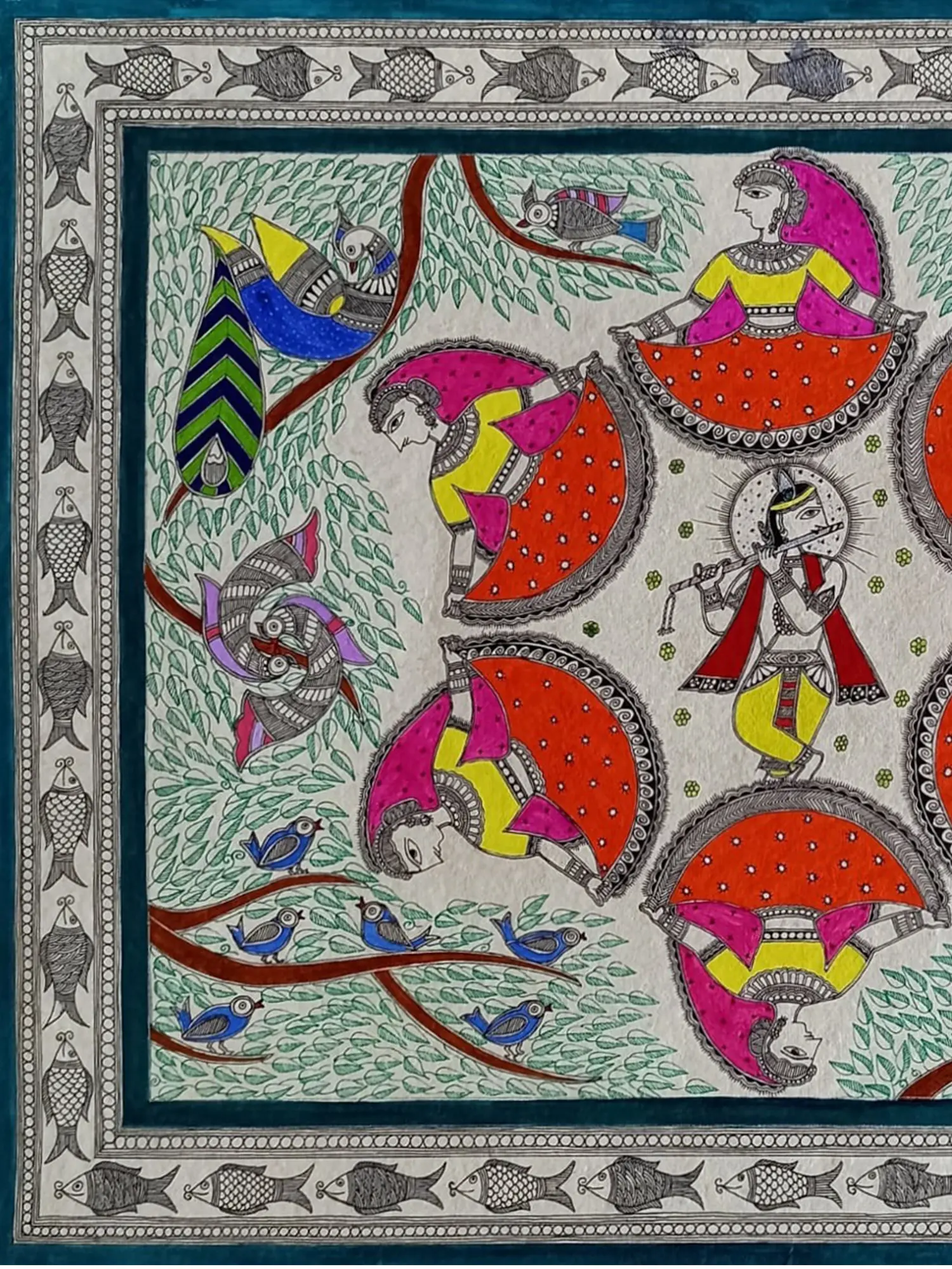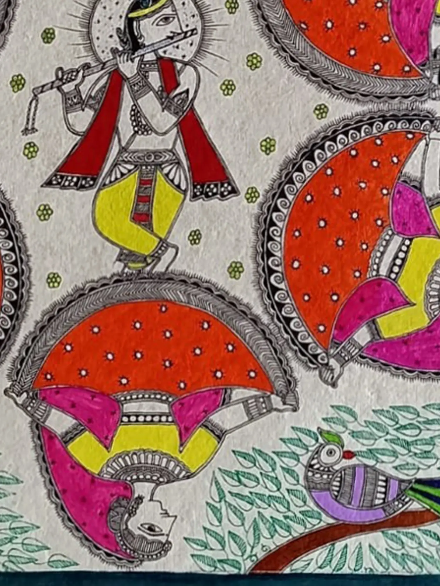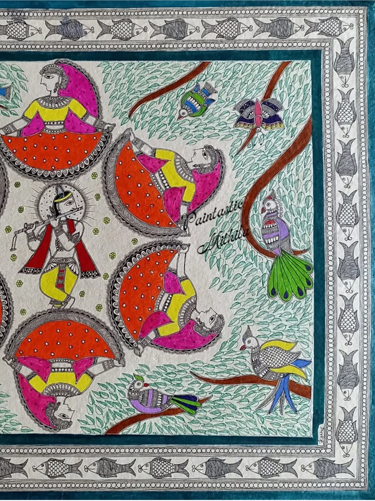 With bold colors and meticulous detailing, Raut portrays the divine dance of Krishna, surrounded by Gopis and vibrant flora and fauna. The characteristic geometric patterns and motifs of Madhubani art seamlessly intertwine with the narrative, creating a harmonious blend of mythology and folk art. Raut's work not only pays homage to the cultural heritage but also breathes new life into the ancient storytelling tradition through her vivid and captivating composition.