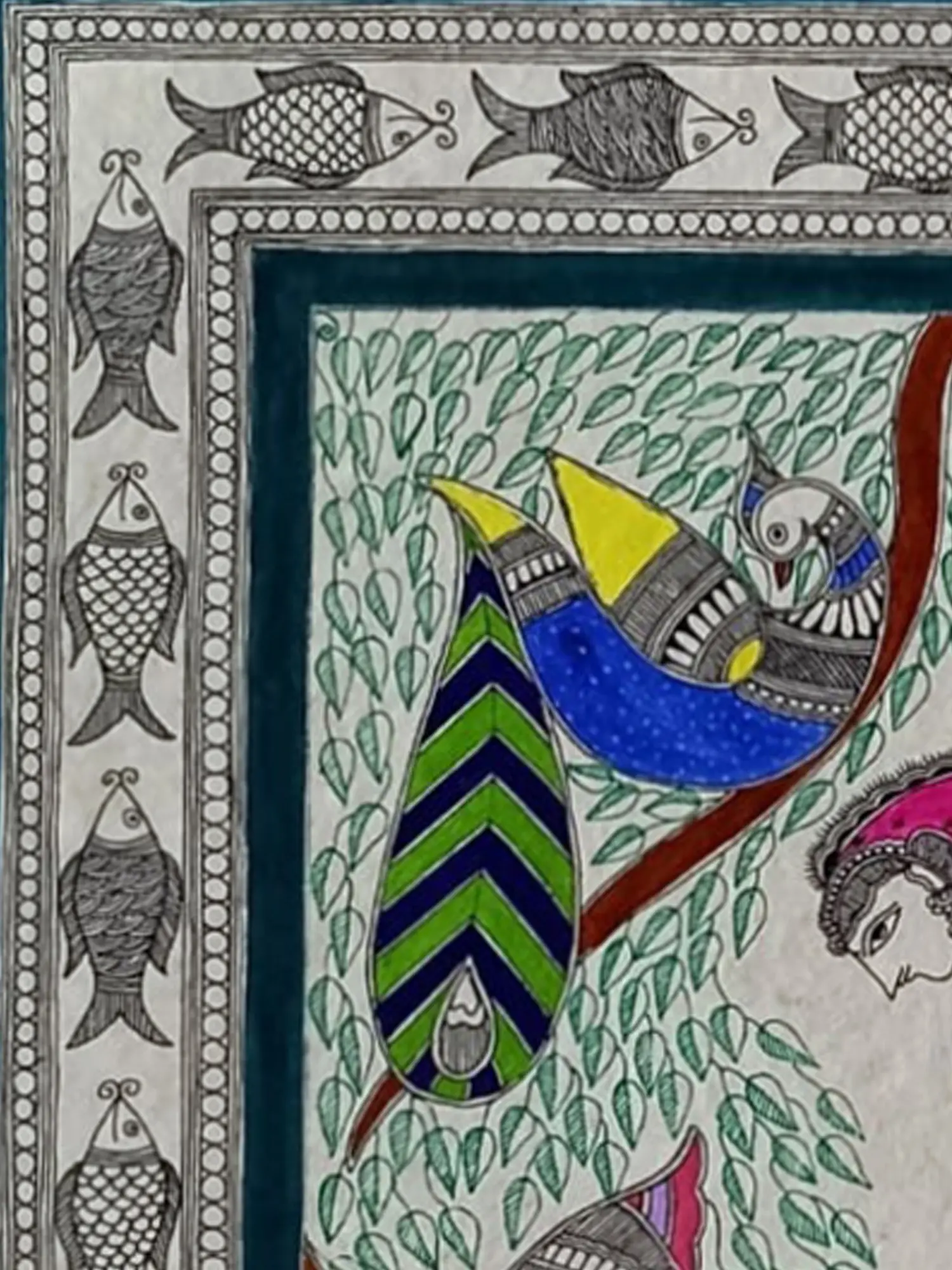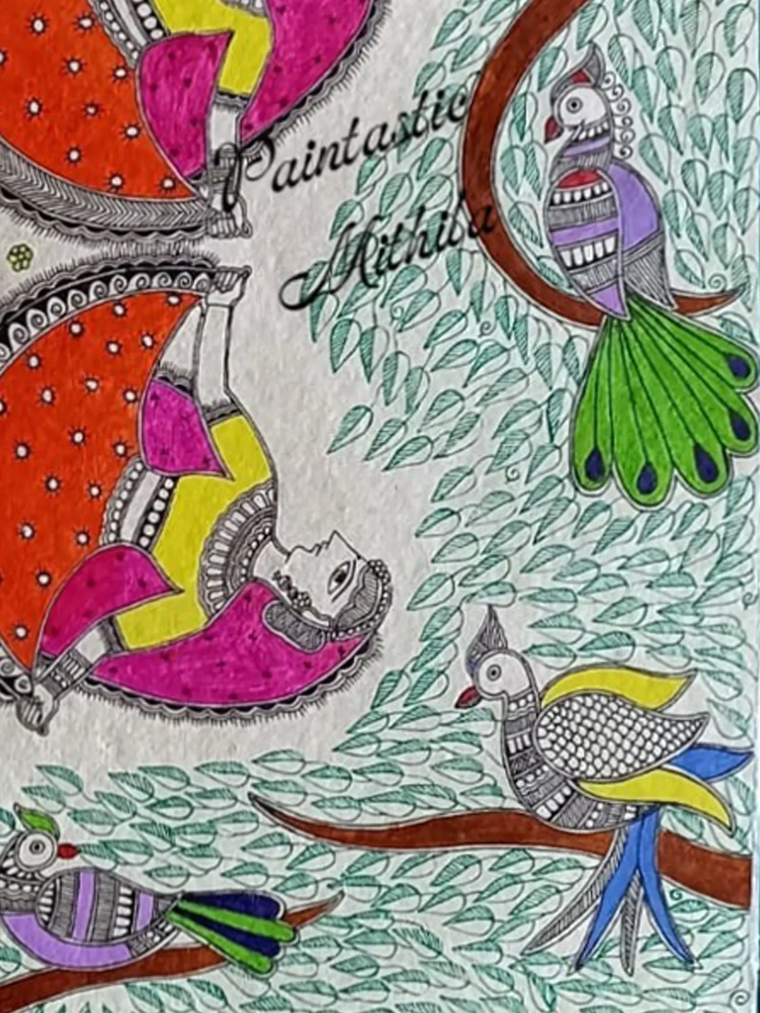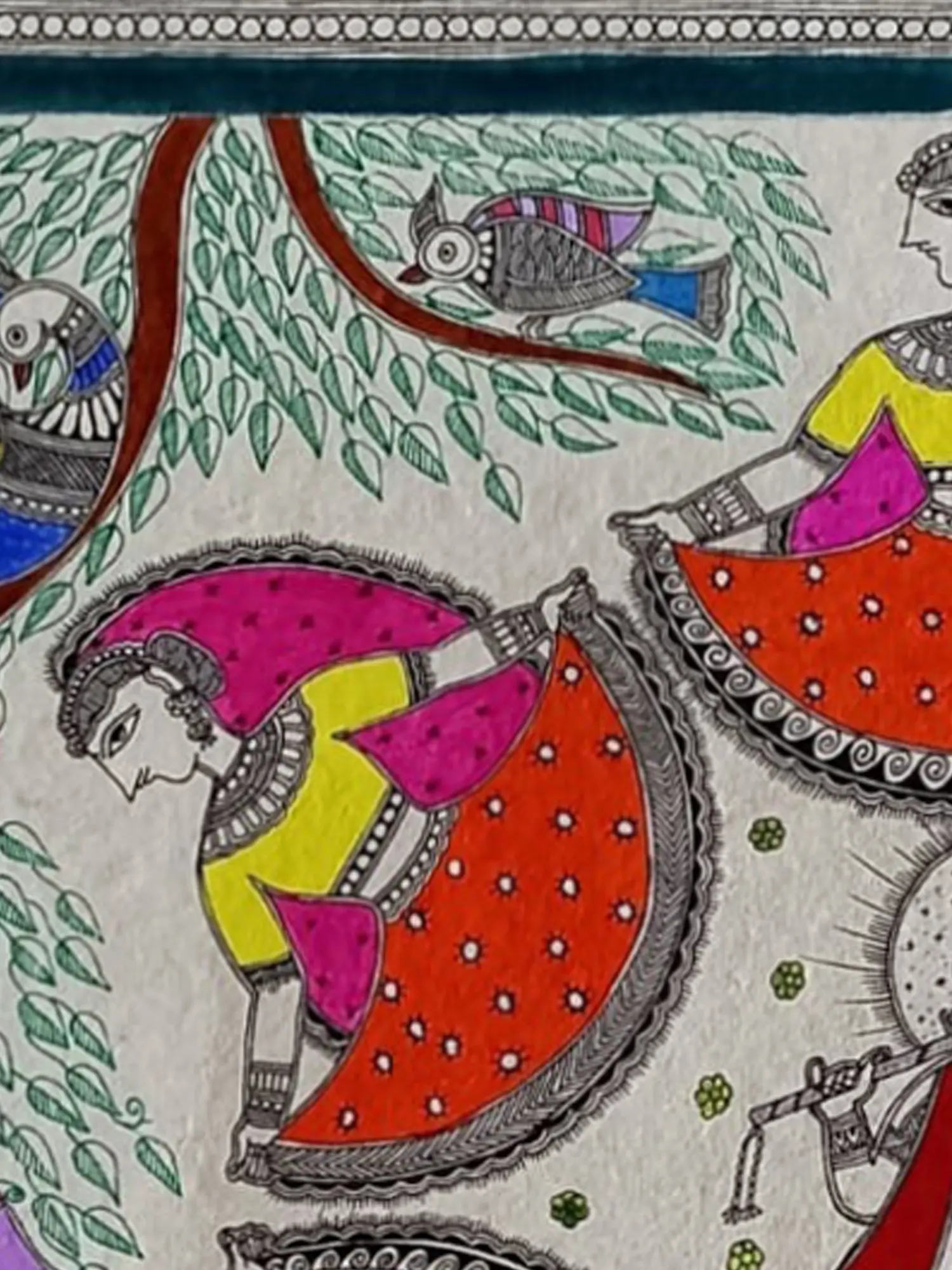 With bold colors and meticulous detailing, Raut portrays the divine dance of Krishna, surrounded by Gopis and vibrant flora and fauna. The characteristic geometric patterns and motifs of Madhubani art seamlessly intertwine with the narrative, creating a harmonious blend of mythology and folk art. Raut's work not only pays homage to the cultural heritage but also breathes new life into the ancient storytelling tradition through her vivid and captivating composition.