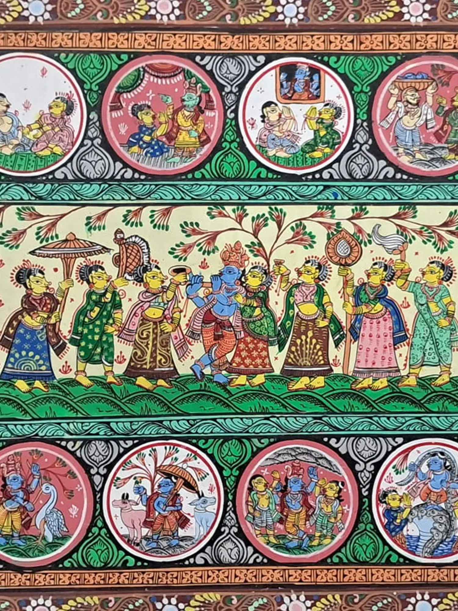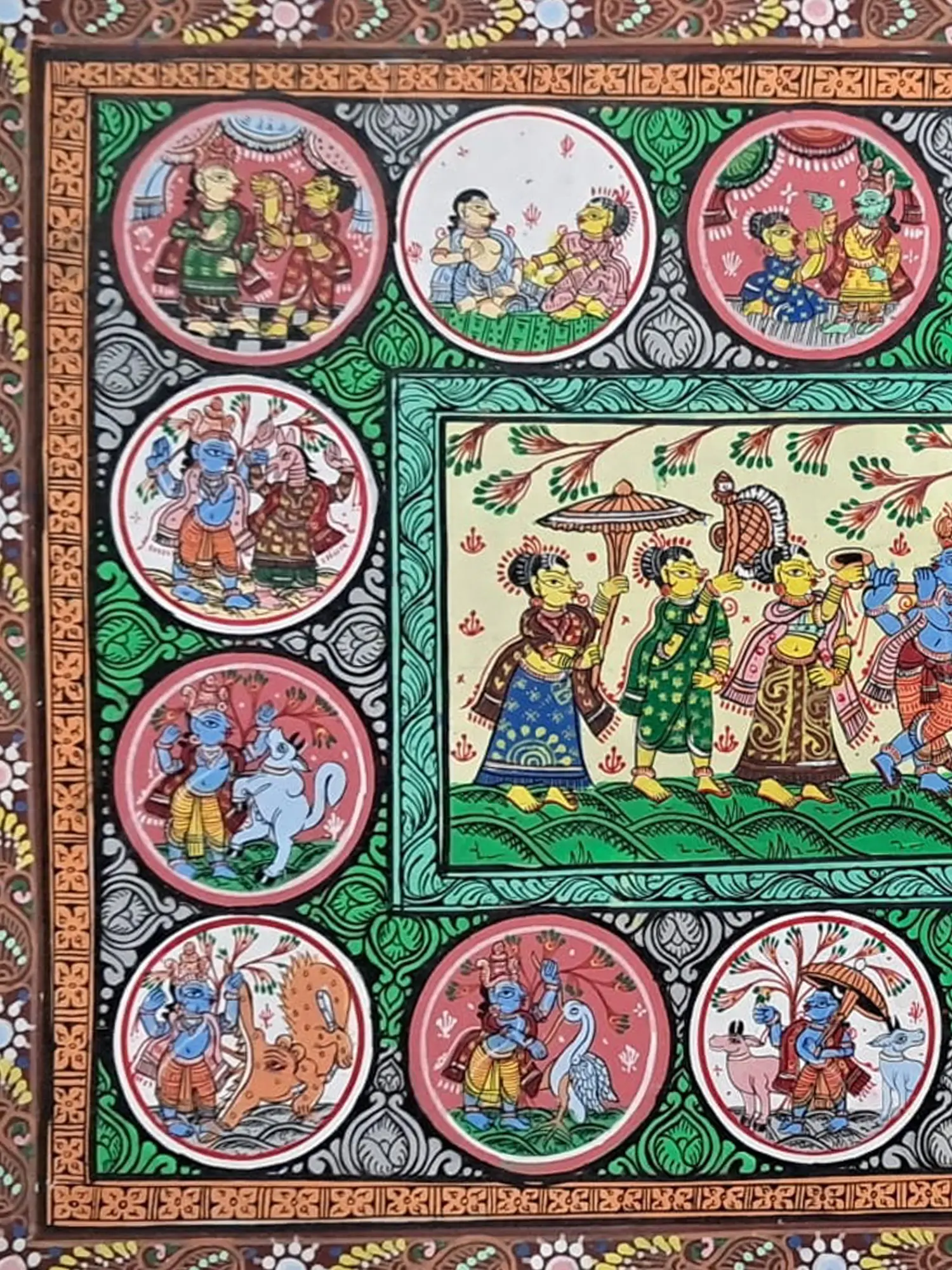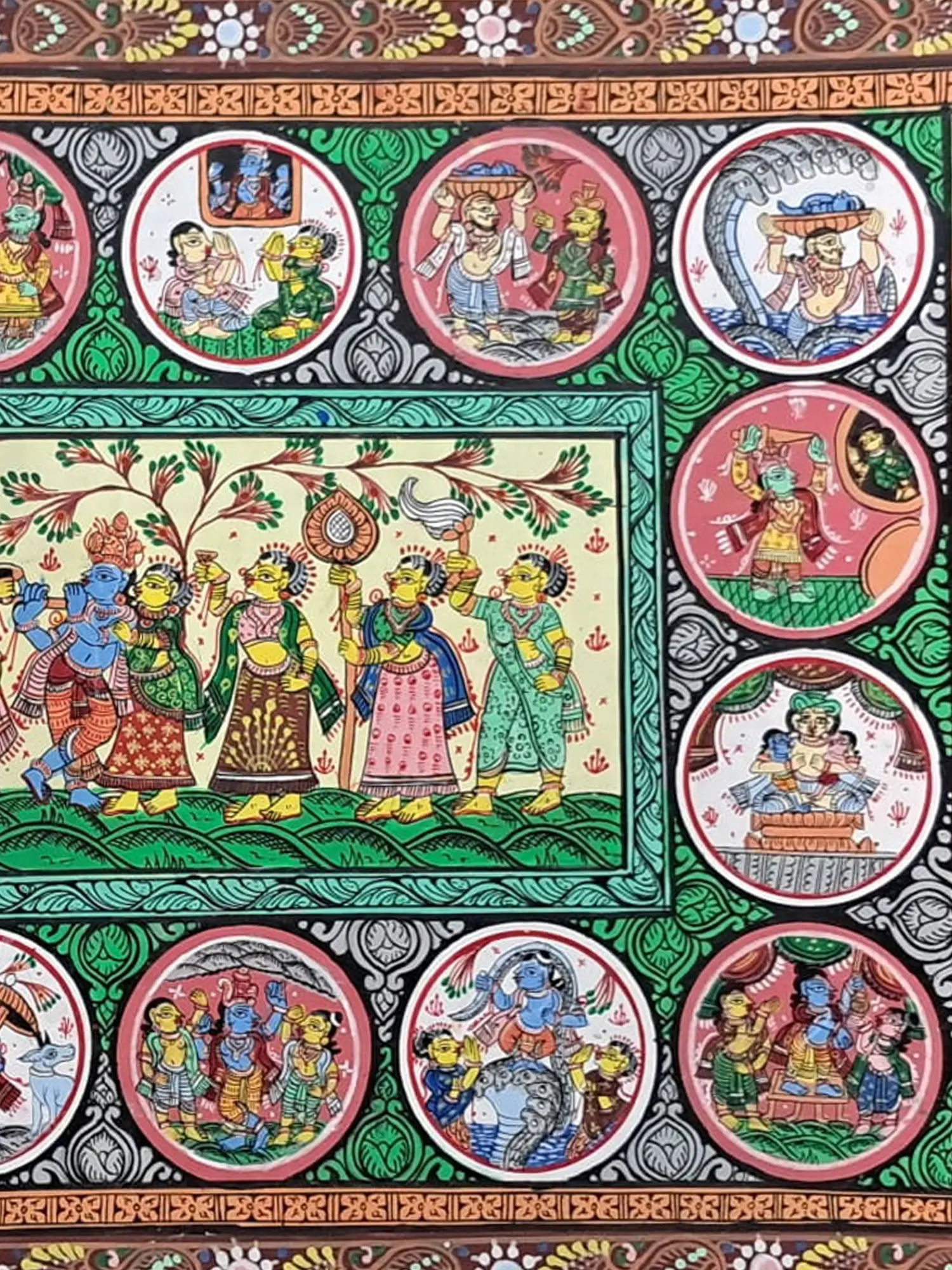 Witness the celestial dance of love and devotion with "Raasleela of Lord Krishna," a sublime portrayal in natural stone colours on Patachitra canvas. Amidst the lush groves of Vrindavan, Krishna and the Gopis engage in the divine ecstasy of Raasleela, where every movement is a mark of divine union. This artwork captures the essence of divine love and devotion, inviting viewers to partake in the eternal joy of Krishna's divine play.