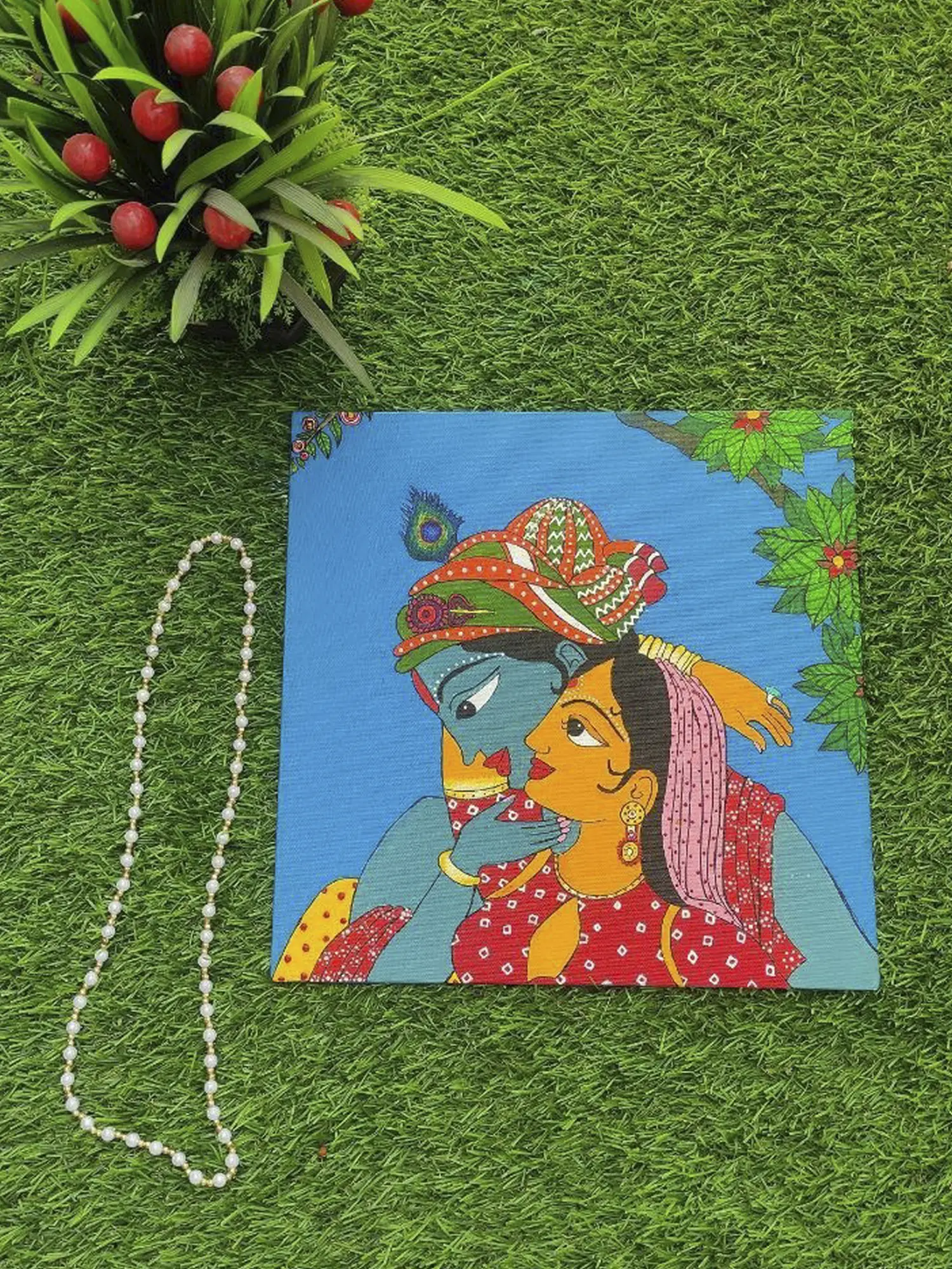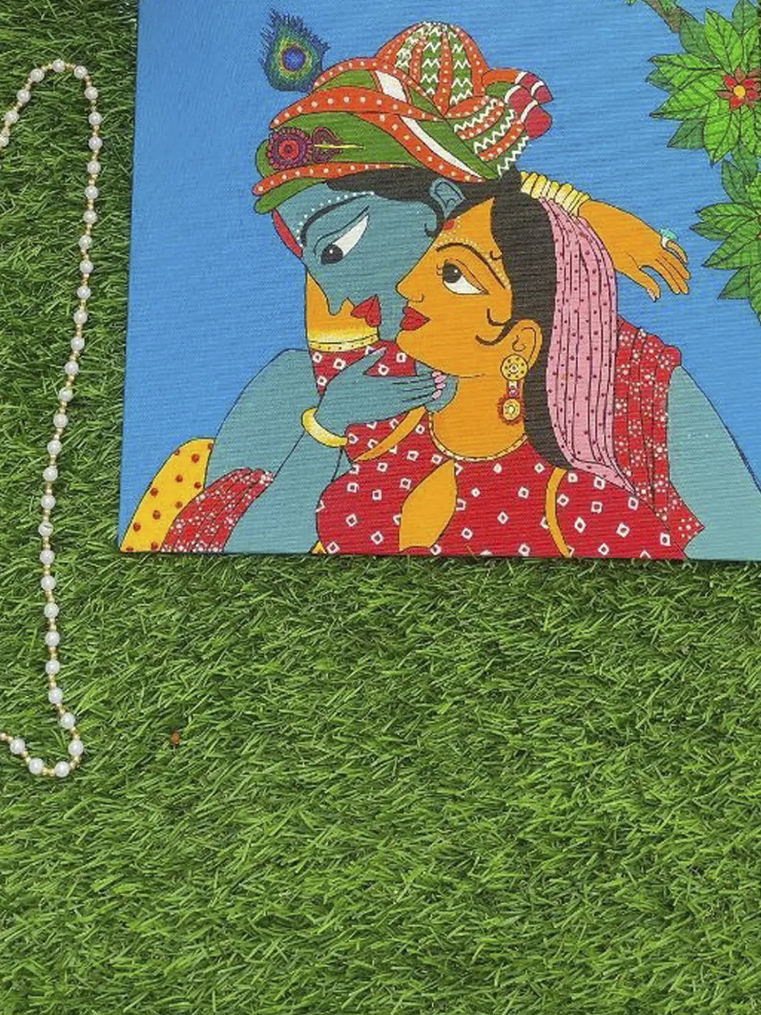 This Acrylic on Canvas Board with 3D outliner painting by Mahanvi Jhunjhunwala titled Radha and Krishna - Eternal Love" delves into the profound philosophy of Radha and Krishna's eternal love. Their divine romance is symbolic of the soul's yearning for spiritual awakening and reunion with the Divine. Radha's love for Krishna represents the soul's longing to rediscover its oneness with the ultimate source of peace and bliss.