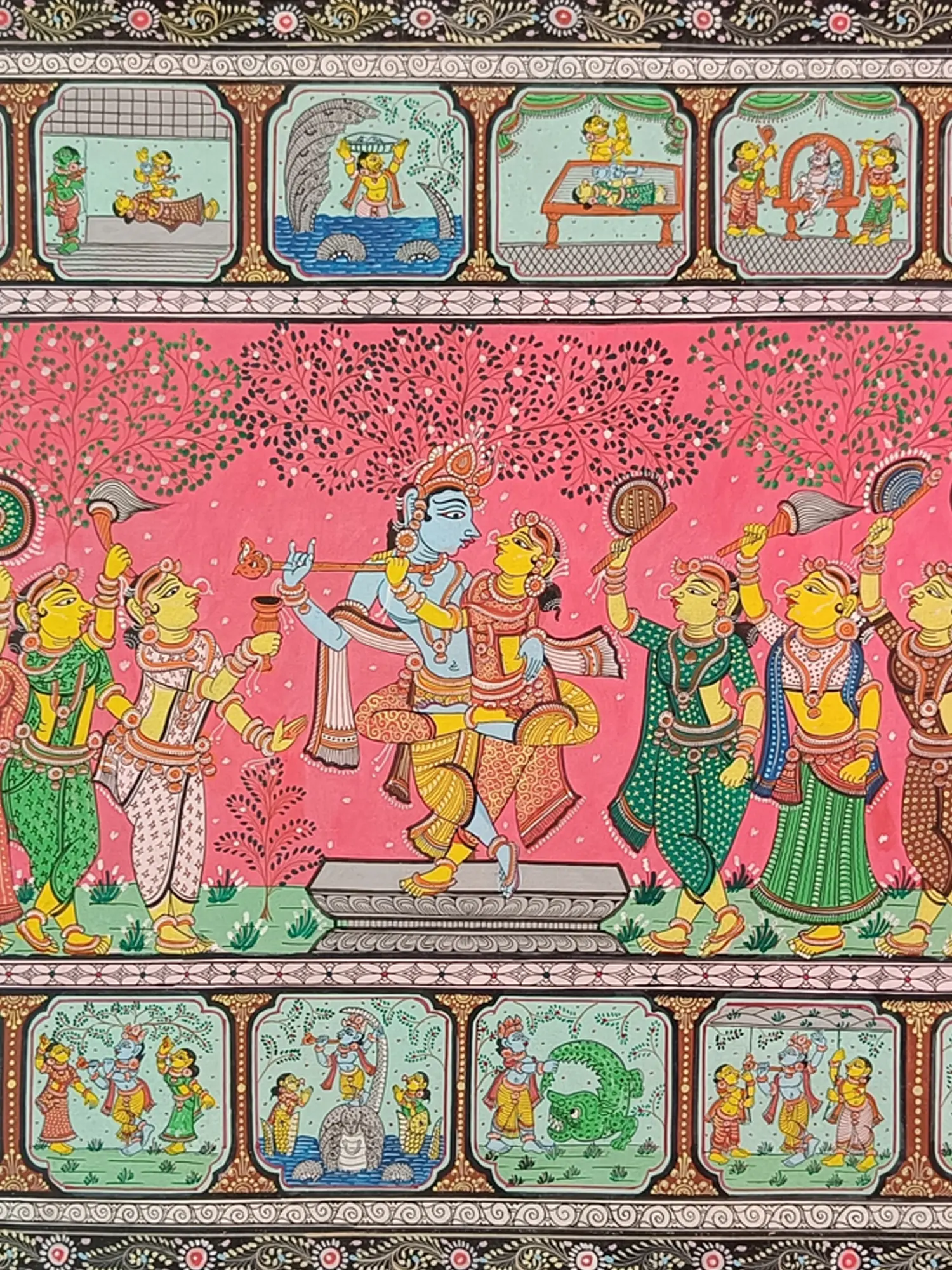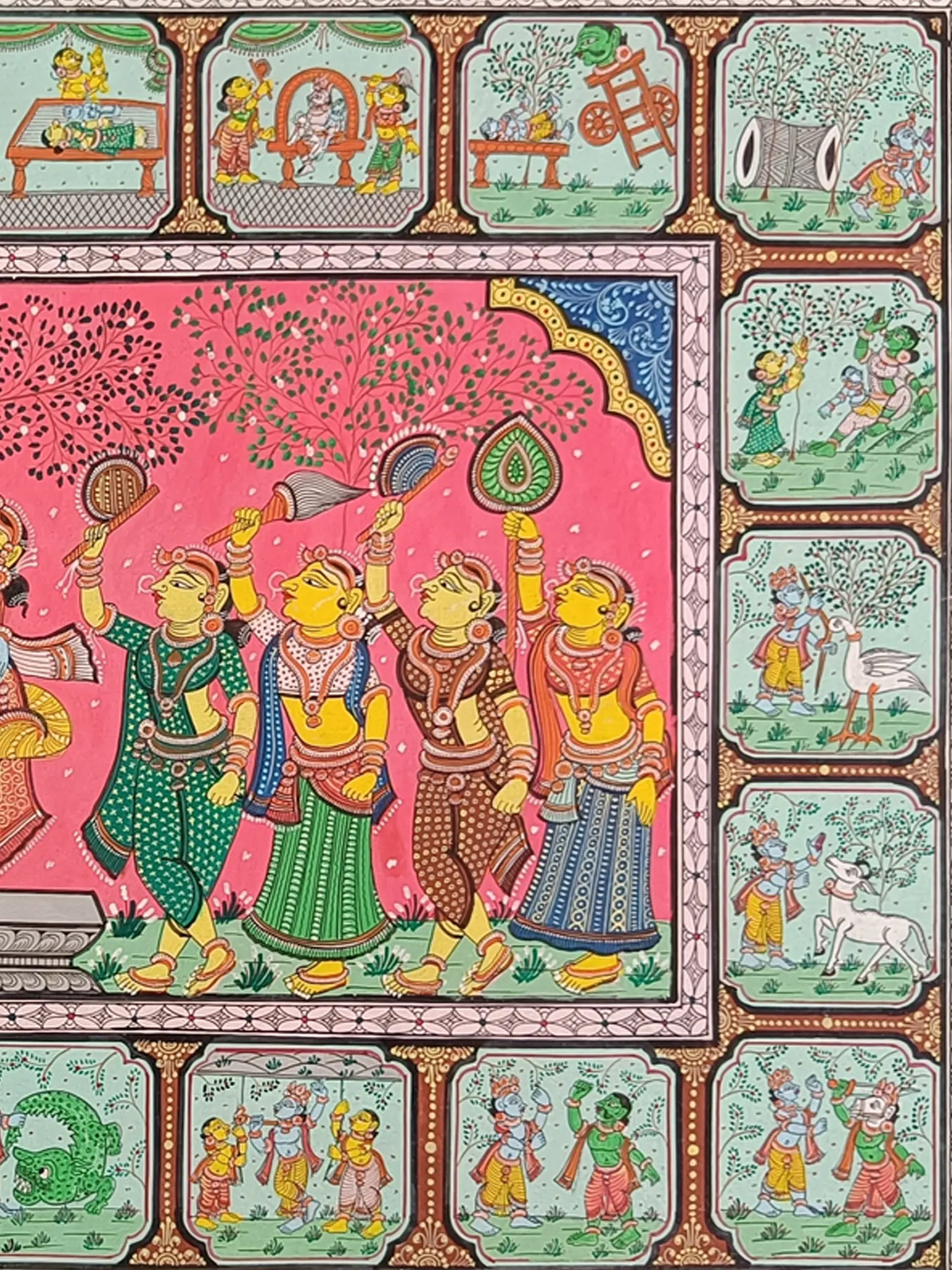 Surrounding this central scene, the depiction of Lord Krishna's various leelas from childhood adds depth to the narrative, creating a harmonious and intricate composition. Sachikant's work not only pays homage to divine love but also showcases the rich cultural and artistic heritage of Pattachitra, making it a captivating portrayal of Radha and Krishna's eternal bond amidst playful leelas.