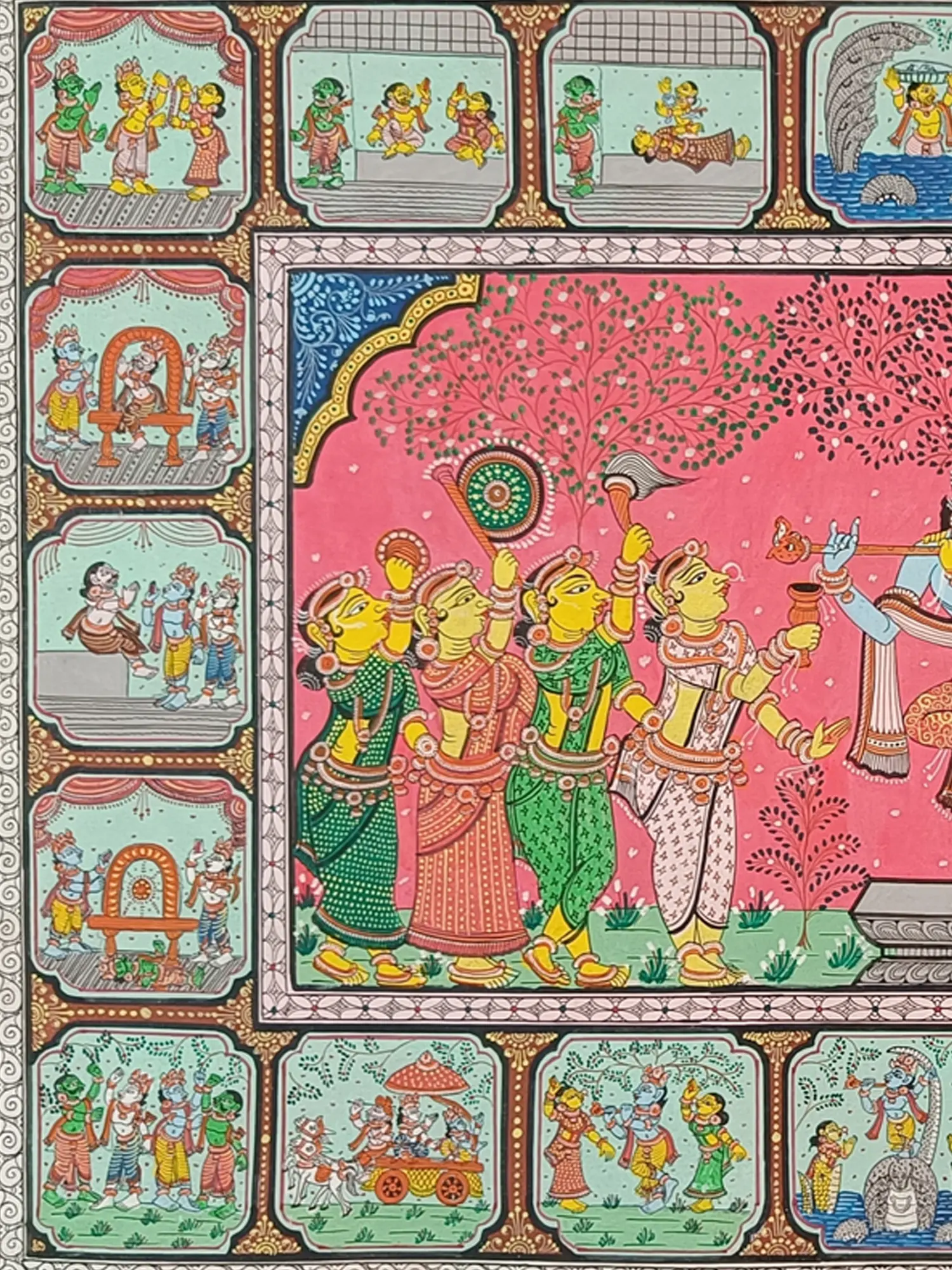 Sachikant's Pattachitra masterpiece, "Radha and Krishna Leela with Gopis," on handmade canvas is a visual marvel. The use of natural colors brings vibrancy to this traditional art form. The central focus, set against a beautiful pink background, captures the amorous essence of Lord Krishna and Goddess Radha surrounded by affectionate gopikas. The detailing reflects the intricate Pattachitra style, showcasing devotion and artistry.