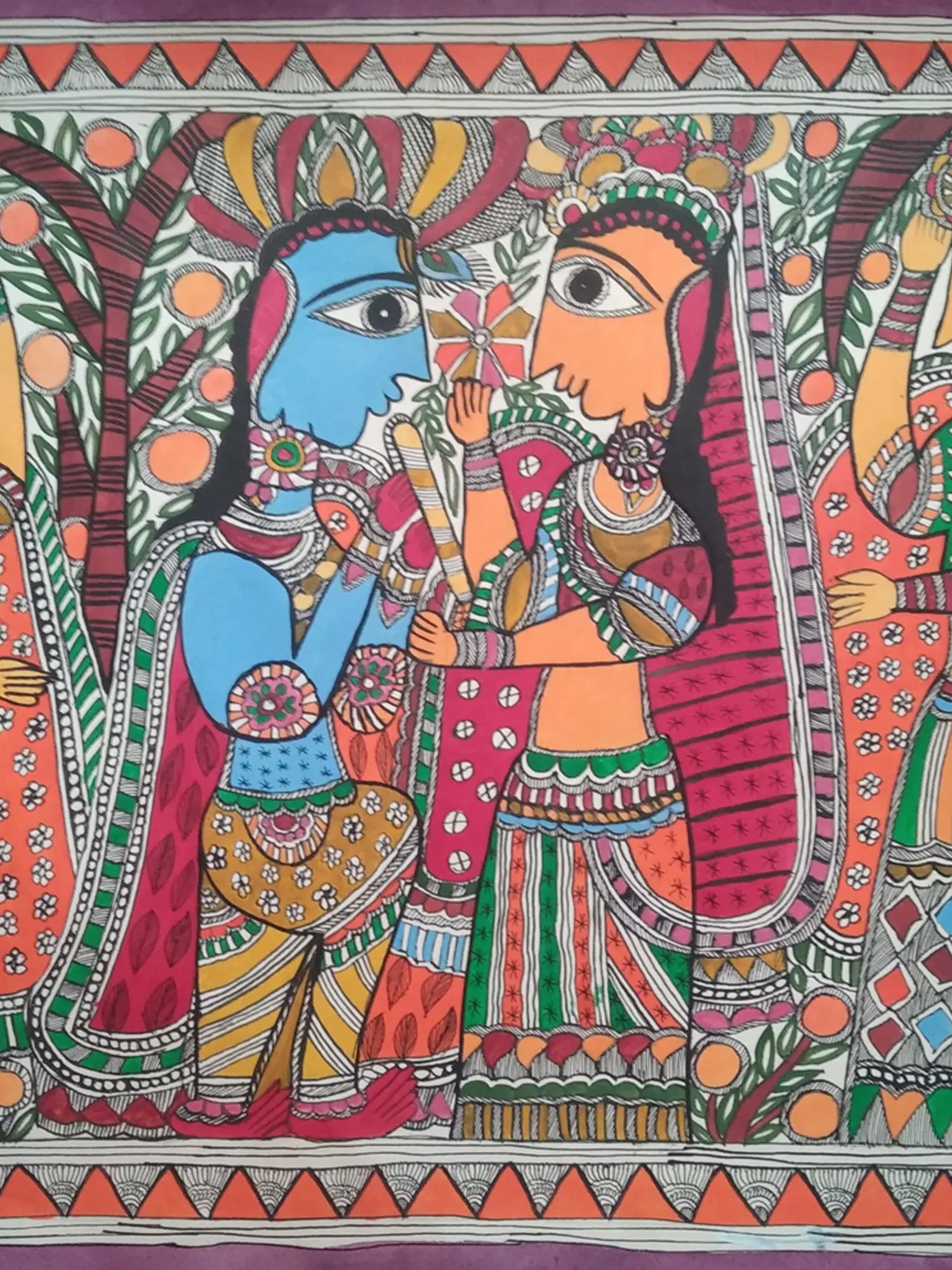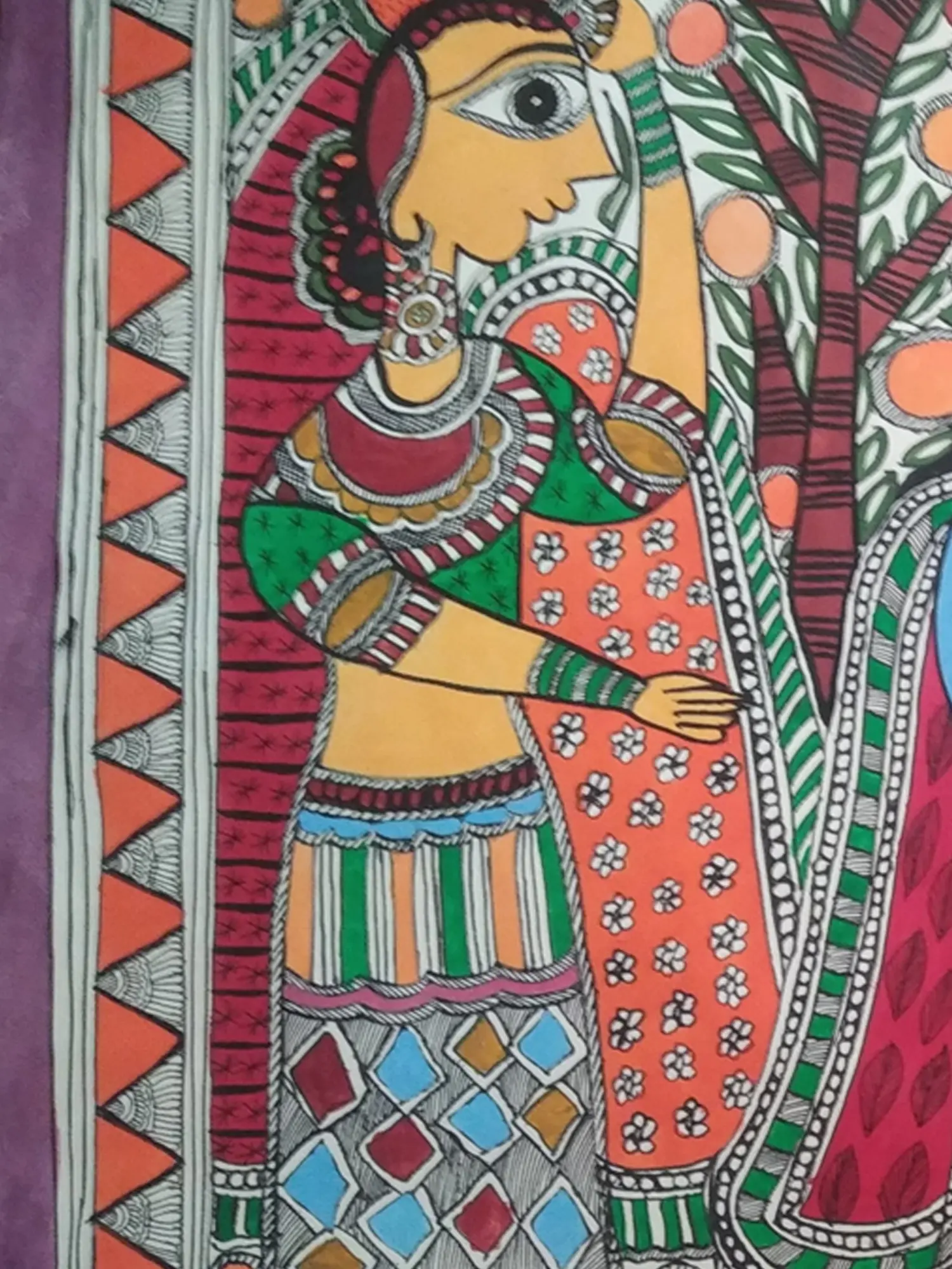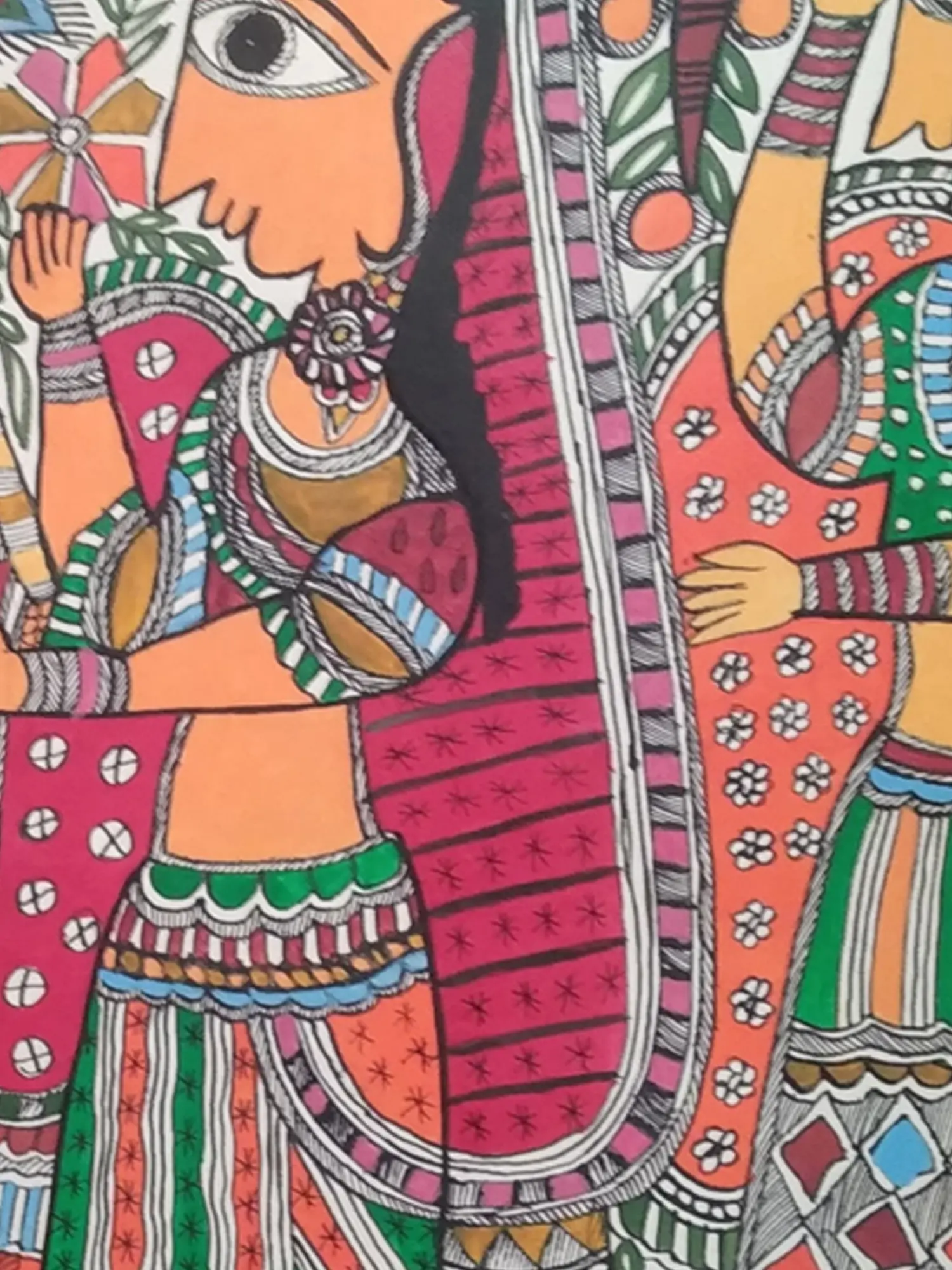 The composition unfolds across 28 inches of width and 21 inches of height, a generous canvas for the artist's vision. You'll appreciate the intricate detailing of the figures' adornments, the flowing garments, and the delicate flora that frames the central figures. The vibrant palette, achieved through natural dyes, sings with an earthy richness, while the bold outlines define each element with striking clarity.