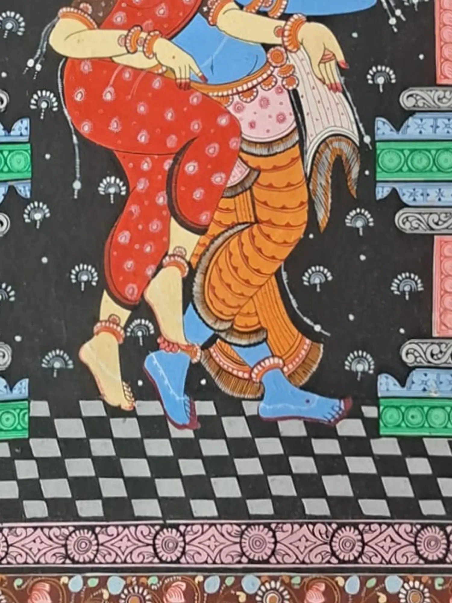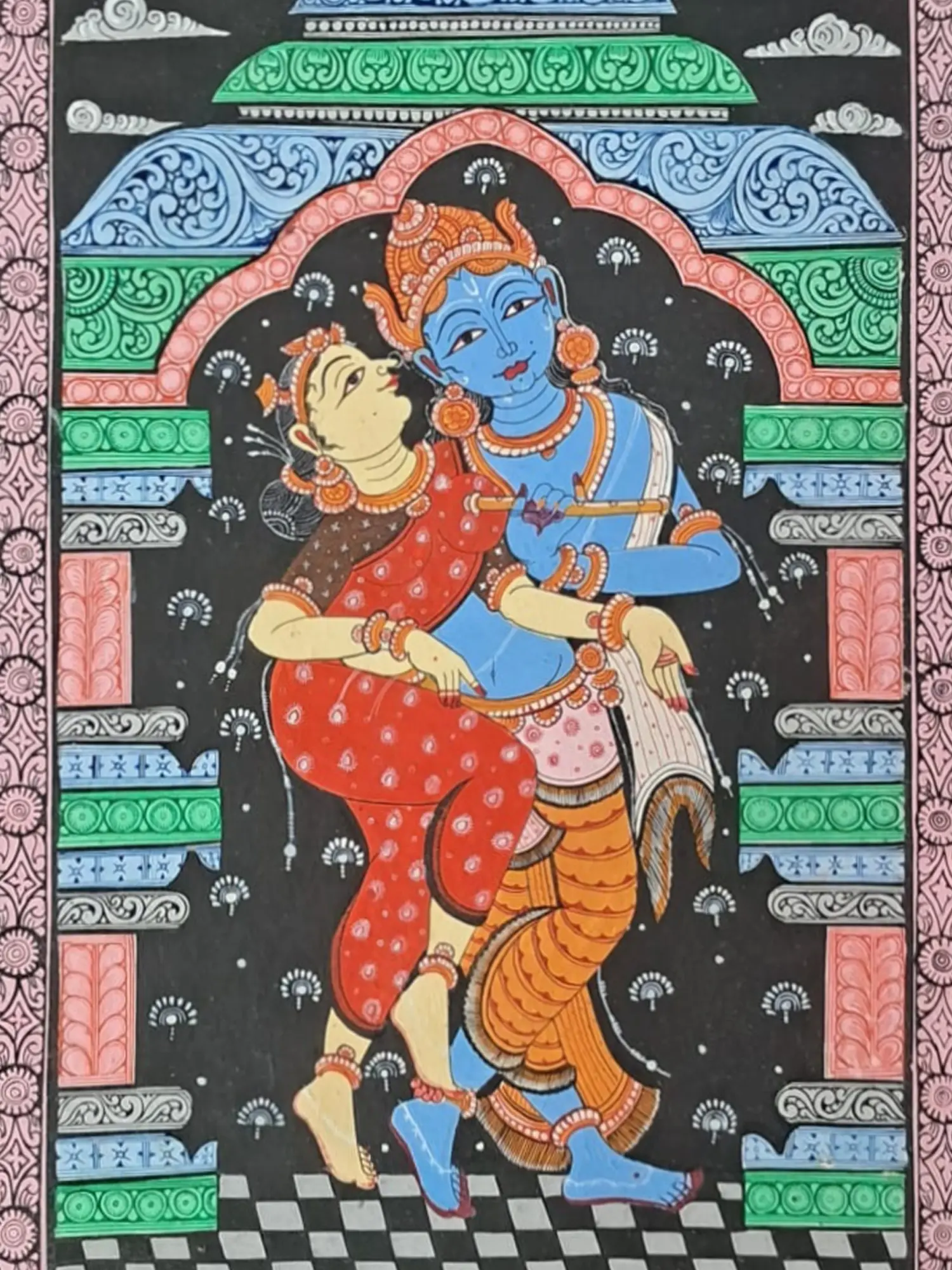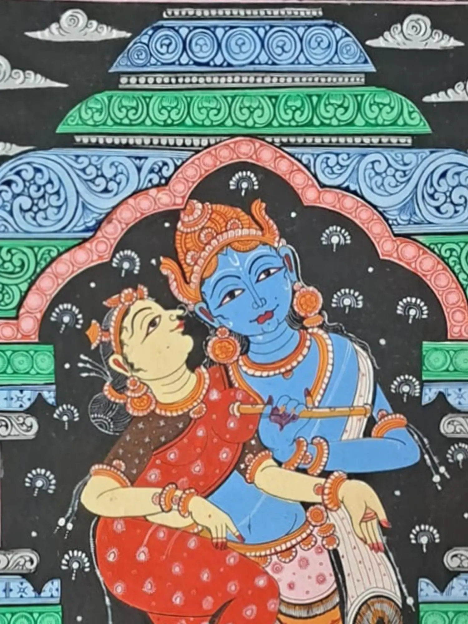 Be enchanted by the celestial melody of our Radha and Krishna Playing Flute painting. Crafted with natural stone colors, this exquisite artwork transports you to the divine realm of love and music. Radha and Krishna, adorned in celestial attire, entwined in a celestial dance of love and devotion. The melodious strains of Krishna's flute echo through the painting, filling the heart with joy and serenity.