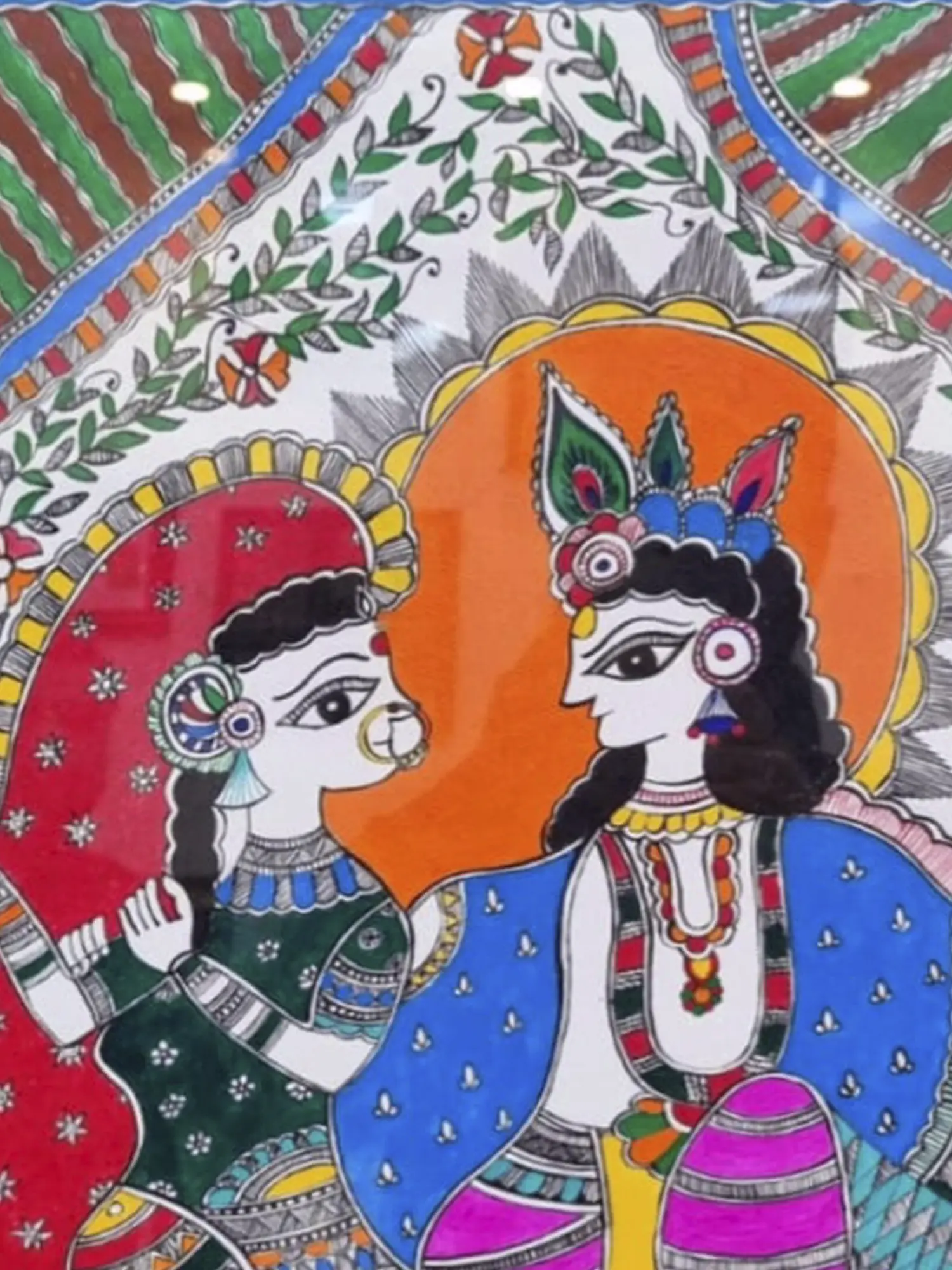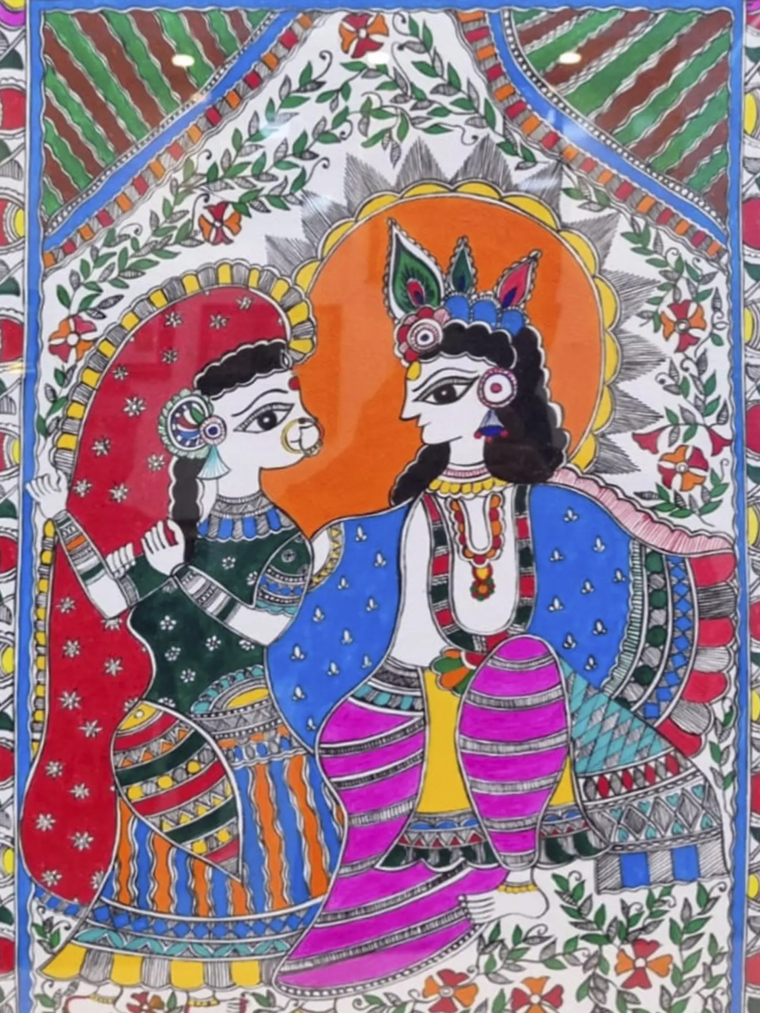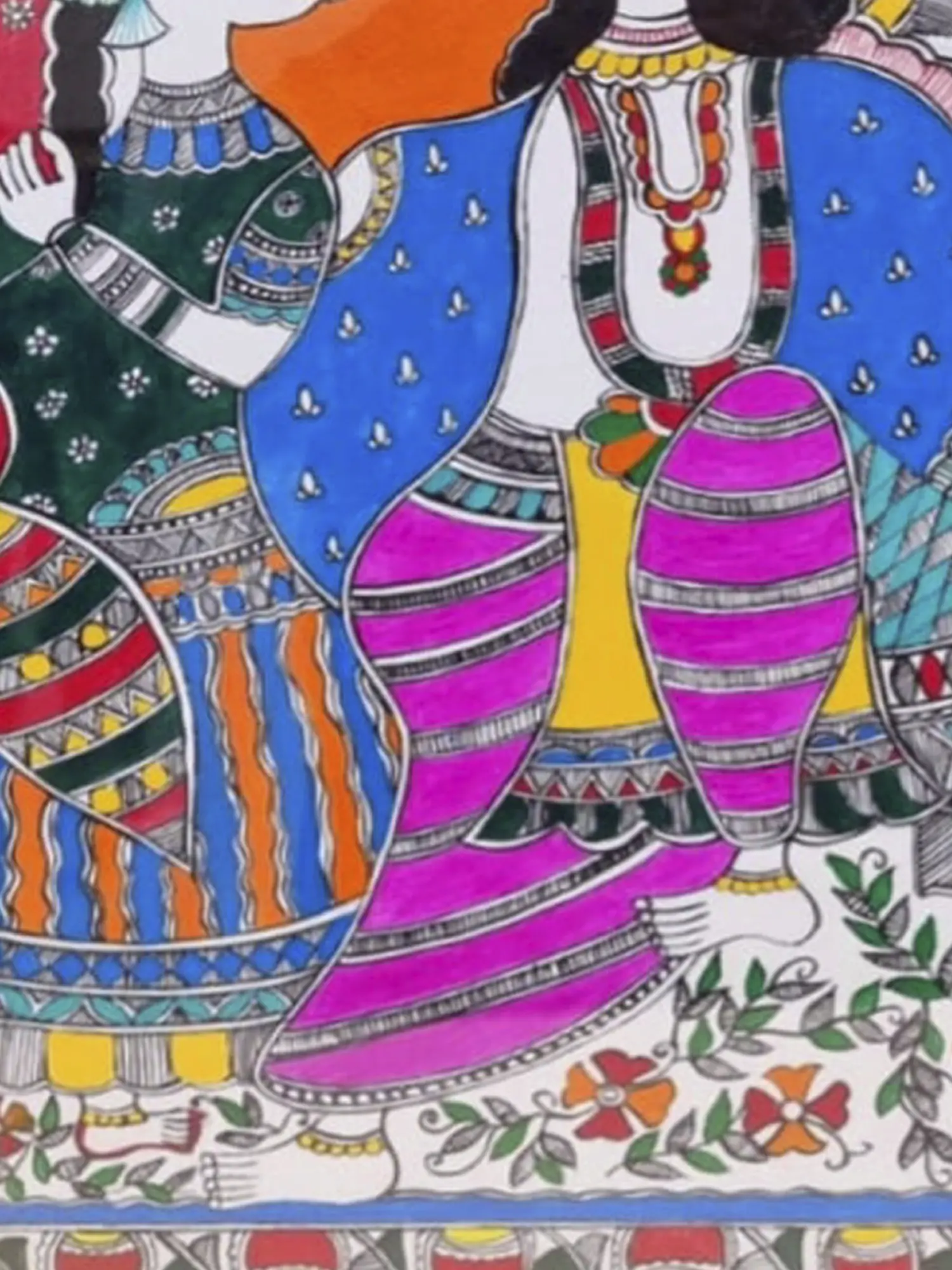 Experience the celestial love between Radha and Krishna with this acrylic painting on handmade paper. The artist's expressive brushstrokes bring the celestial couple to life, capturing the eternal bond between the divine lovers. The use of handmade paper adds a tactile and organic quality to the artwork, enhancing its charm. Let the presence of Radha and Krishna sitting together in this acrylic piece infuse your space with the heavenly romance and spiritual energy of their divine union.