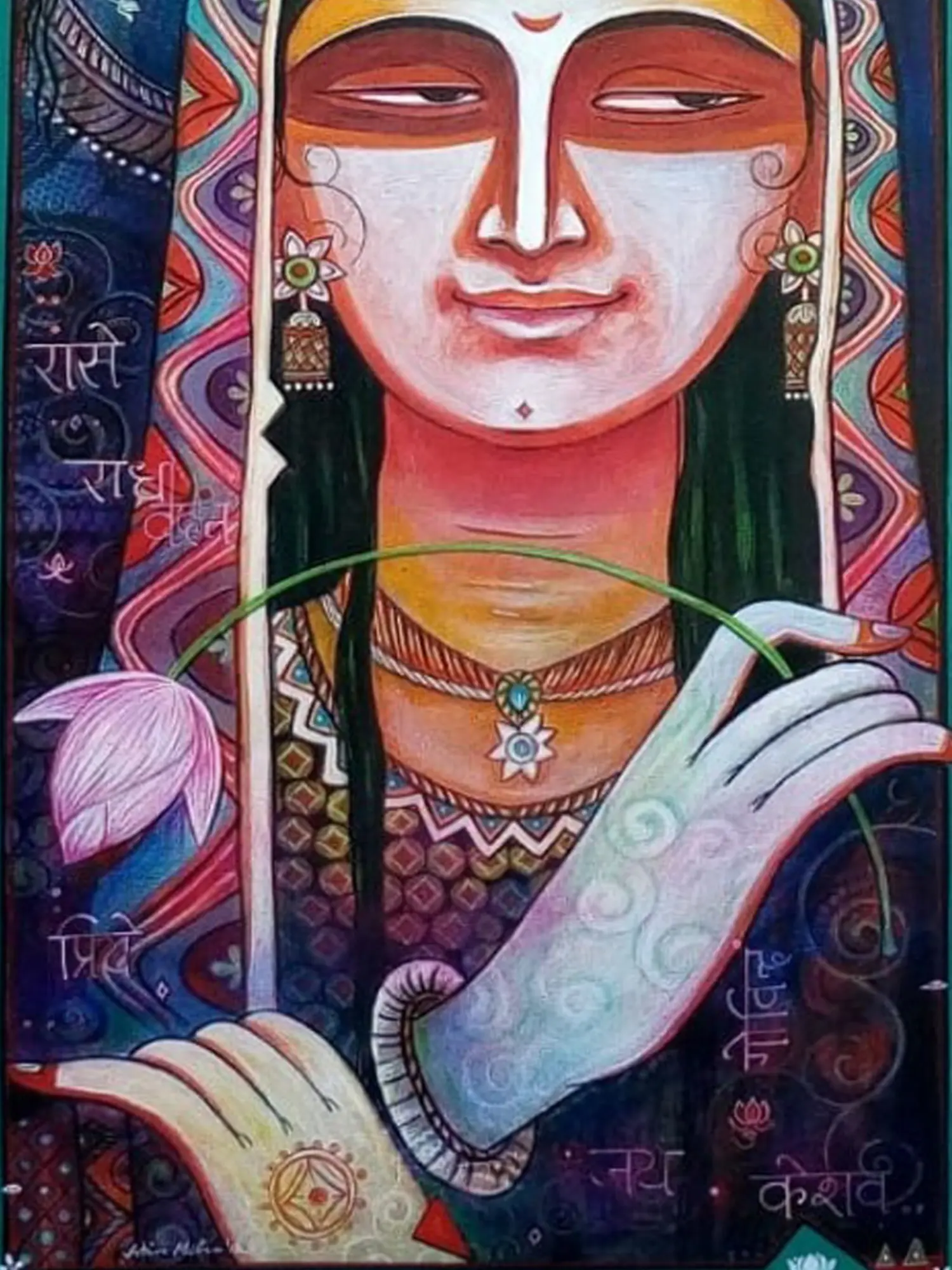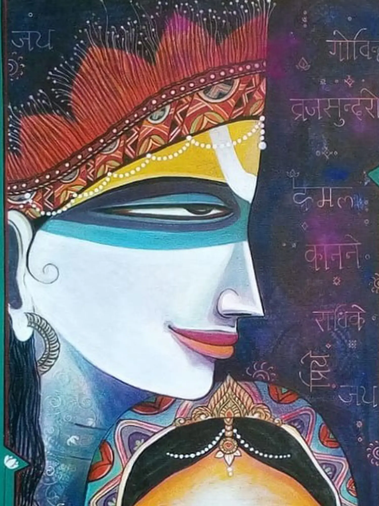 This portrayal draws from the rich tapestry of Hindu mythology, specifically the devotional tales of Radha and Krishna, revered as the epitome of divine love. The artist imbues the work with traditional symbolism and contemporary artistic flair, creating a piece that resonates with both spiritual significance and modern aesthetic sensibilities.