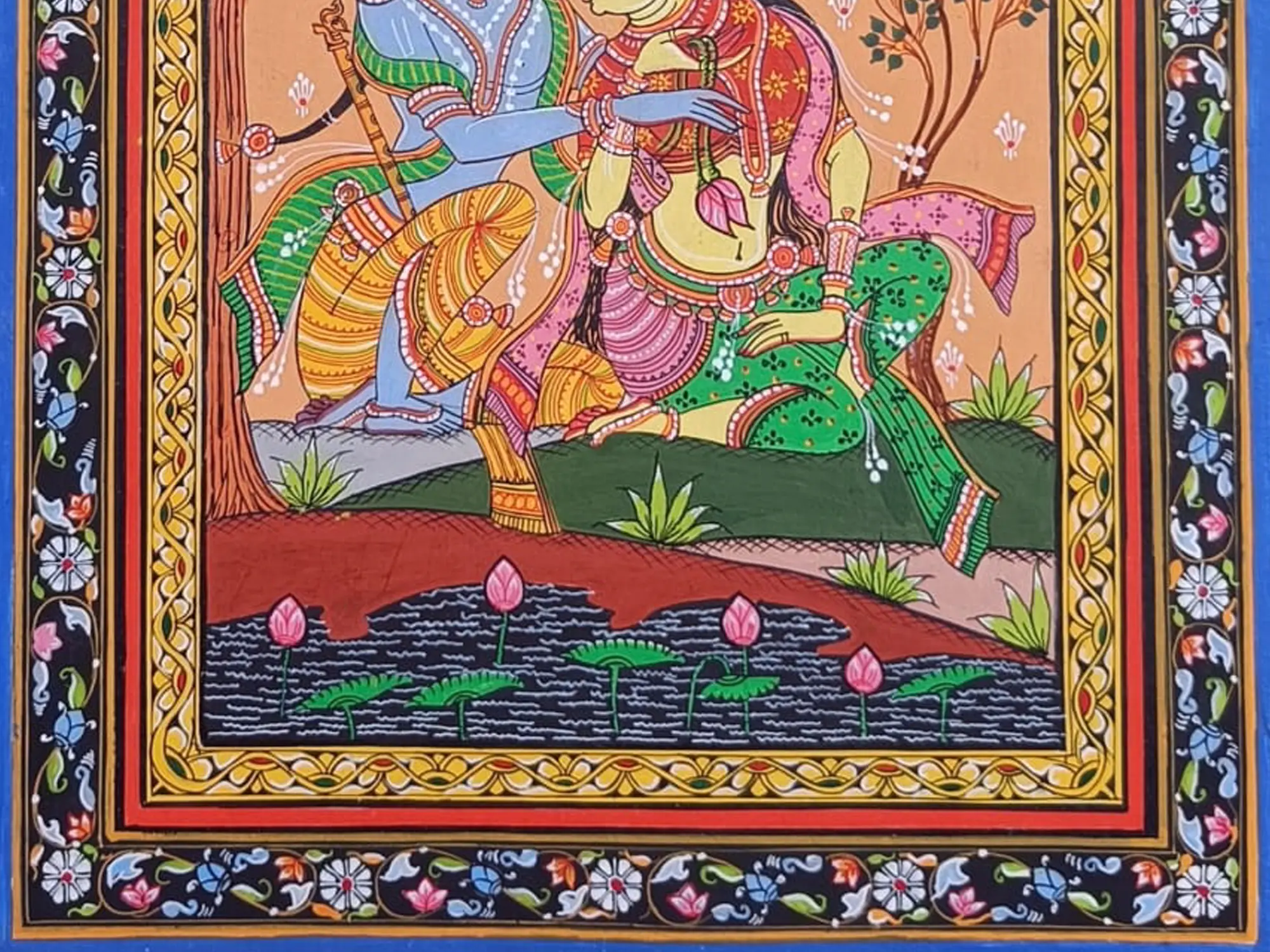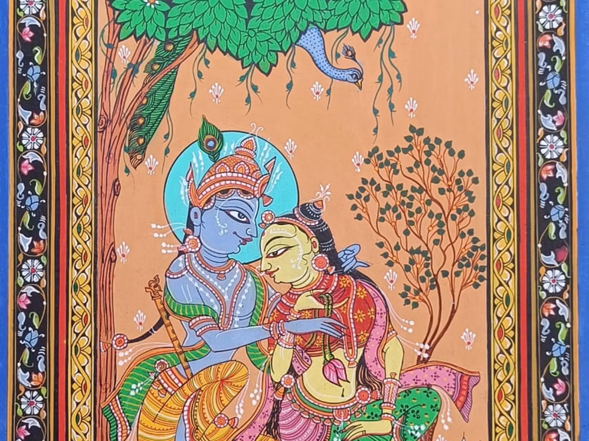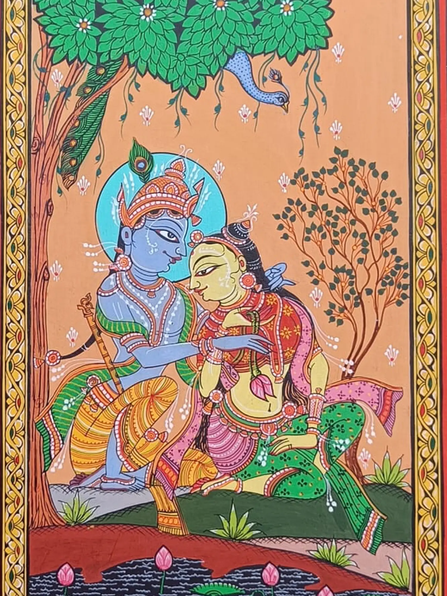 Experience the divine romance of Radha and Krishna with "Bond of Love," a captivating Patachitra piece on canvas, painted with natural colours. Their eternal love story transcends time and space, intertwining hearts in a sacred bond of devotion and passion. Through intricate details and shades, this artwork captures the essence of divine love, echoing the timeless philosophy of devotion and surrender.