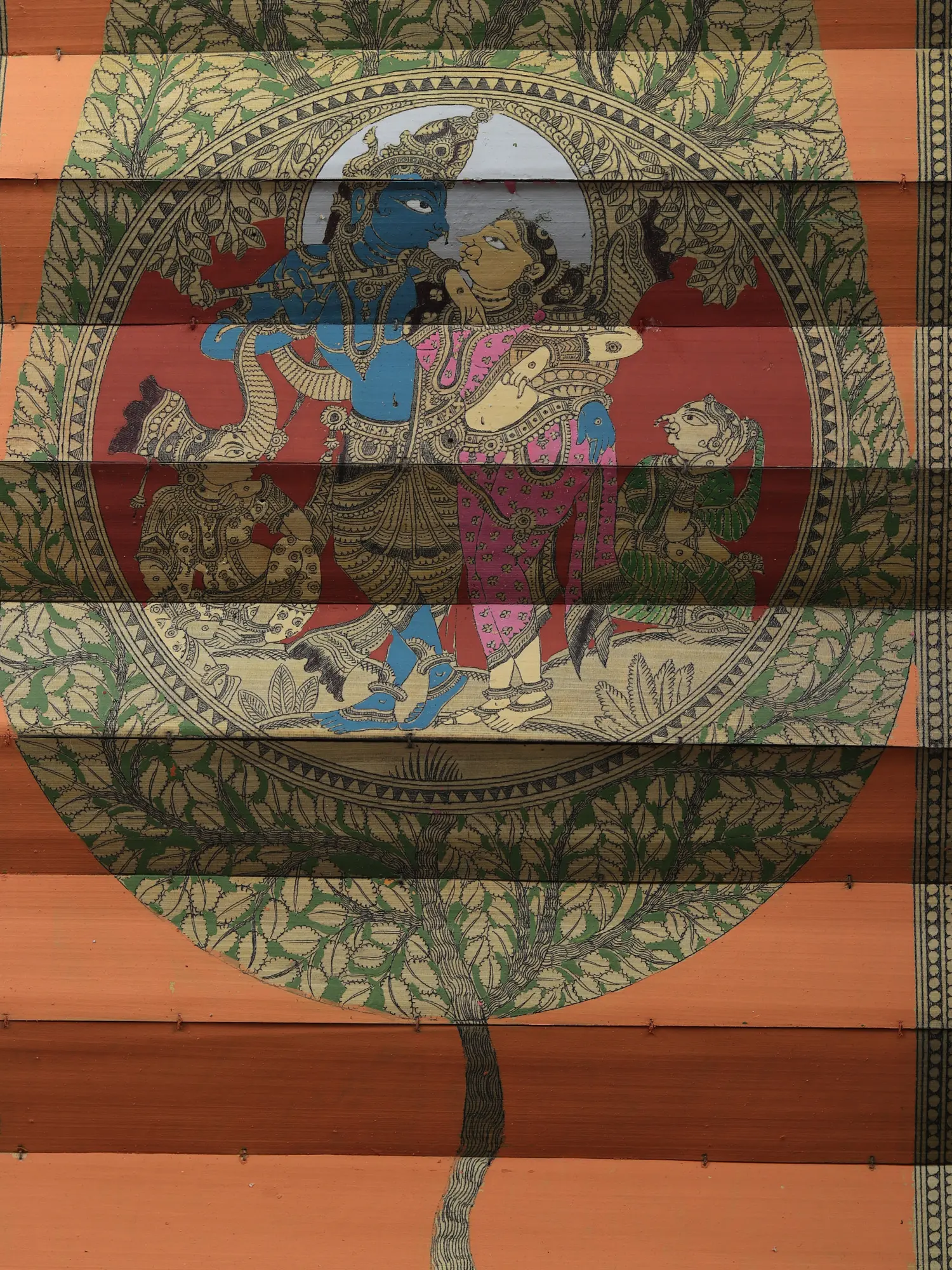 This Radha Krishna Inside the Tree, Pattachitra Painting on Palm Leaf by Rabi Behera depicts the divine pair of Lord Krishna and Radha having a leisure time while two gopis adore the pair. The most attractive part of this painting is the pair of Radha and Krishna beautifully placed inside an Ashok tree. It looks like the tree is protecting the sacred image of the deities. The burnt orange color around the tree and the black frame creates a magical effect.