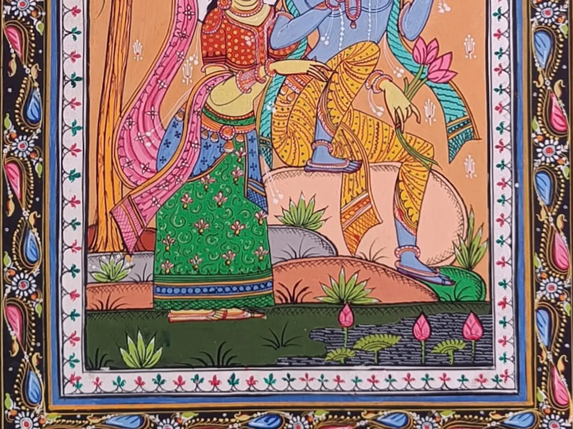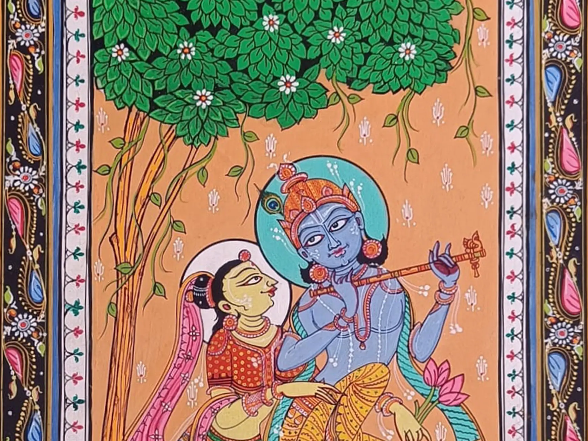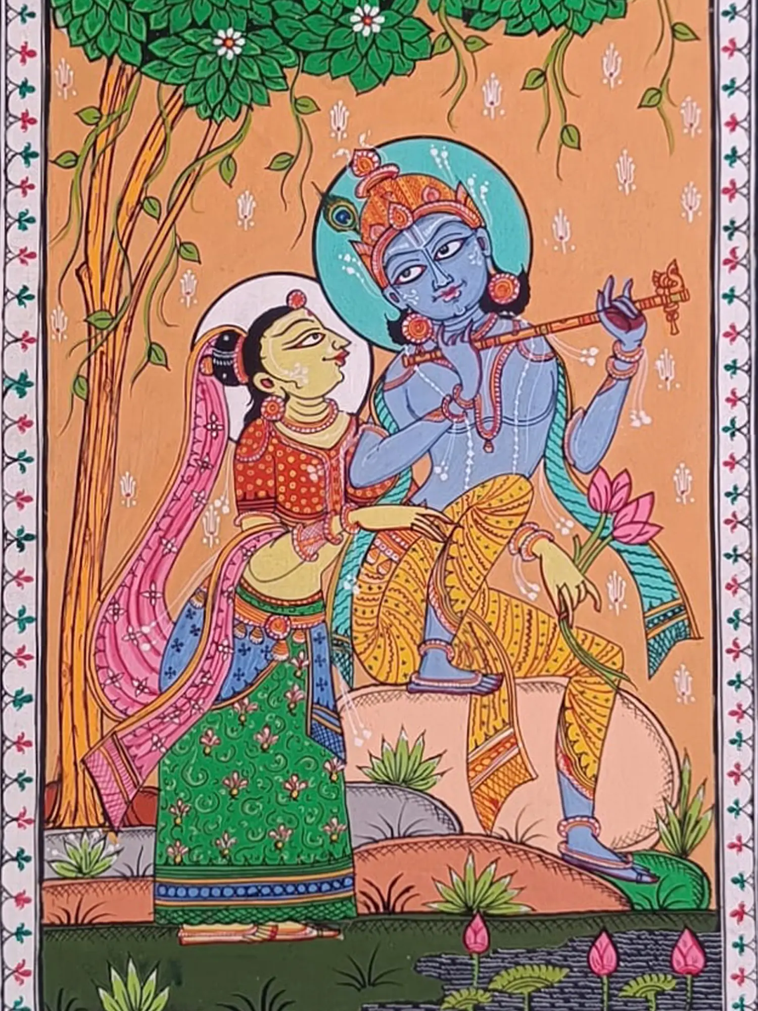 Immerse yourself in the joyous melody of Krishna's flute with this mesmerising canvas adorned with natural colours. As Radha listens to the enchanting tunes of Krishna's flute, her joy radiates like a beacon of divine ecstasy, transcending mortal realms. This artwork encapsulates the philosophy of surrender and blissful union, where lovers merge in ecstatic devotion, lost in the divine rasa of love's eternal embrace.