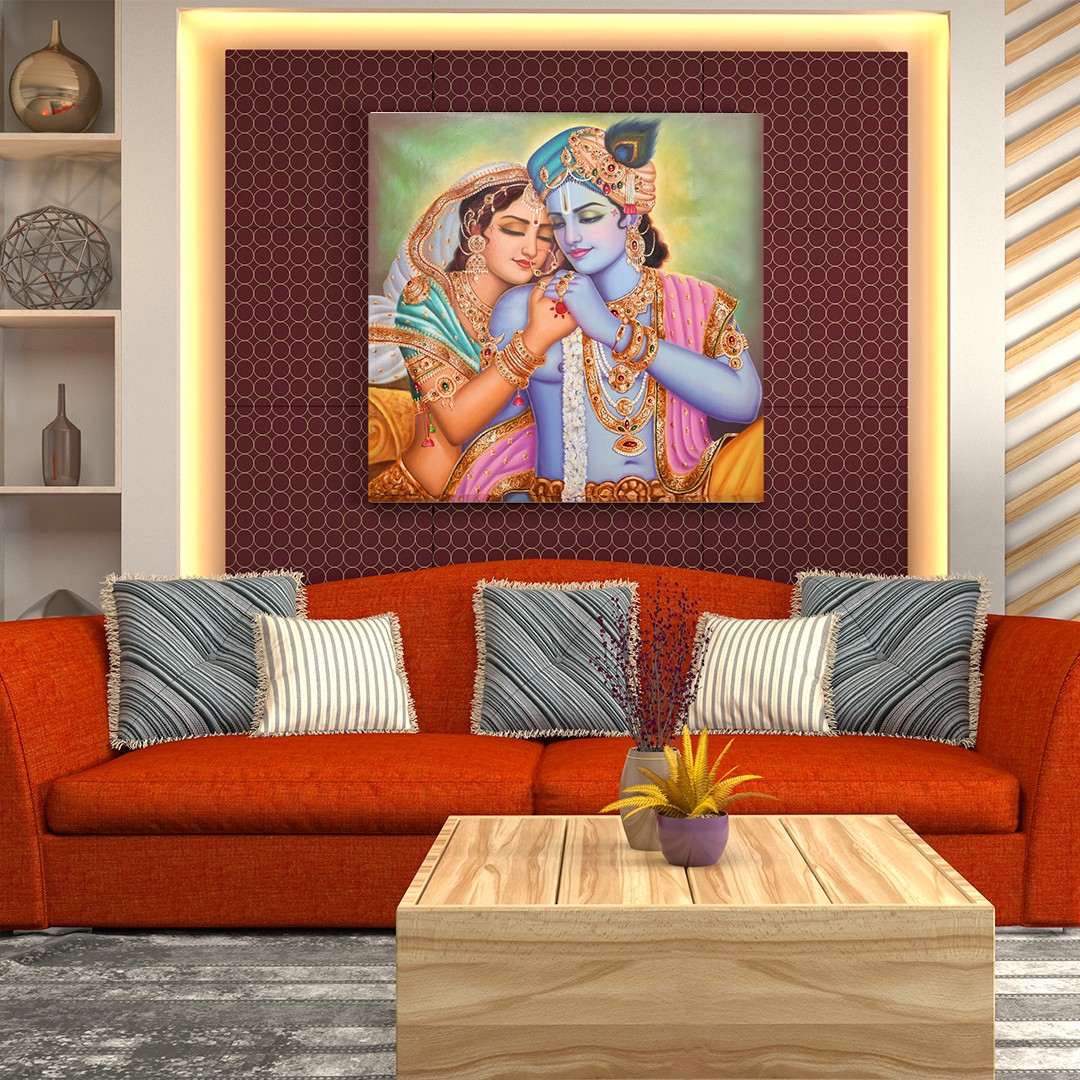 Krishna is the ocean of divinity, love, and beauty and Sri Radha is the stream that unites with him, replenishes him, and is never separated from him. A representation of this unmatched togetherness is this oil painting of Radha-Krishna. The duo is holding each other’s hands warmly, with their heads huddled together.