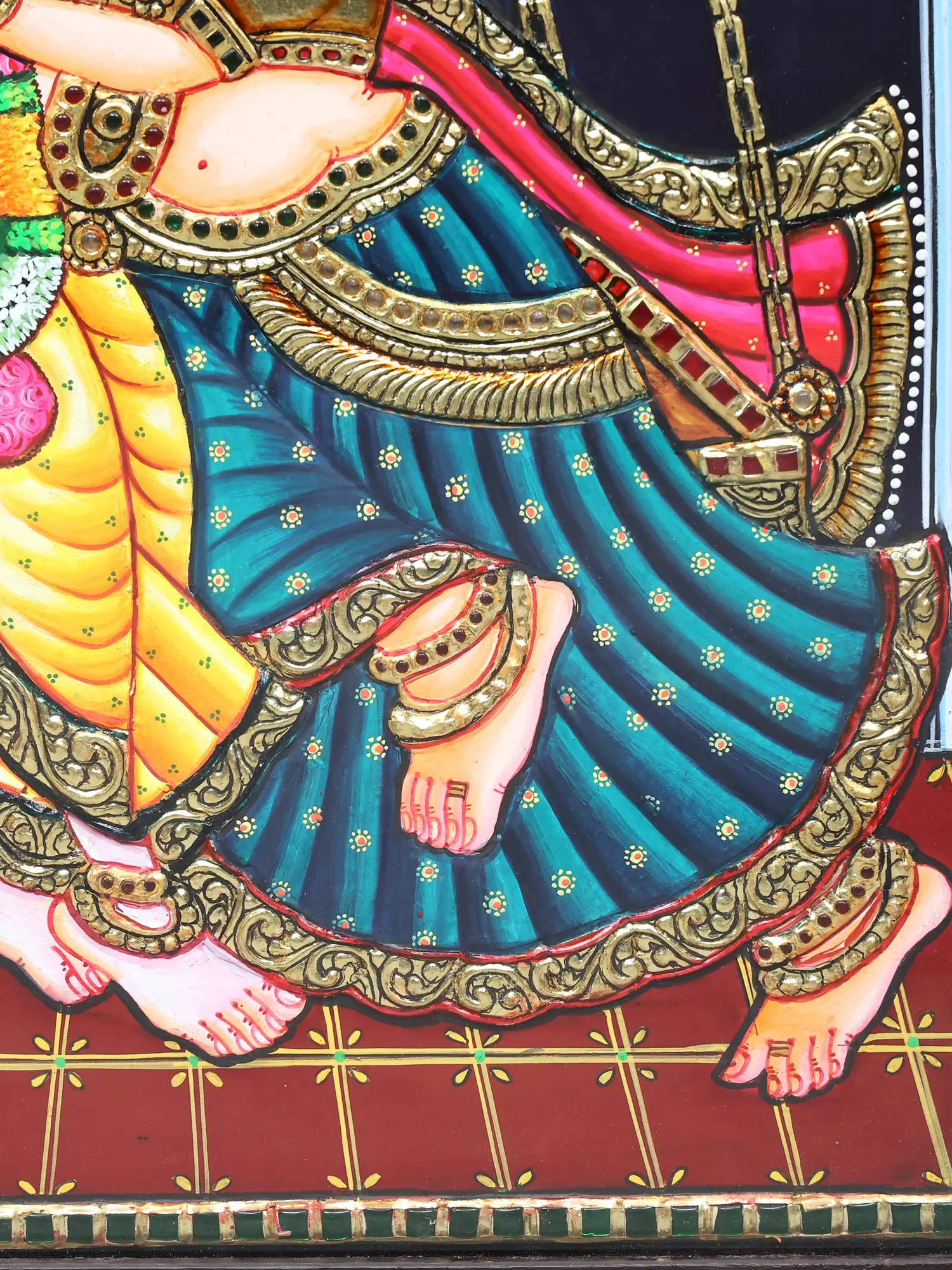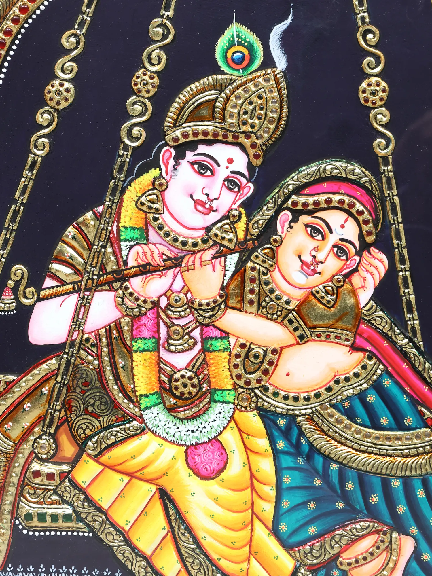 Radha Krishna on Swing | Traditional Colors with 24 Karat Gold | Tanjore Painting with Frame