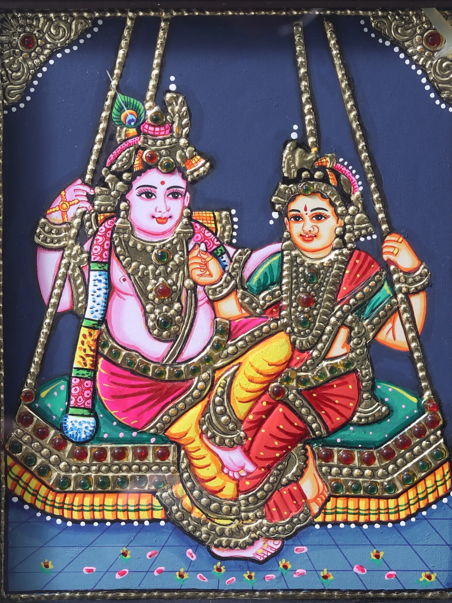 Radha Krishna swinging is a spiritual depiction of the merger of the individual soul with the almighty power. It represents the joyful condition of oneness and spiritual trance experienced by the devotee in divine unity with the divine. This Tanjore artwork in traditional colours with gold work elegantly conveys the theory of the oneness of Atma and Parmatma. Radha, the personification of devotion, looks fondly at Krishna, who is depicted with entrancing beauty and elegance.