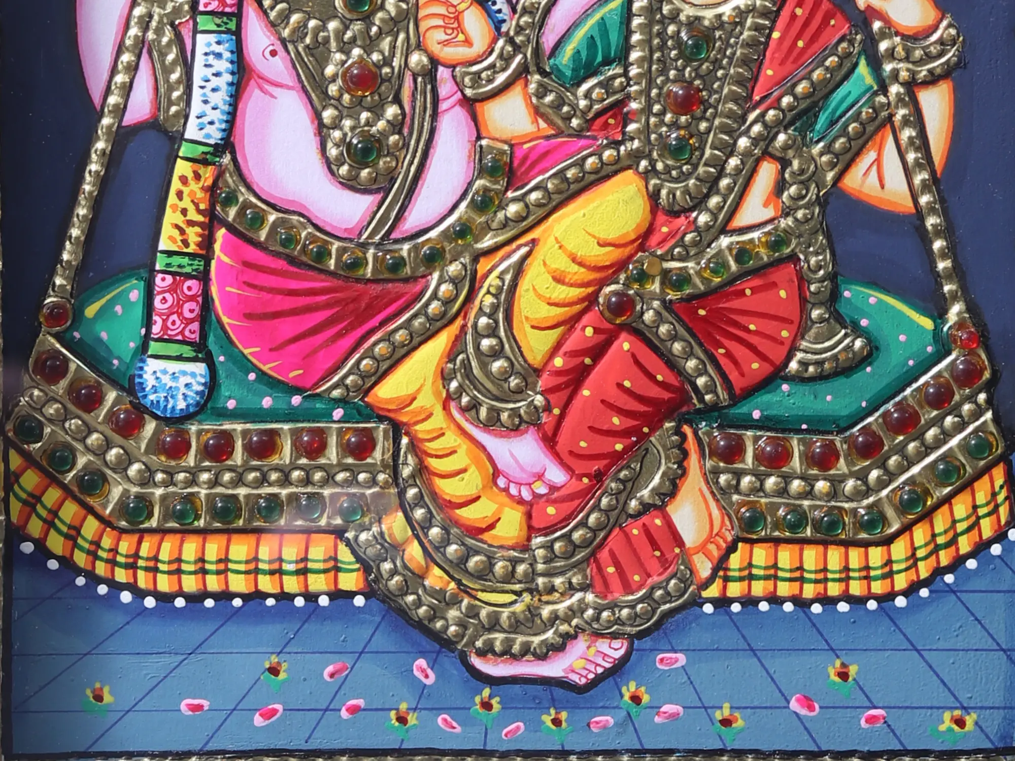 The inclusion of semi-precious stones and gold plating elevates the picture to a divine level, making it suitable for a prominent position in a palatial home.
