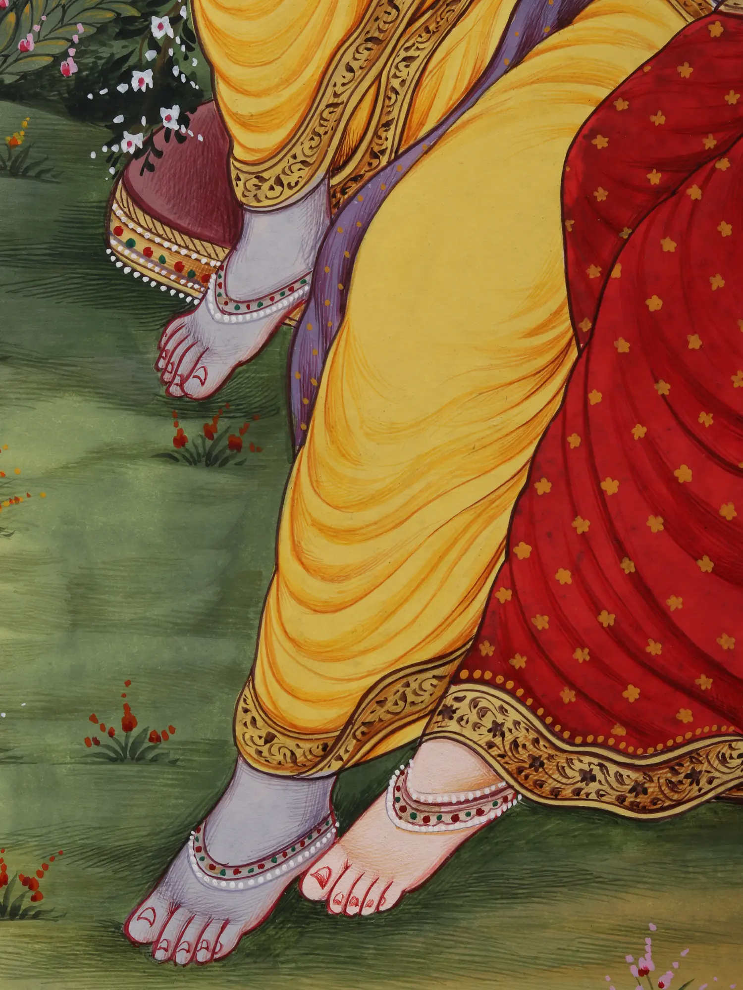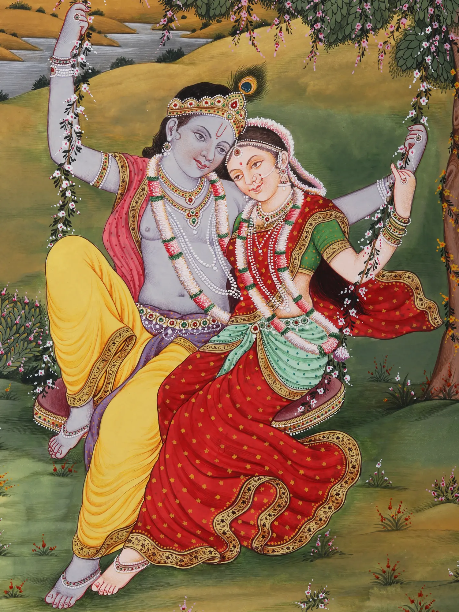 This exquisite watercolor painting captures the divine couple, Radha and Krishna, in a moment of tranquil bliss. They are depicted gracefully seated on a swing, surrounded by lush greenery and a serene landscape. The soft, delicate strokes of watercolor lend an ethereal quality to the scene, evoking a sense of peace and harmony. Krishna, with his distinctive bluish hue, gently holds the swing, his gaze tenderly fixed on Radha. Radha, adorned in vibrant attire and delicate jewelry, reciprocates his loving glance. The artist has masterfully captured the essence of their eternal love, a love that transcends the material world and embodies the purest form of devotion. The gentle sway of the swing symbolizes the ebb and flow of life, while their unwavering presence together signifies the constancy of love amidst the changing tides. The artist's skillful use of color and detail brings the scene to life, inviting the viewer to immerse themselves in the divine love story of Radha and Krishna.