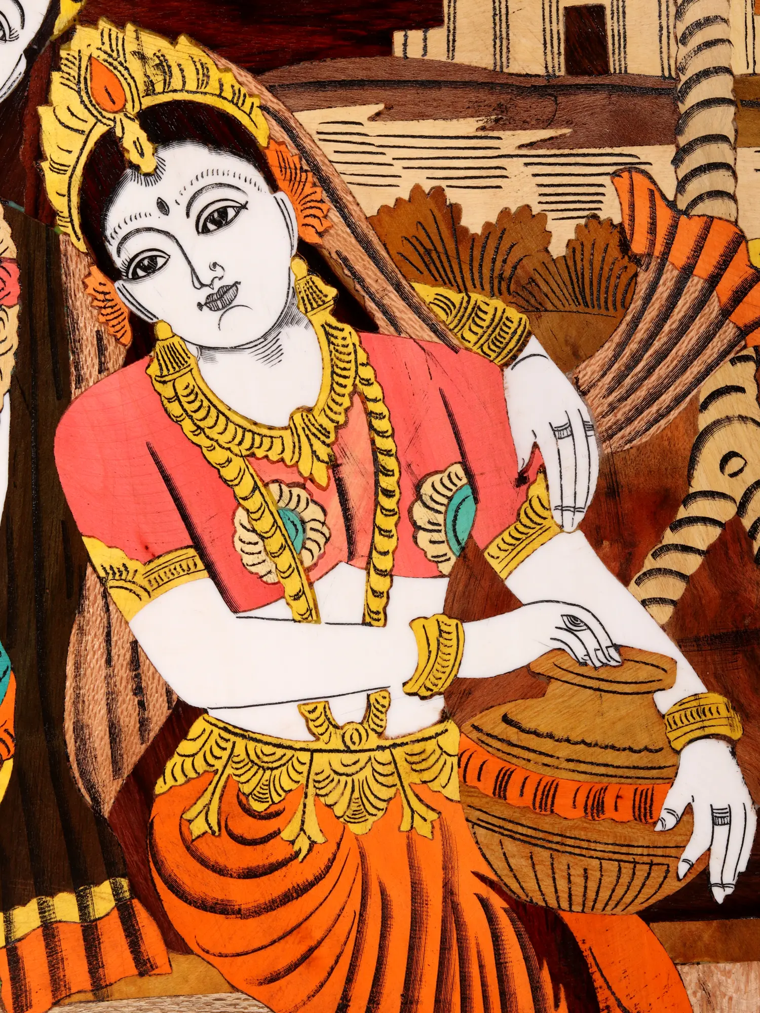 You'll appreciate the captivating details, from the intricate patterns adorning their garments to the gentle sway of the swing and the lush foliage surrounding them. The composition, measuring 36 inches in height by 24 inches in width and 1 inch in length, offers a substantial yet graceful presence. The rich, earthy tones of the wood are complemented by the vibrant hues of the figures and the serene backdrop, creating a visually stunning narrative. The subtle inclusion of birds and a temple in the distance adds layers of symbolic meaning and visual intrigue.