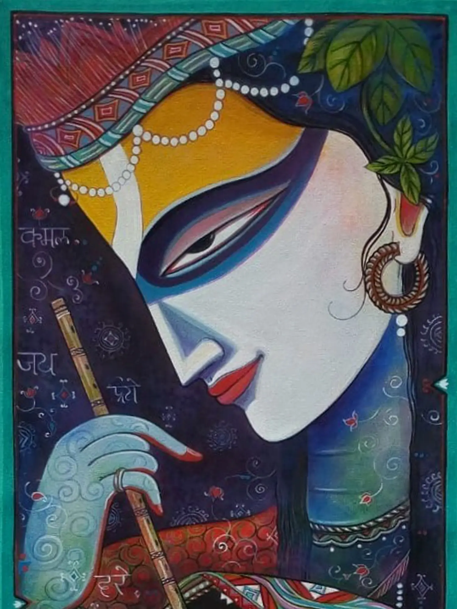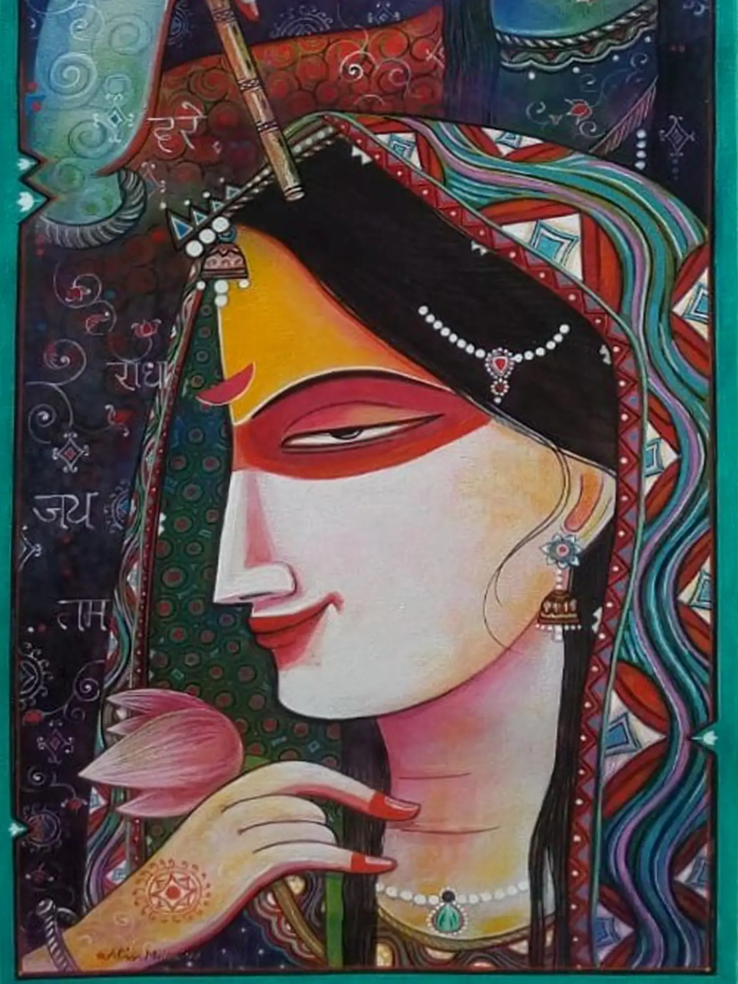 Gods whose love remains an ideal for humans, Radha-Krishna in Hindu culture and the world are symbols of the sweetness of pure love. This beautiful acrylic on canvas by Atin Mitra is an artistic ode to the divine duo, who enliven the painting with their ambrosial beauty. Krishna, adorned with ornaments of pearls, leaves, and fine garments, holds his flute in his hand, with Radha on the lower section of the canvas, dressed in traditional attire and jewelry, with a lotus in her hand.