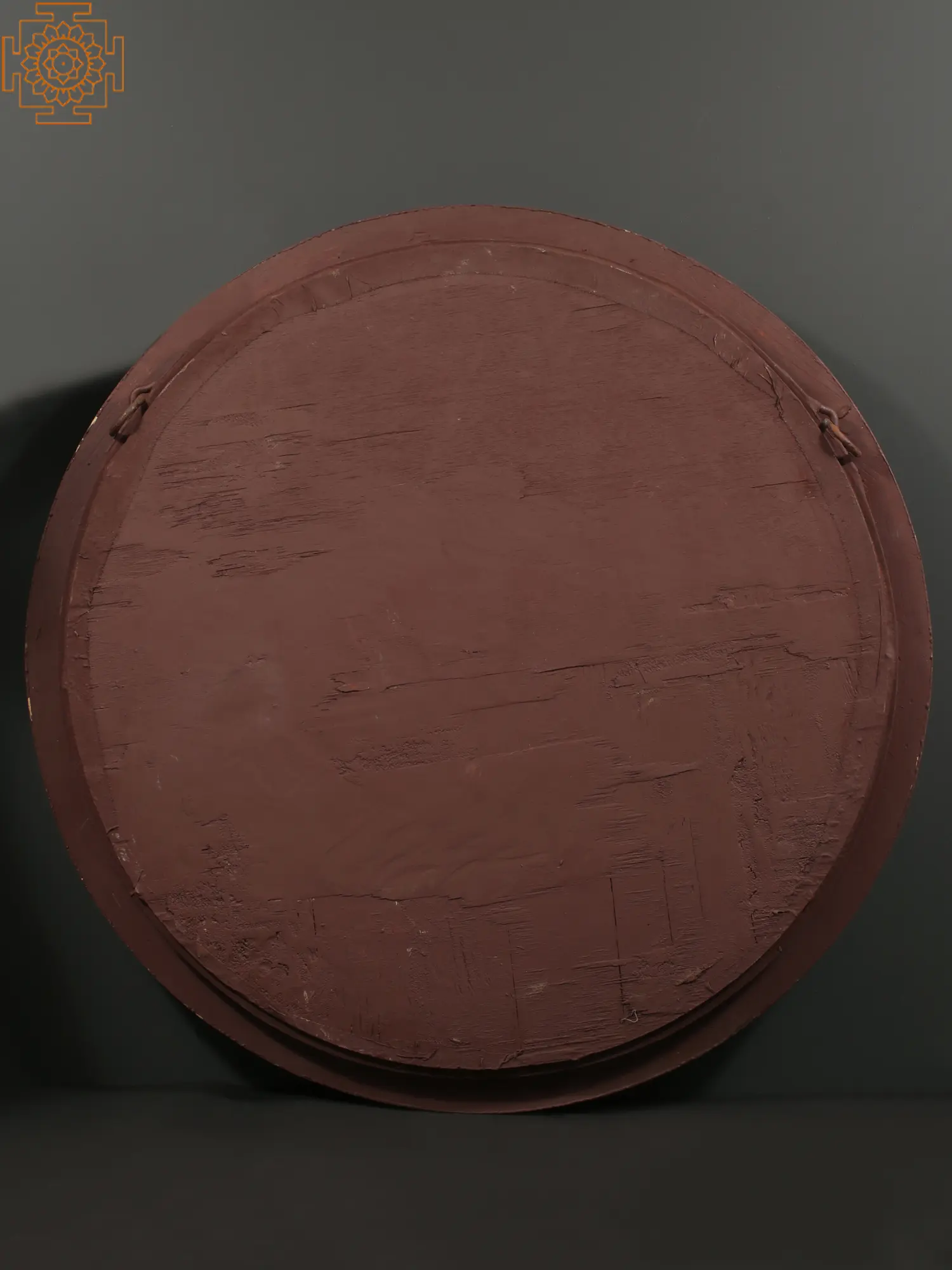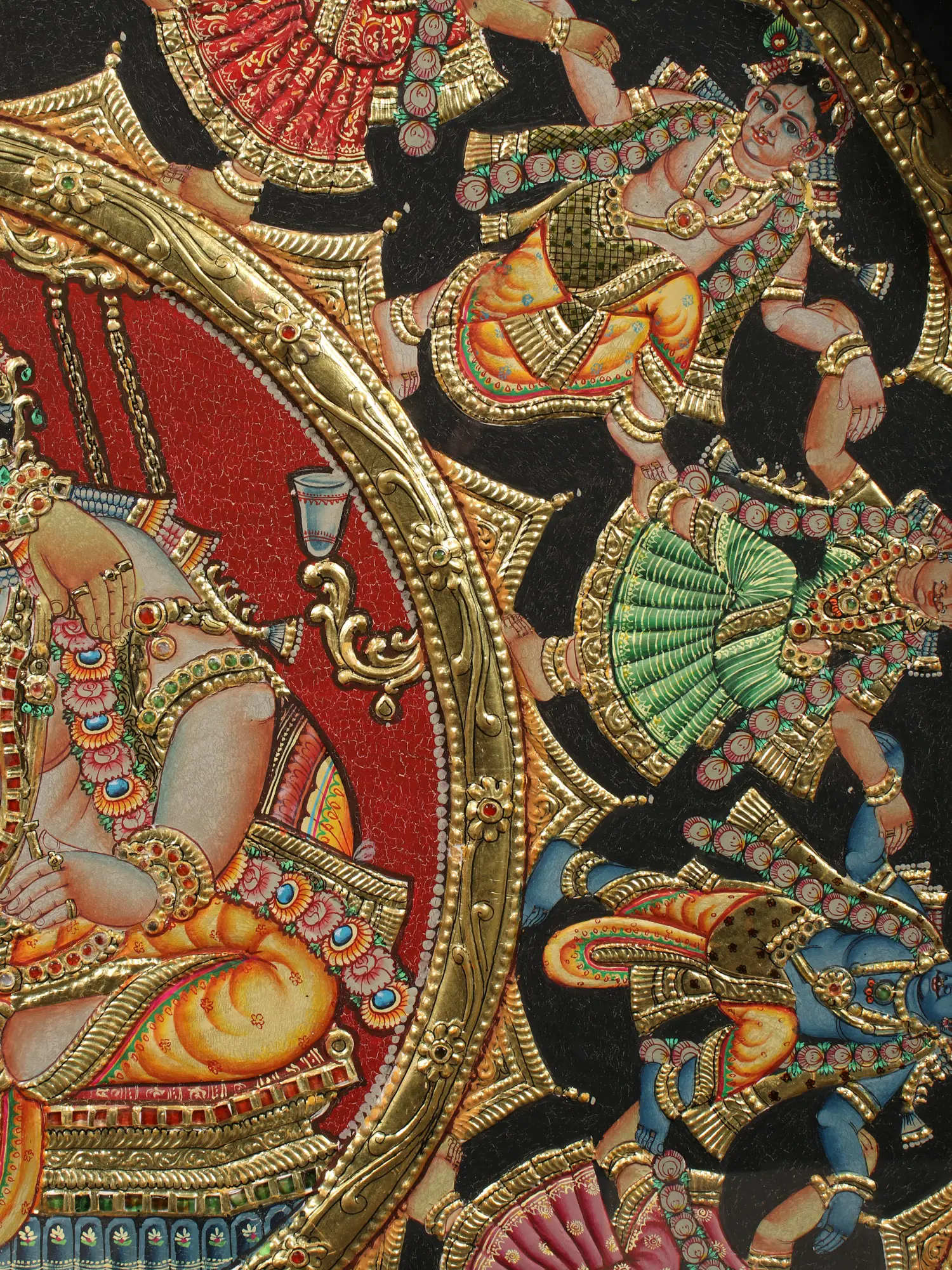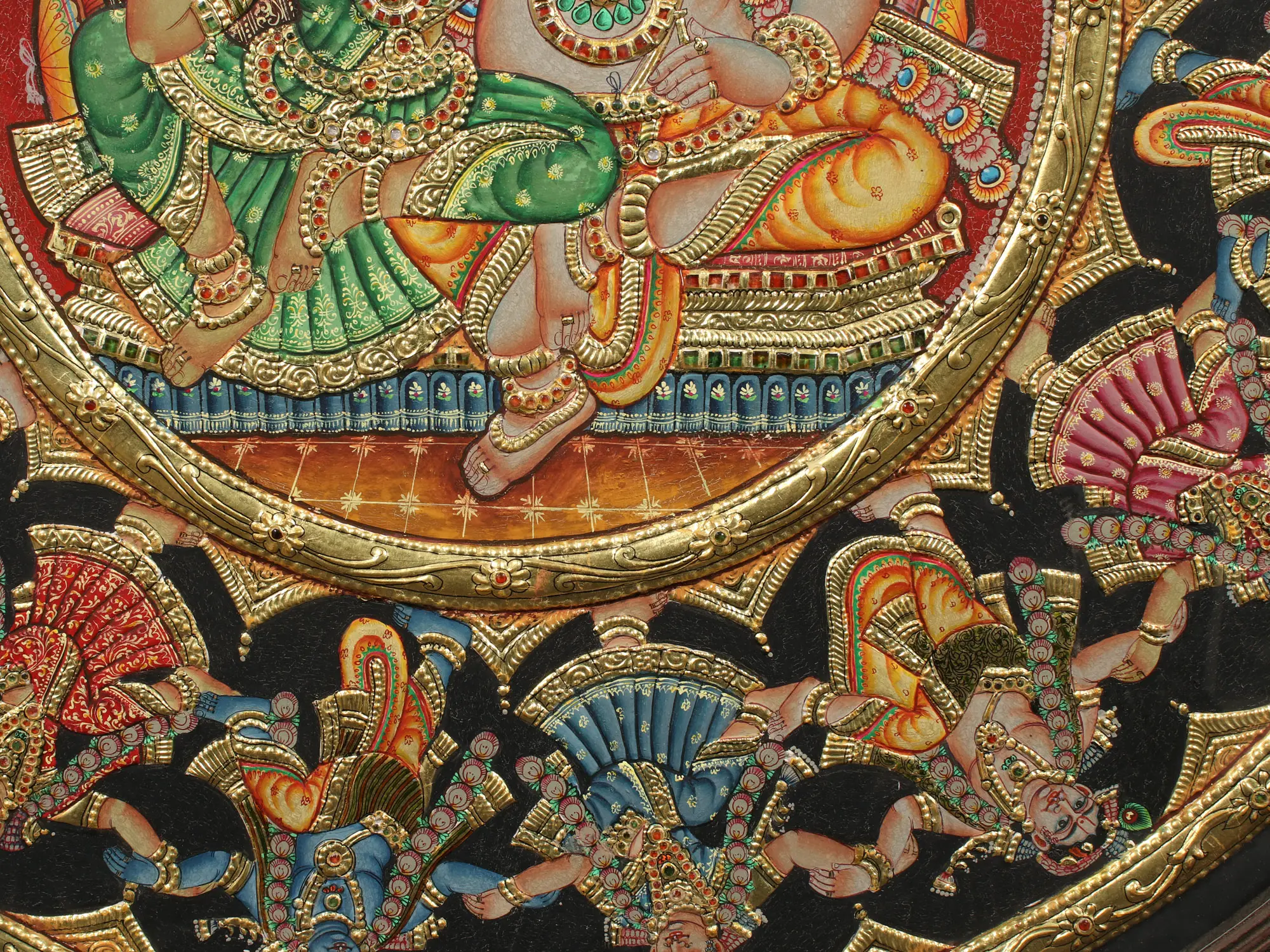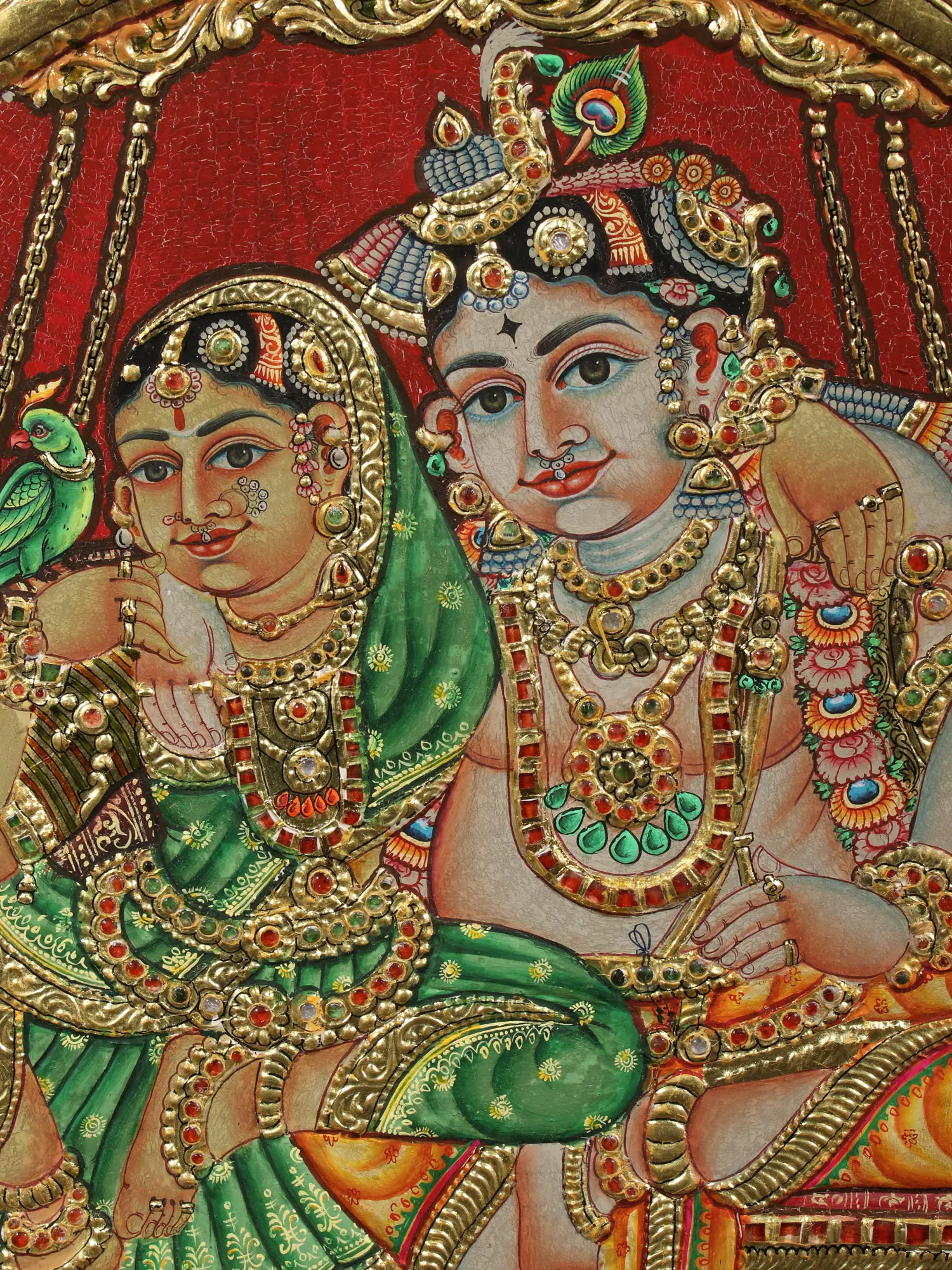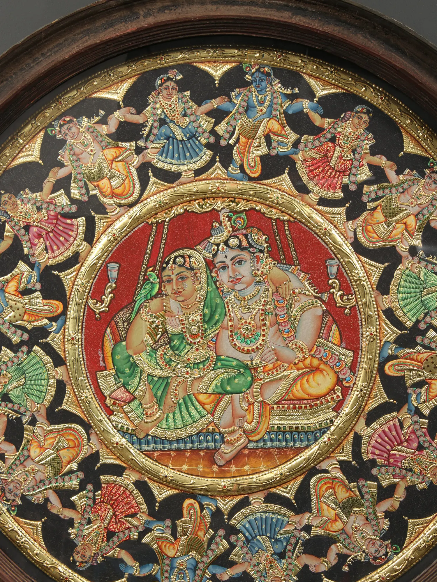 The Rasa-Mandala (circle formed by Krishna and Gopis during the performance of Rasa), is a profound symbol of the unhindered flow of divinity between Kanha and Gopikas, when they become one during Maha Rasa. Drawing on this symbolism, the Tanjore painting is placed within a circular vintage teakwood frame. In the outer ring of the artwork are Gopis standing with Krishna in between them, recreating the bliss and heavenliness of Rasa. The center of the artwork depicts Krishna and Sri Radha seated regally on a swing, with Krishna adorned in a Pitambara (yellow attire), and Radha wrapped in a green saree, representing the youthfulness and fecundity the emanation of Sri Lakshmi embodies.