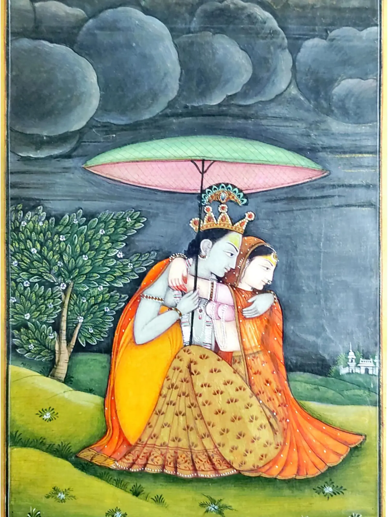 The use of refined lines and vibrant colors, unveils the splendor of Vrindavan, in this artwork which also derives from the traditional Baramasa paintings, based on the depiction of the twelve months or seasons. The dark clouds, thunder, and Radha-Krishna as the ultimate Nayaka and Nayika (hero and heroine) representing the joy and exhilaration of the month of Sawan or monsoon make this painting a rich amalgamation of aesthetics of India.