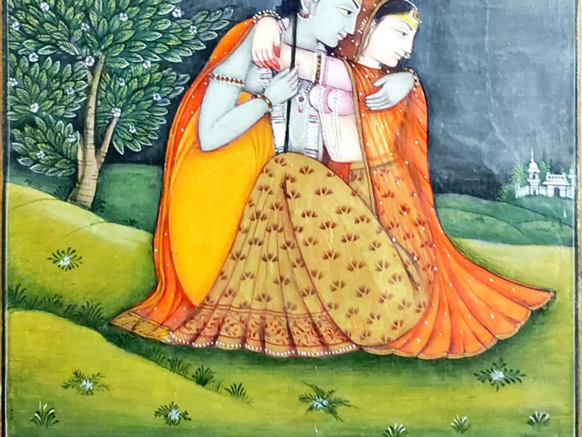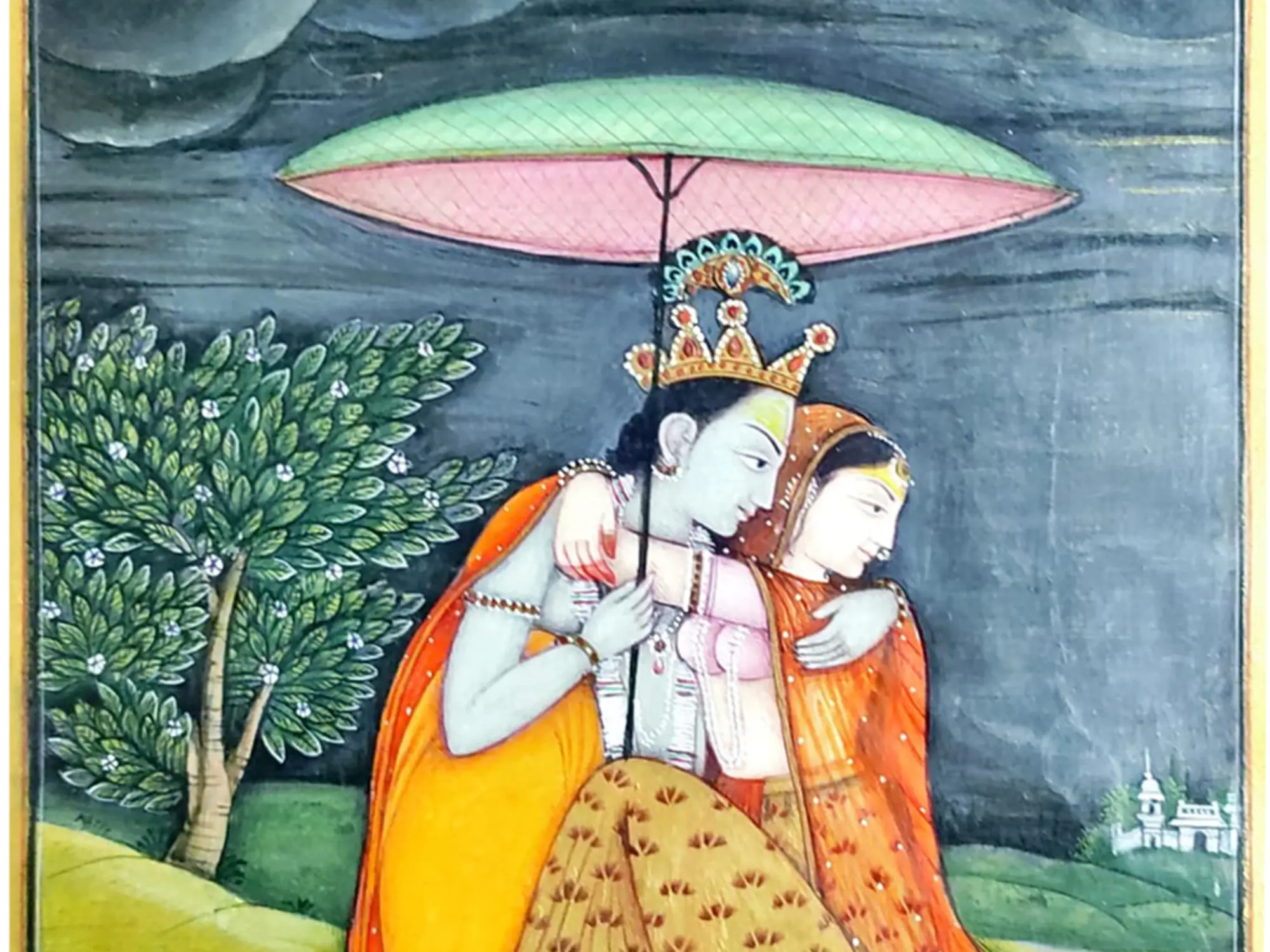 Radha and Krishna on their meeting in the heart of Vrindavan are disturbed by the darkened, rain-filled clouds, and gather to be immersed in the ambrosia of the divine duo. Inspired by the Kangra paintings on Jaideva’s Gita Govinda, this watercolor on canvas painting by Gaurav Rajput depicts Radha-Krishna on a hilltop, huddled under an umbrella, as the nimbus clouds storm the skyline and thunder touches the ground, near the buildings on the right side of the canvas. On the left, a tree blooms beautifully, symbolizing the bloom of love in the heart of the heavenly couple.