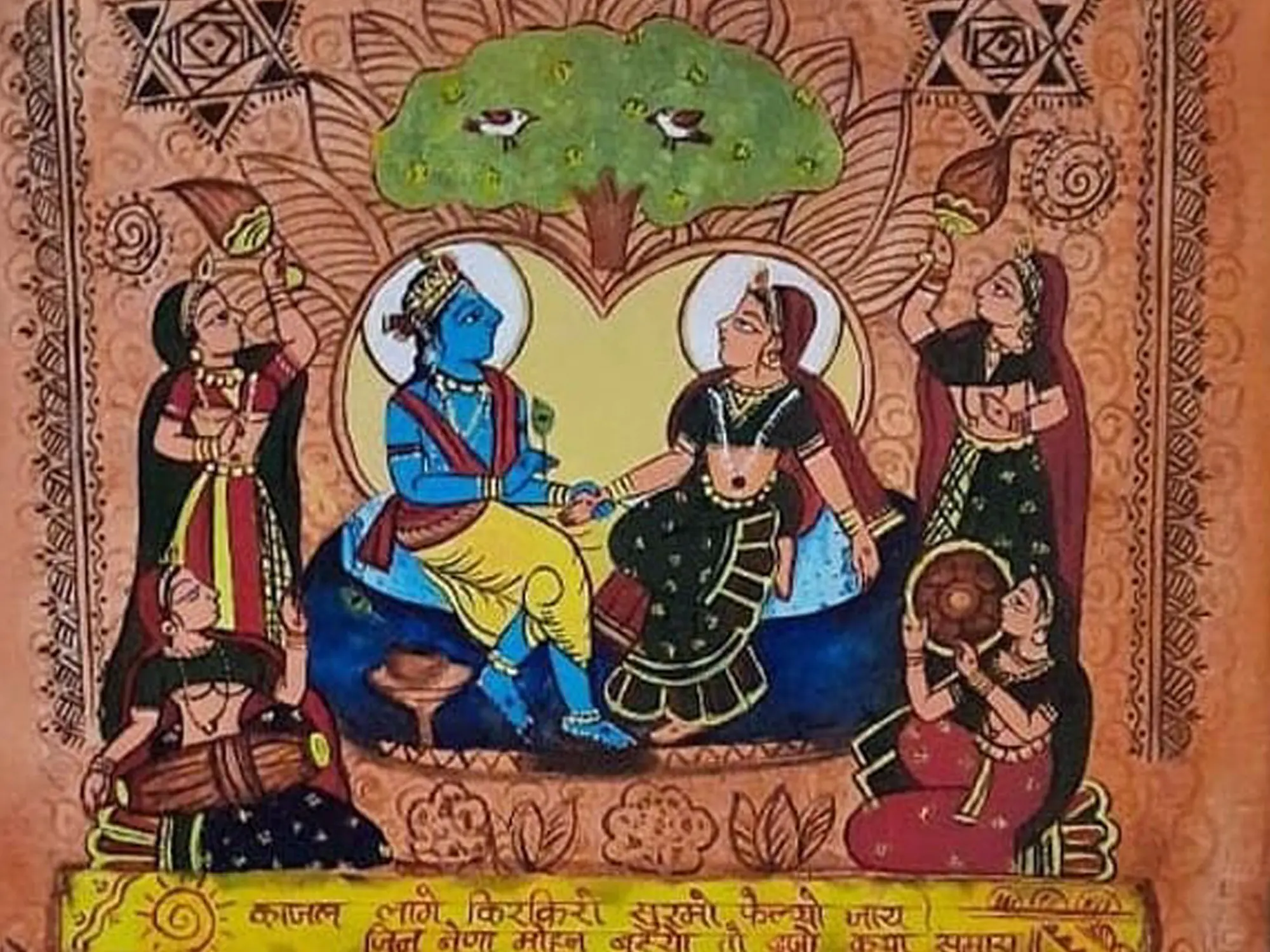 This artwork draws inspiration from the rich tapestry of Indian folklore and spiritual traditions, specifically the eternal love story of Radha and Krishna. Their devotion, often celebrated during festivals like Janmashtami, is a central theme in Bhakti poetry and art, symbolizing the soul's longing for the divine. The use of natural pigments further connects it to ancient artistic practices, grounding it in a cultural heritage that spans centuries.
