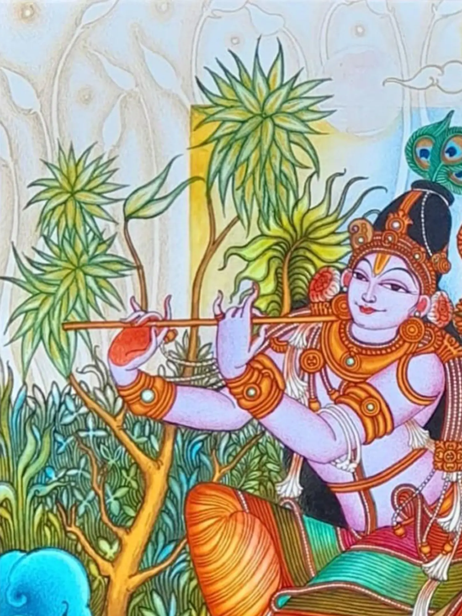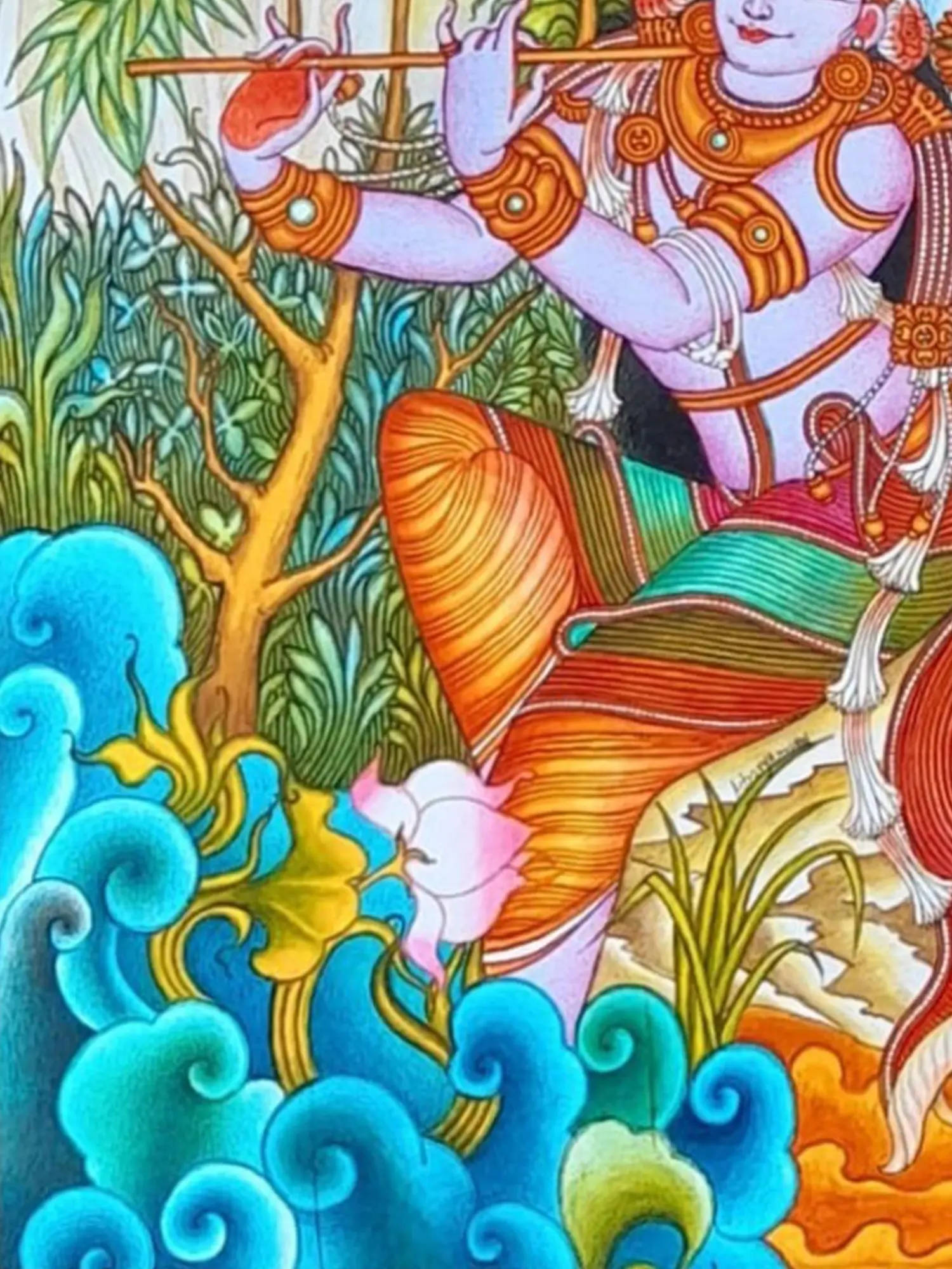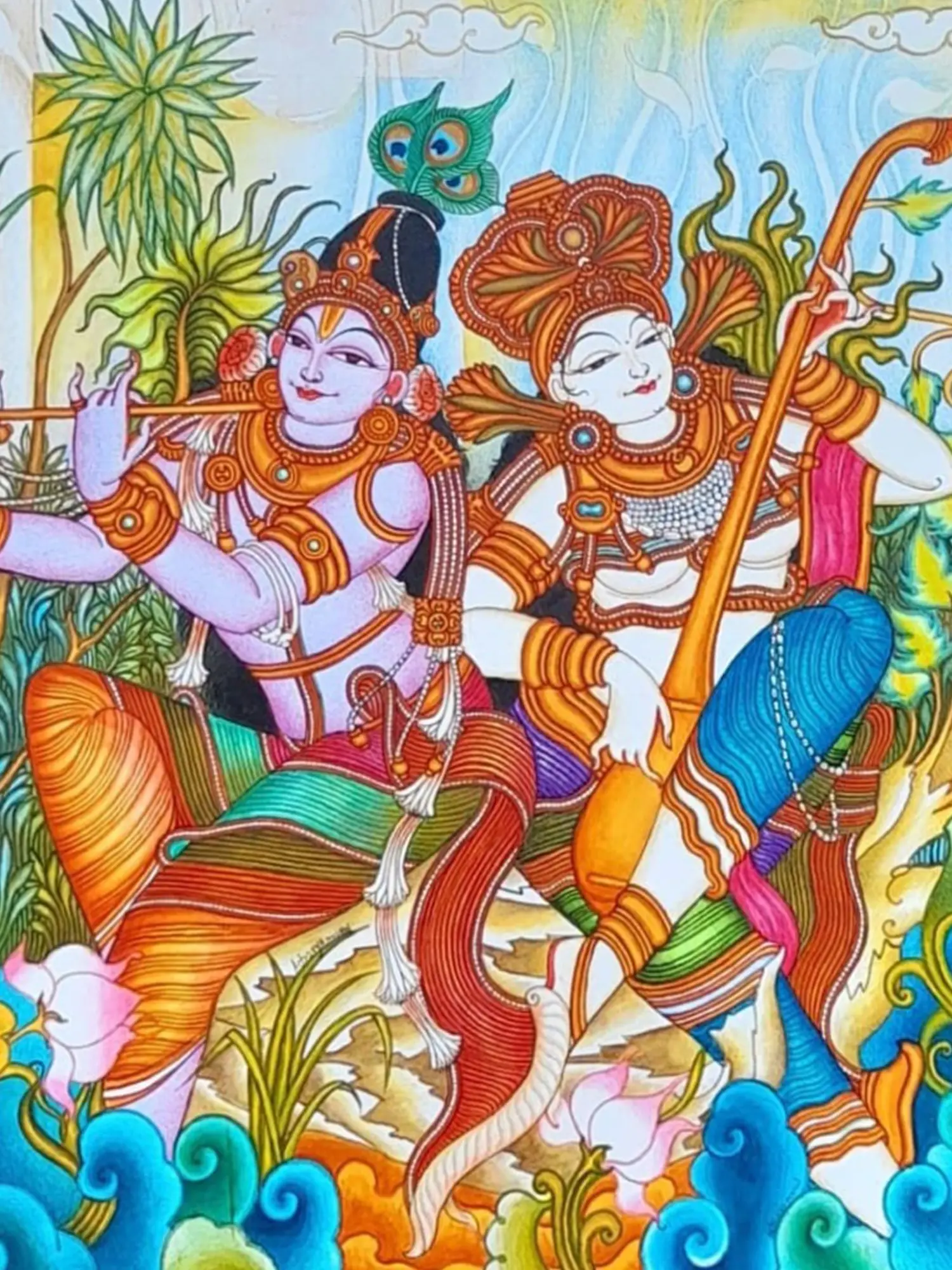 This artwork draws inspiration from the devotional narratives of Hinduism, depicting the divine couple, Radha and Krishna, in a scene of serene contemplation and shared melody. Kerala murals traditionally adorn temple walls, depicting epics and Puranic stories, imbuing spaces with sacred narratives. This particular rendition, capturing the essence of Vishnu Shreedhar, extends this spiritual legacy, allowing you to bring a piece of divine folklore into your personal sanctuary.