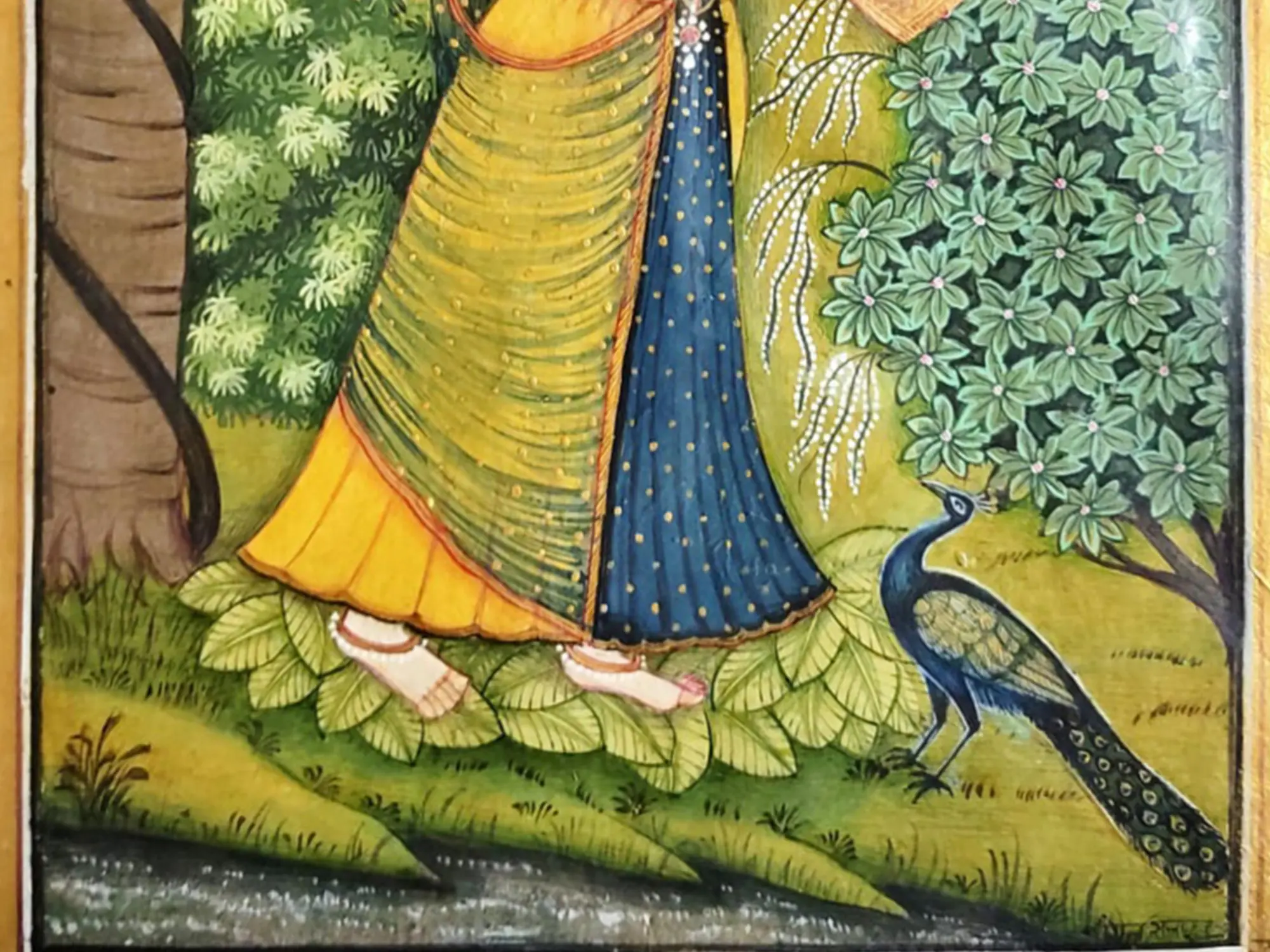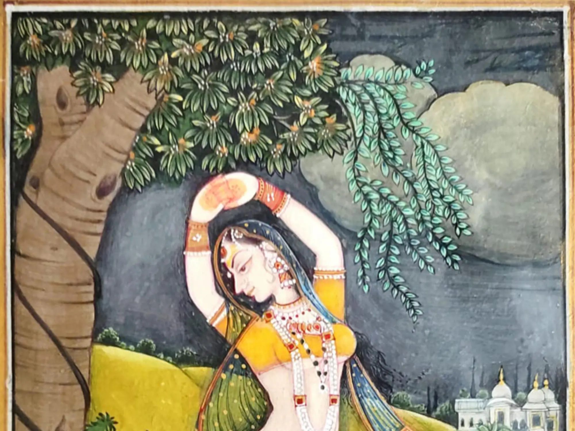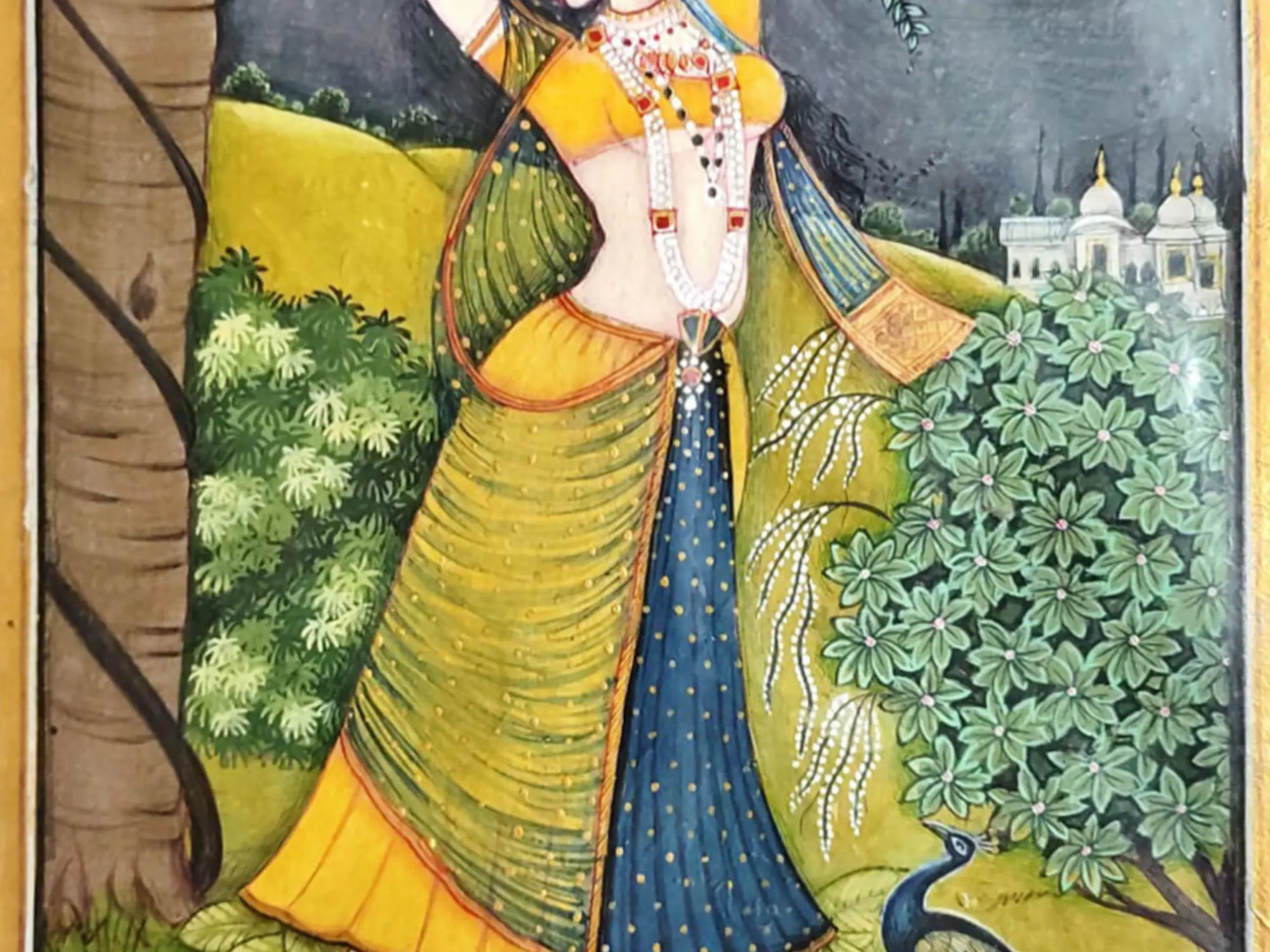 The Ragamala paintings, inspired by the poetic compositions and beauty of melodies, envision Raga and Raginis in enchanting forms, viewing which creates an experience similar to listening to the Raga or Ragini. In this watercolor painting in the idiom of Rajasthan’s famous Kishangarh style, the youthful maiden standing in the lap of nature is reminiscent of Ragini Kakubha, the musical melody that is believed to charm peacocks, who flock to her, immersing in her ethereal beauty. The maiden strikes a graceful posture, showcasing her heavenly beauty. The bushes and trees around bloom, nurtured by the fertile presence of the young beauty. A river flows in the foreground, shimmering magically, while a peacock stands on its bank, gazing at the Ragini, entranced by her charm!
