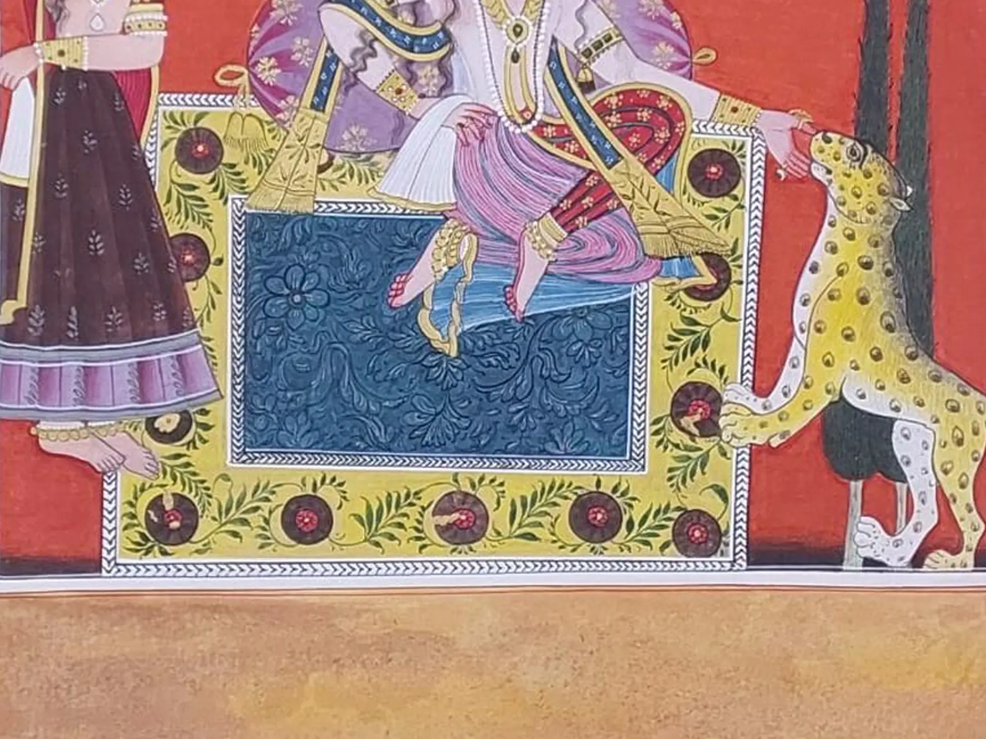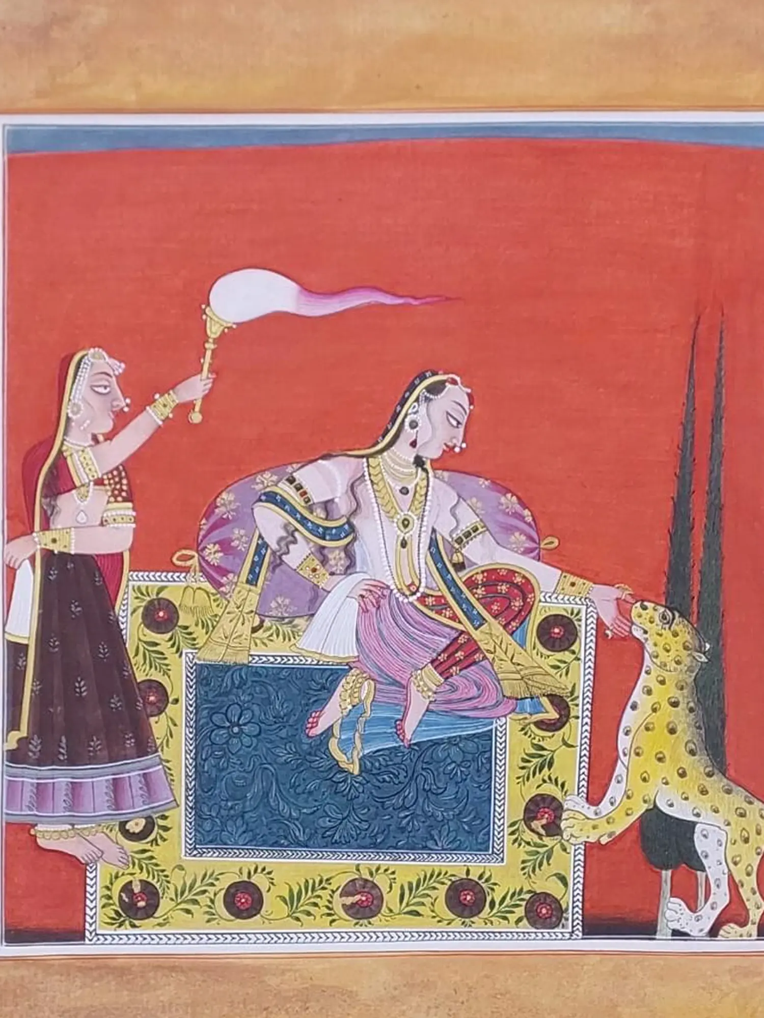 This captivating piece, measuring 11.60 inches in height and 11.20 inches in width, draws you into its narrative. The composition is framed by a deep, warm border, setting the stage for the central tableau. Within, a regal figure is seated, adorned in opulent attire, while a loyal attendant offers a graceful gesture. The presence of a majestic leopard adds an element of untamed grace and symbolic power. The interplay of vibrant crimson and the intricate patterns, highlighted by the gleam of real gold, creates a visual richness that captivates the eye.