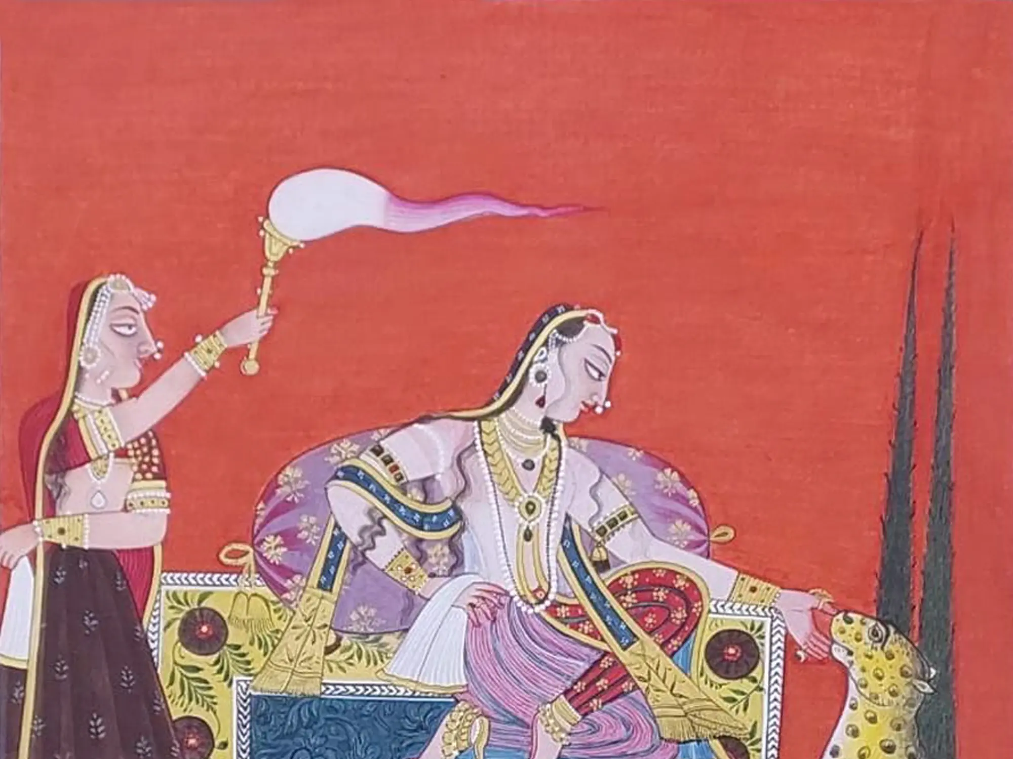 This artwork is a visual interpretation of "Ragini Dipak," one of the most profound ragas in Indian classical music. Associated with fire and warmth, Dipak Raga is said to evoke intense passion and light when sung correctly. The Basohli school, renowned for its bold colors and dramatic compositions, masterfully captures the essence of this melody. This piece connects you to a rich heritage of storytelling through visual art, where each motif and color choice carries symbolic weight.