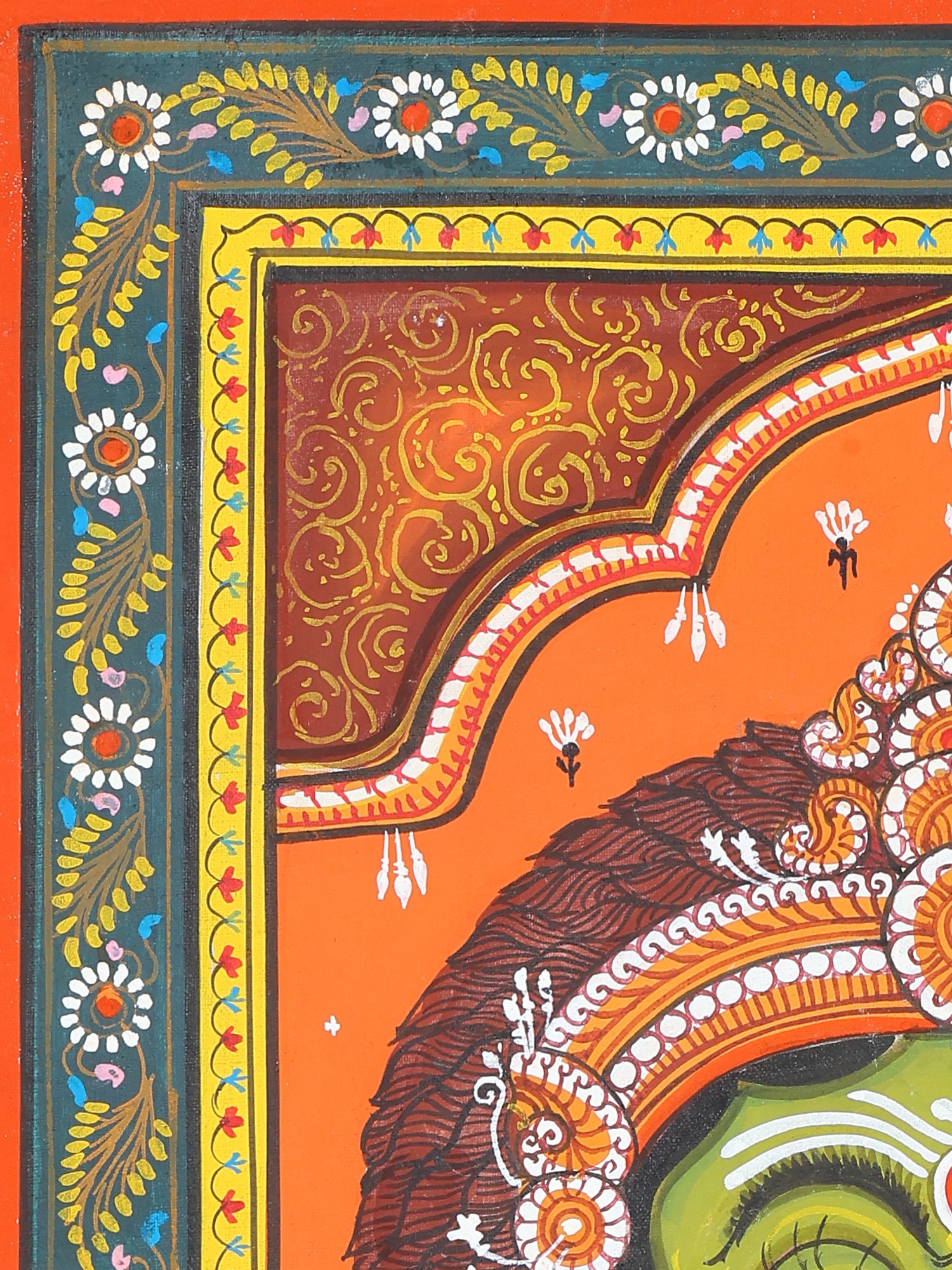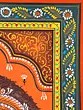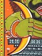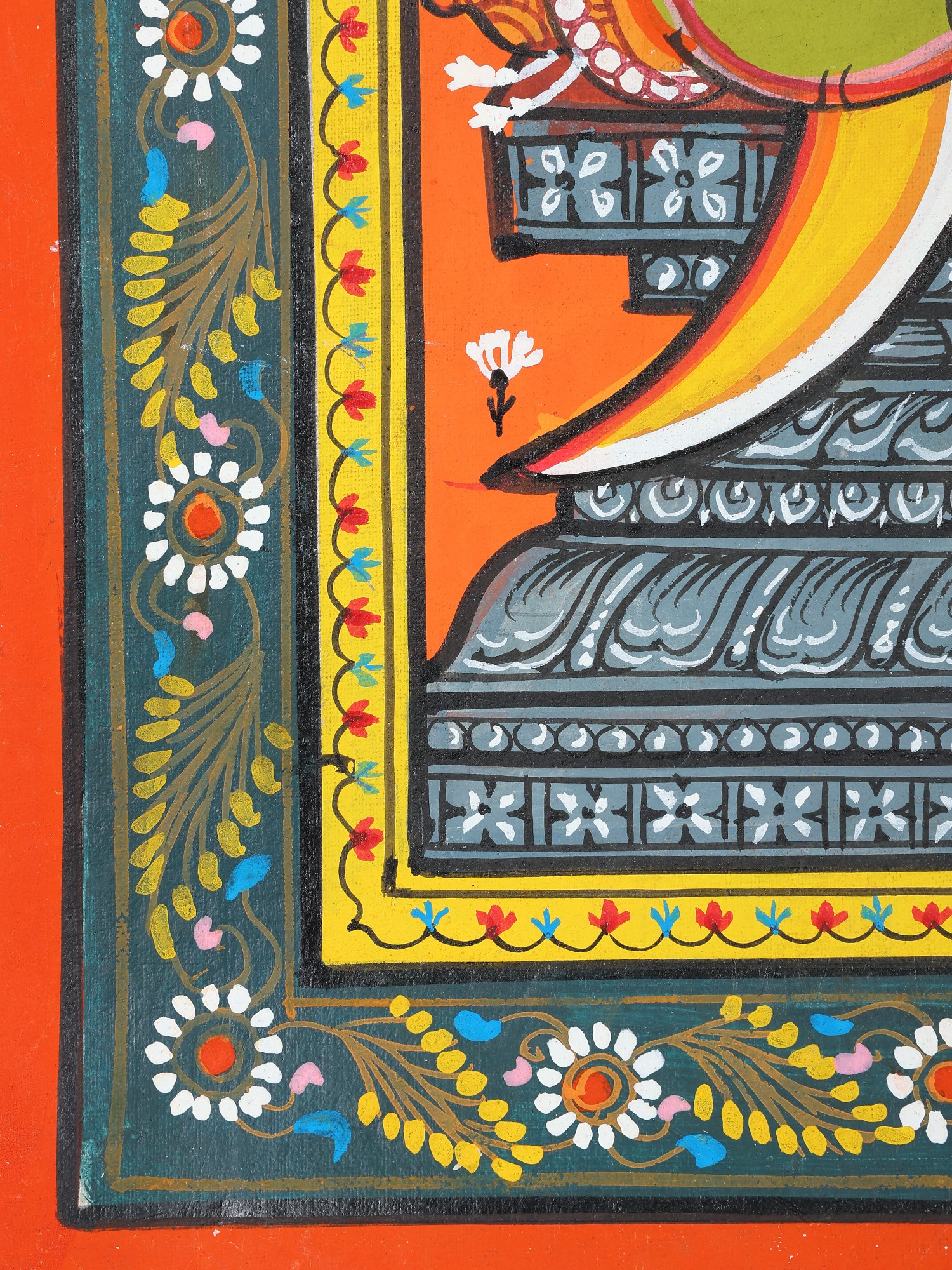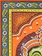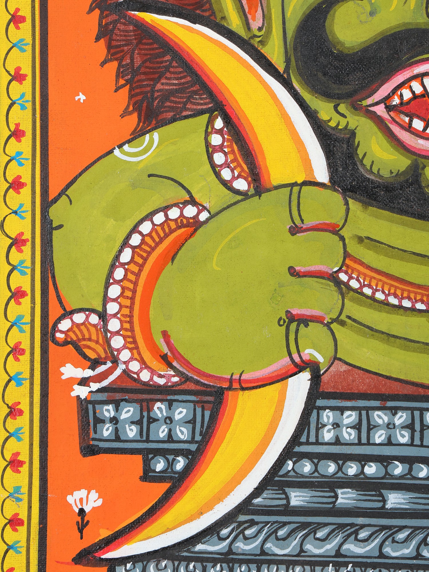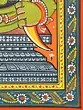 The artist now makes a double-lined border on all four sides of the canvas. The local artists are so expert in painting that they do not draw figures and motifs with pencil but directly draw them with a brush. The paint brushes that the painters use are made of the hair of domestic animals, a bunch of which is tied to the end of a bamboo stick. The figures are now painted with natural colors using the indigenous brushes. The outline is thickened with black color.