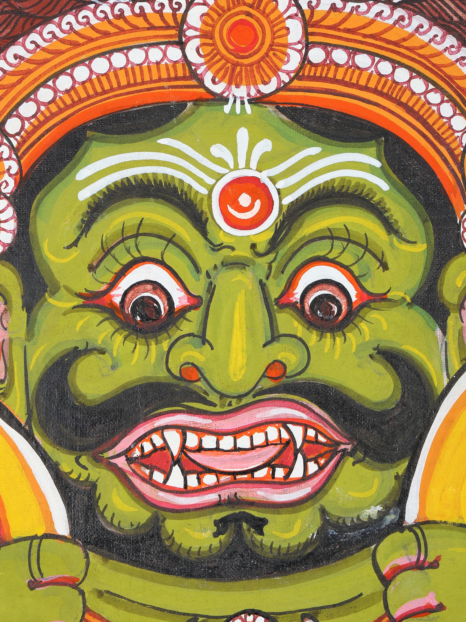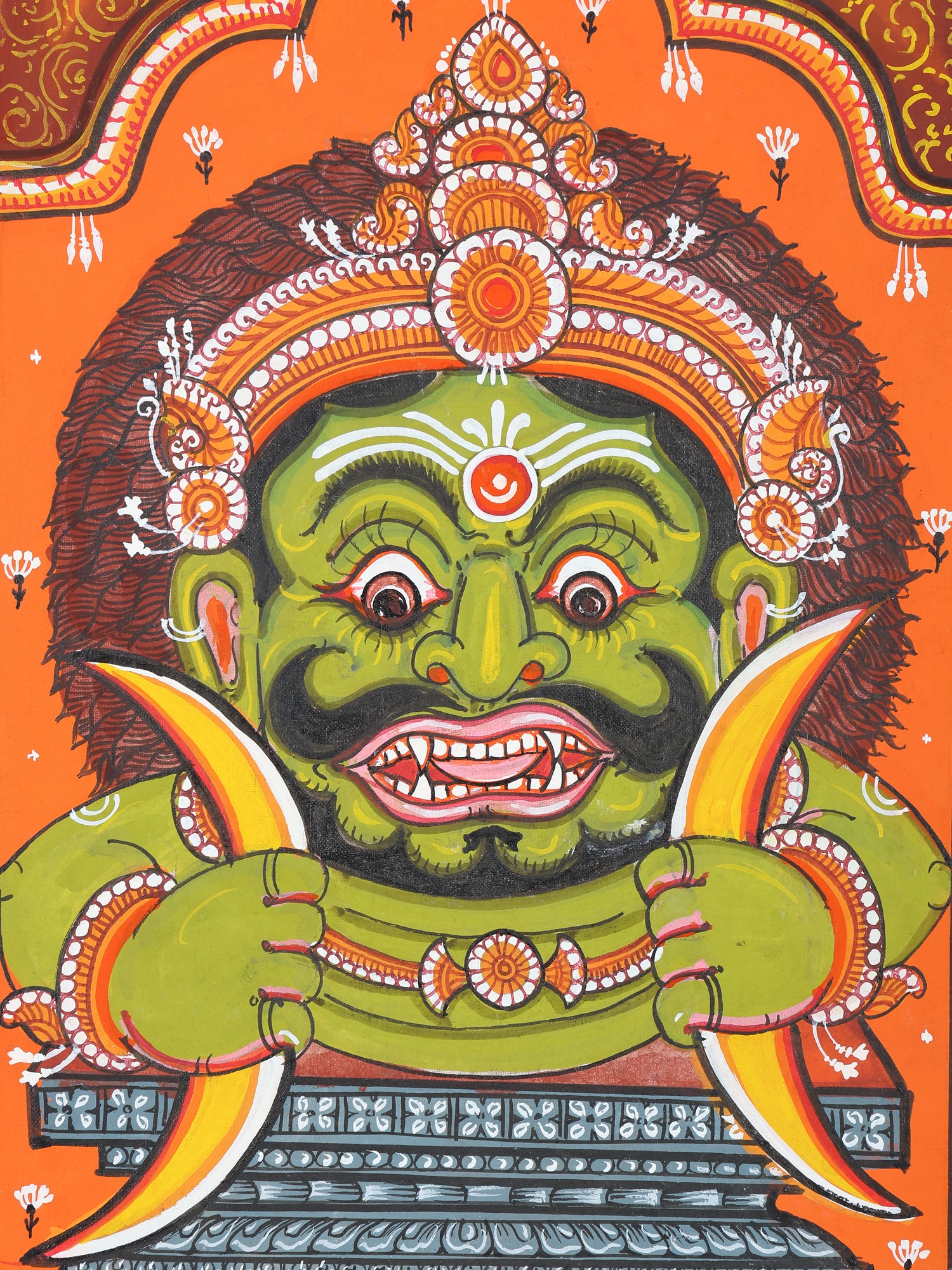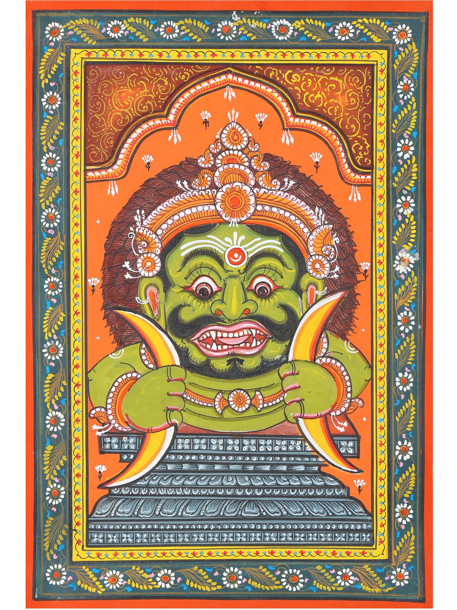 The artist now makes a double-lined border on all four sides of the canvas. The local artists are so expert in painting that they do not draw figures and motifs with pencil but directly draw them with a brush. The paint brushes that the painters use are made of the hair of domestic animals, a bunch of which is tied to the end of a bamboo stick. The figures are now painted with natural colors using the indigenous brushes. The outline is thickened with black color.