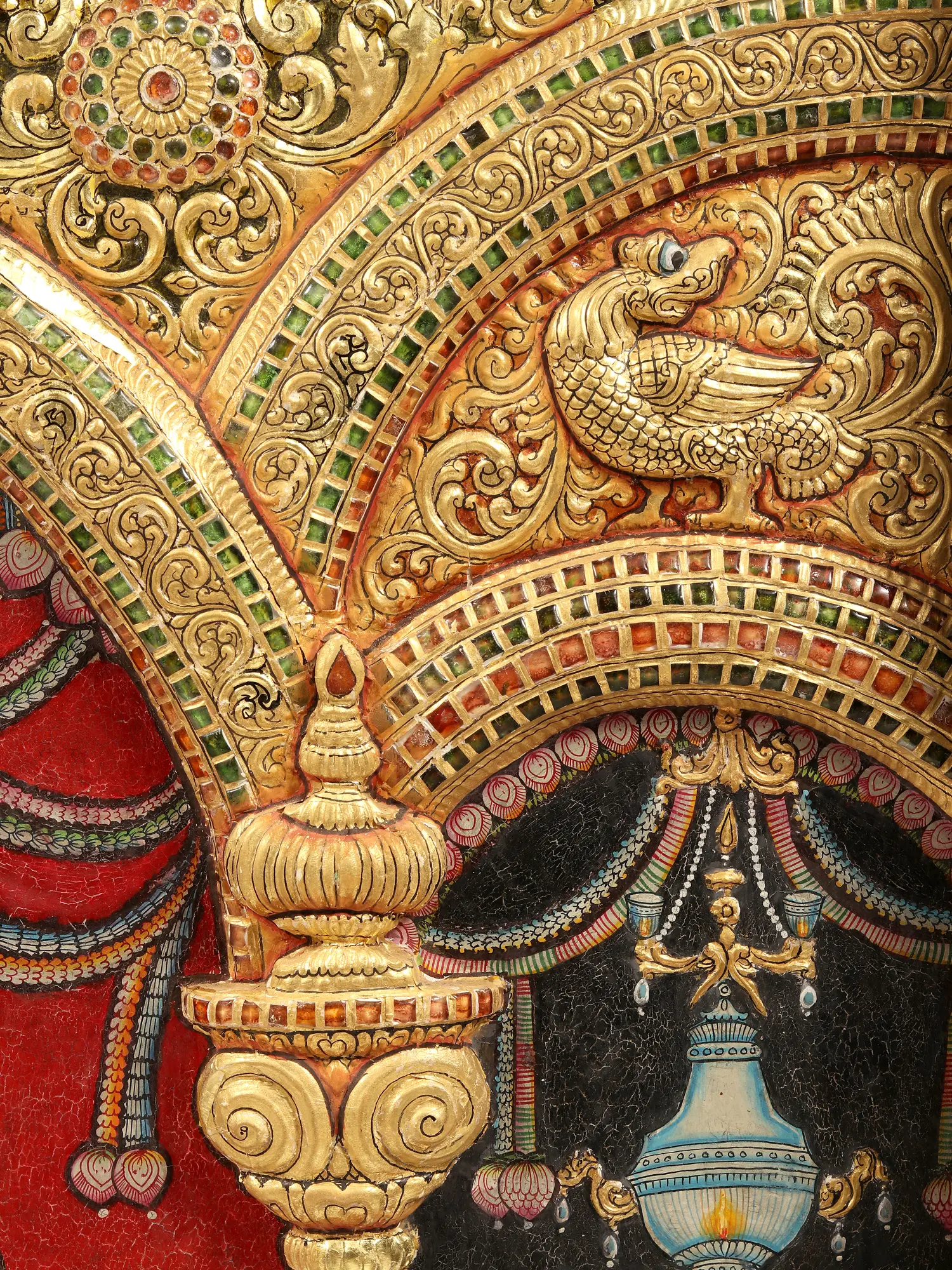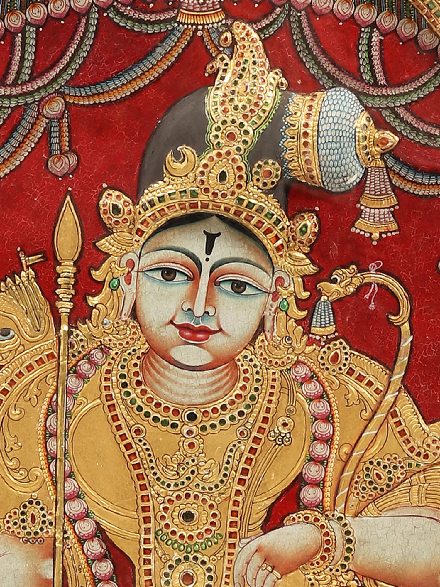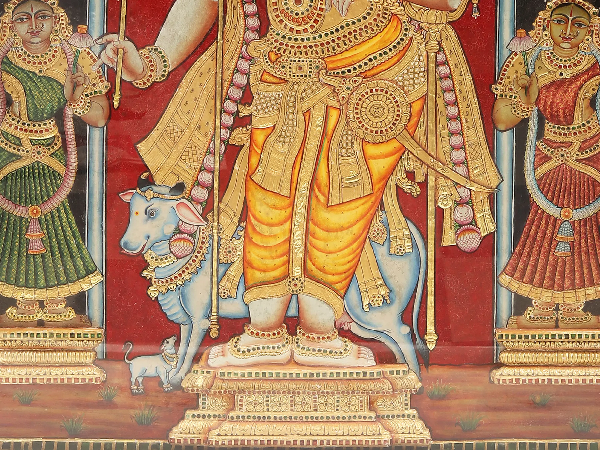 Manifesting a royal being, Krishna as Rajagopala is complemented by his twin wives- Rukmini and Satyabhama, who stand on each side, on individual platforms, holding lotus blossoms that appear as supple as their forms. Together with the two emanations of Sridevi and Bhudevi, Rajagopalaswamy in this painting is Sri Vishnu himself, the great preserver of the Universe.