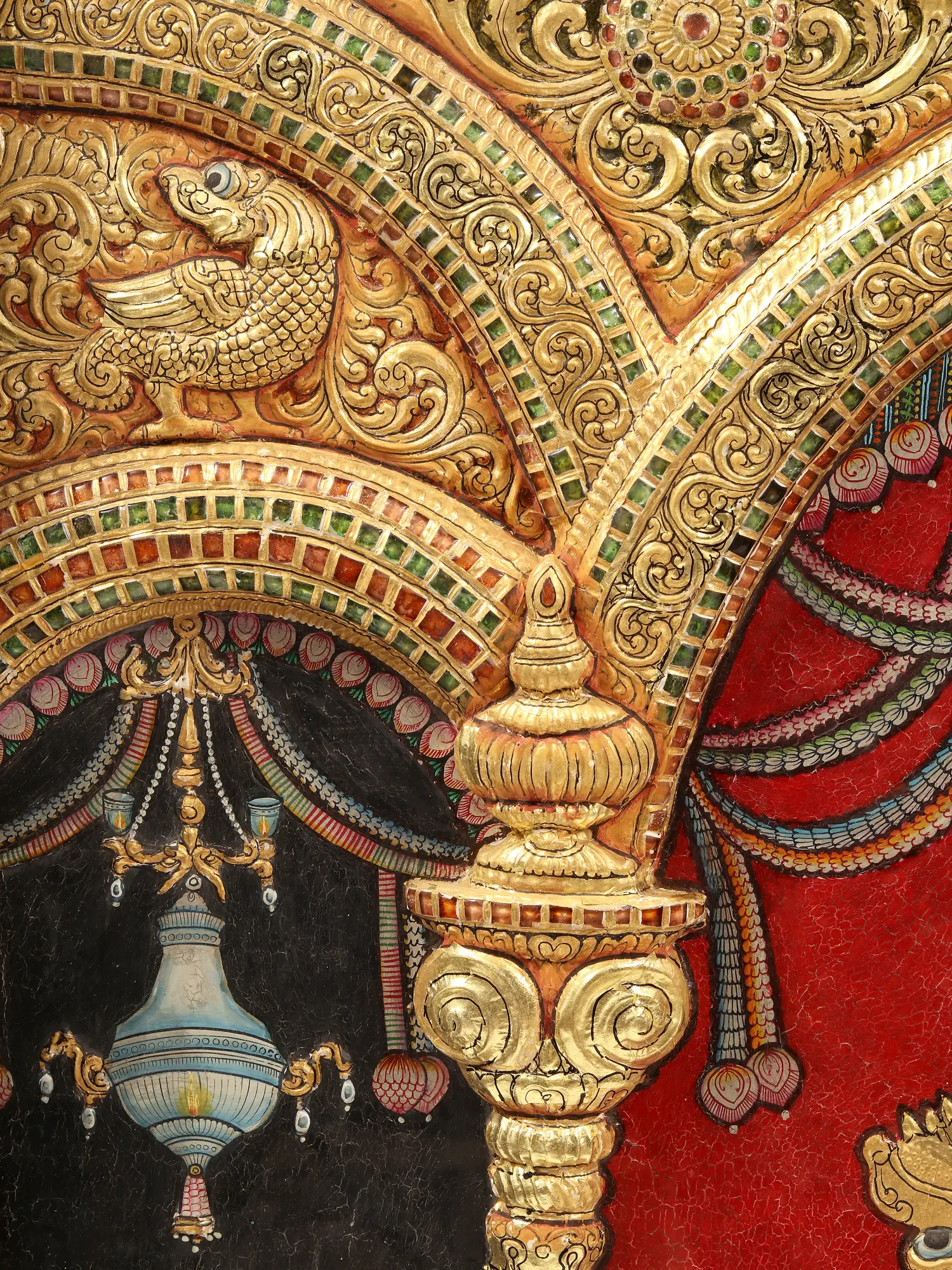 Celebrating the regalia and divinity of Krishna, in the Tamil region of India, a unique aspect of the fluting Lord is worshipped by his devotees, known as “Rajagopalaswamy”- “the royal Gopal Lord”. In this form, Sri Krishna appears as a young, alluring being, standing in a pleasant posture, holding Dhanush (bow), bana (arrow), and his murli. This four-feet Tanjore painting depicts the sanctum of Rajagopalaswamy, who stands on a golden pedestal, attired beautifully in yellow clothes, ornaments, and a splendid hairdo. His Gau mata (cow) stands behind him, ornamented and accompanied by her calf, creating a lovely imagery of maternal affection on the canvas.